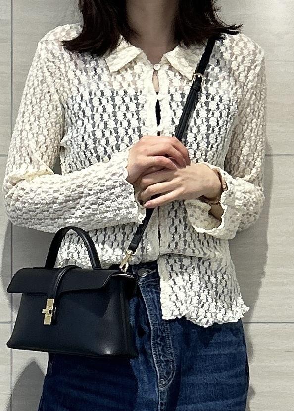 二つ折り手のひらサイズのお財布と除菌ウェットティッシュとiPhone、ハンカチとリップとAirPodsなど必要最低限しっかり入ります! -
