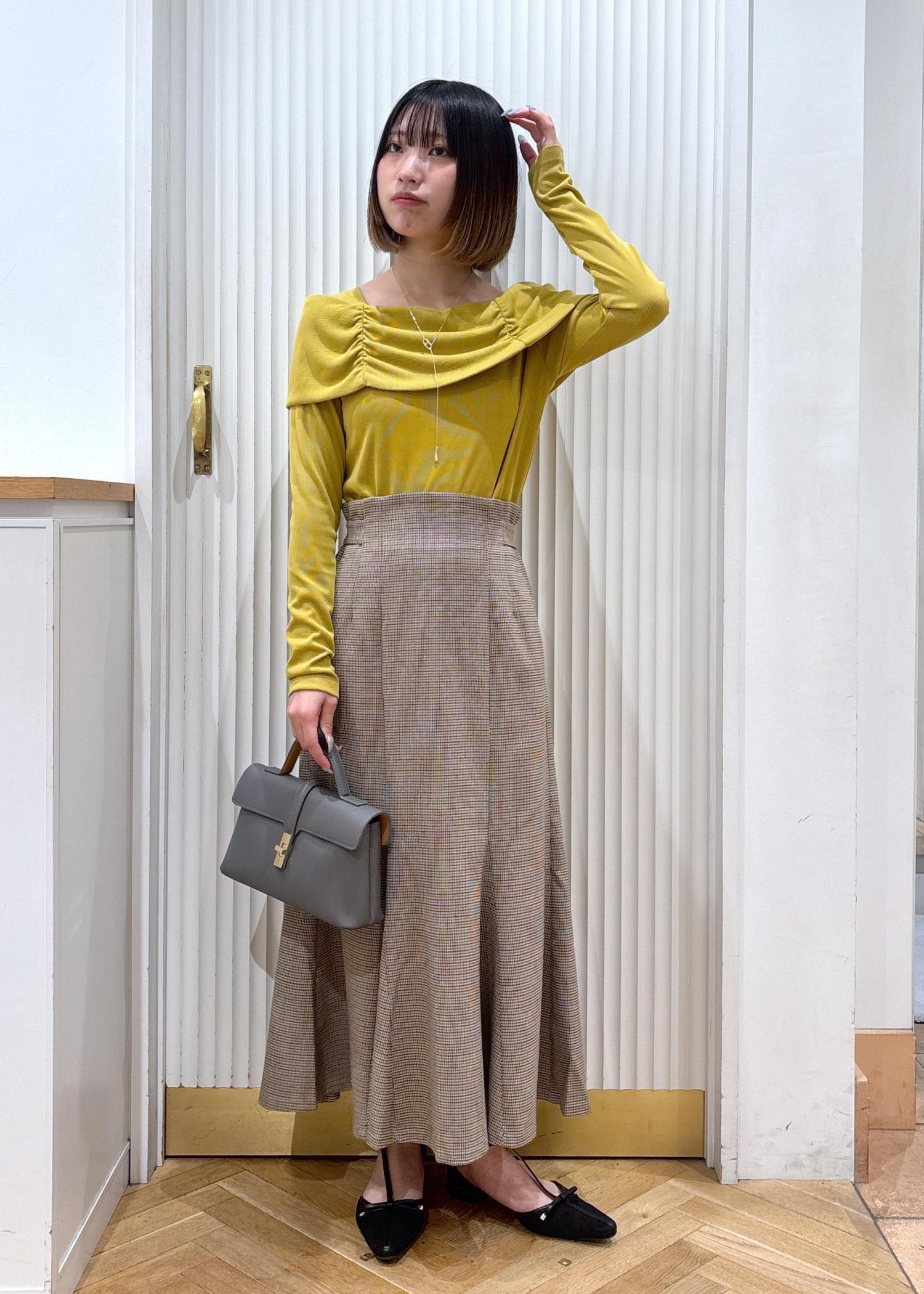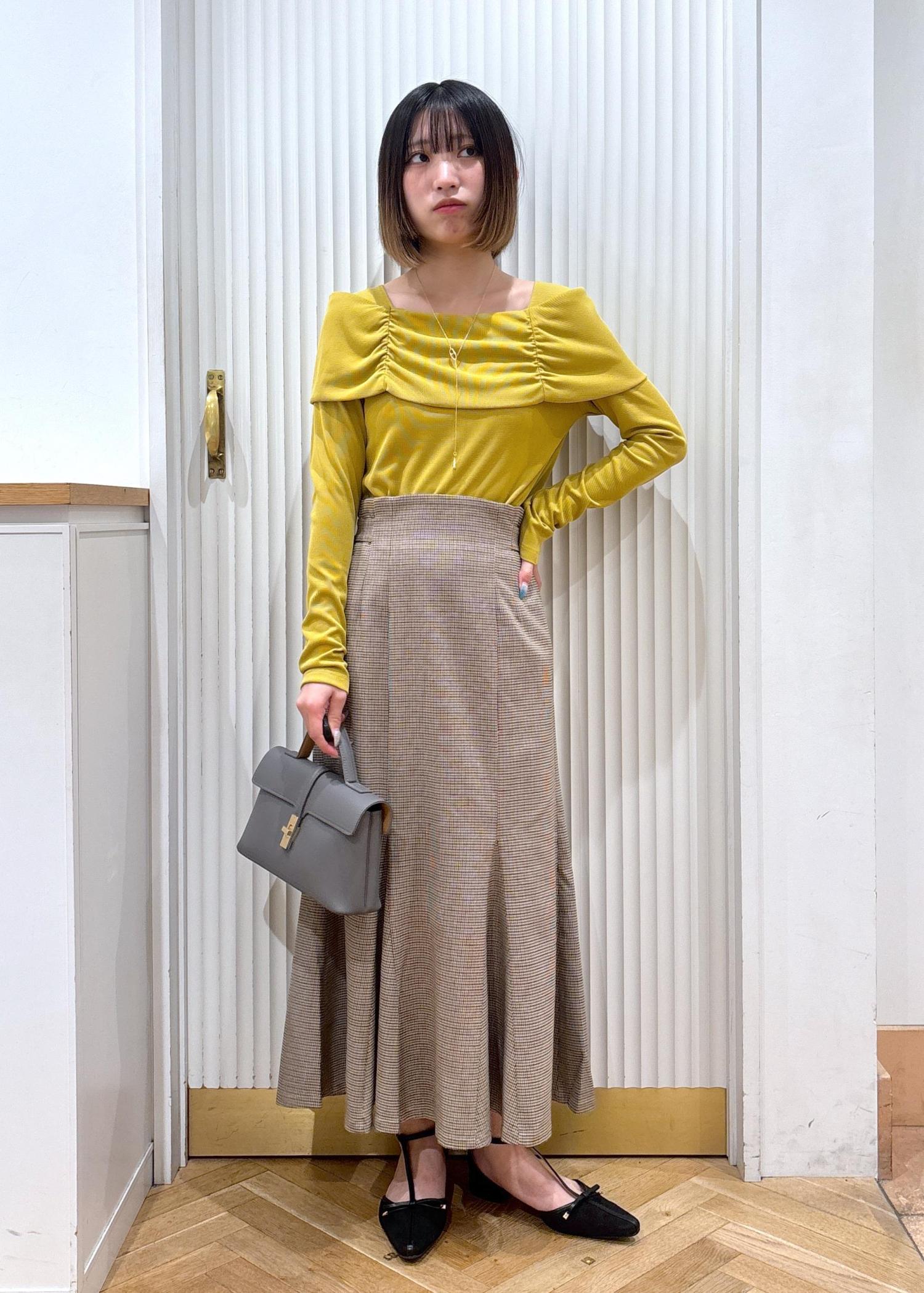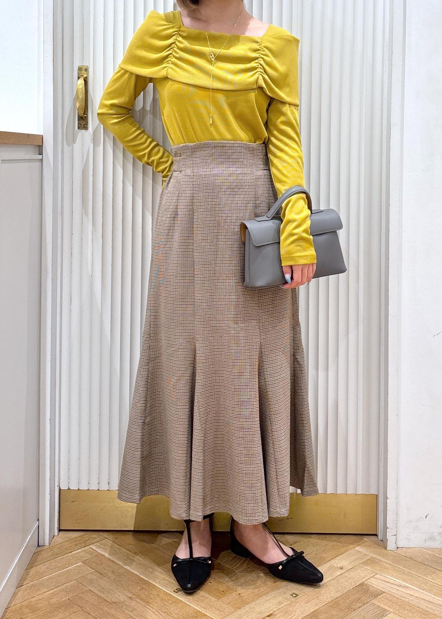 暗めのイエローにチェックを合わせた秋カラー沢山のコーディネートです。ハイウエストのマーメイドスカートなので全体的に体のシルエットが綺麗に見えるコーディネートです。足元に黒を持ってくることでコーデが締まり重みが下に出るため色味のバランスがよく見えます!