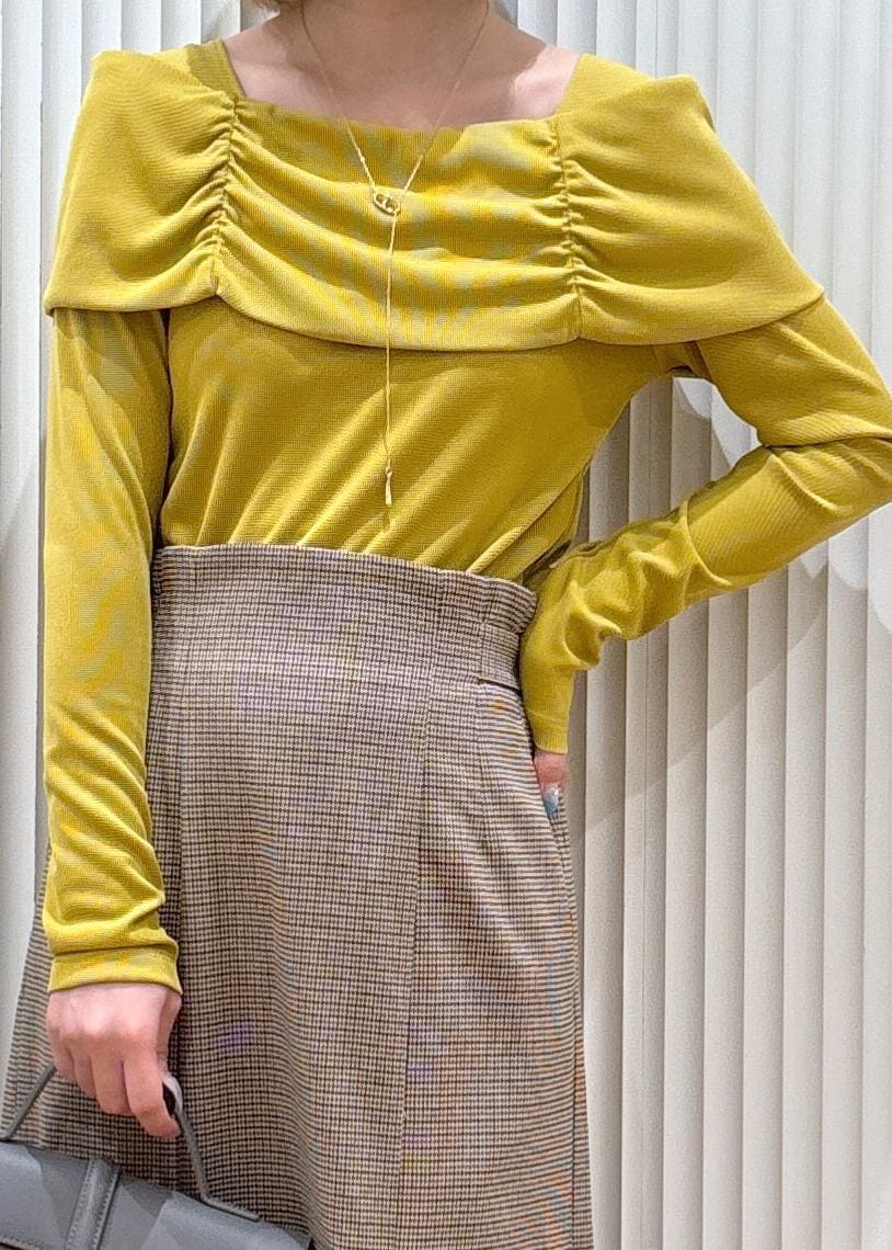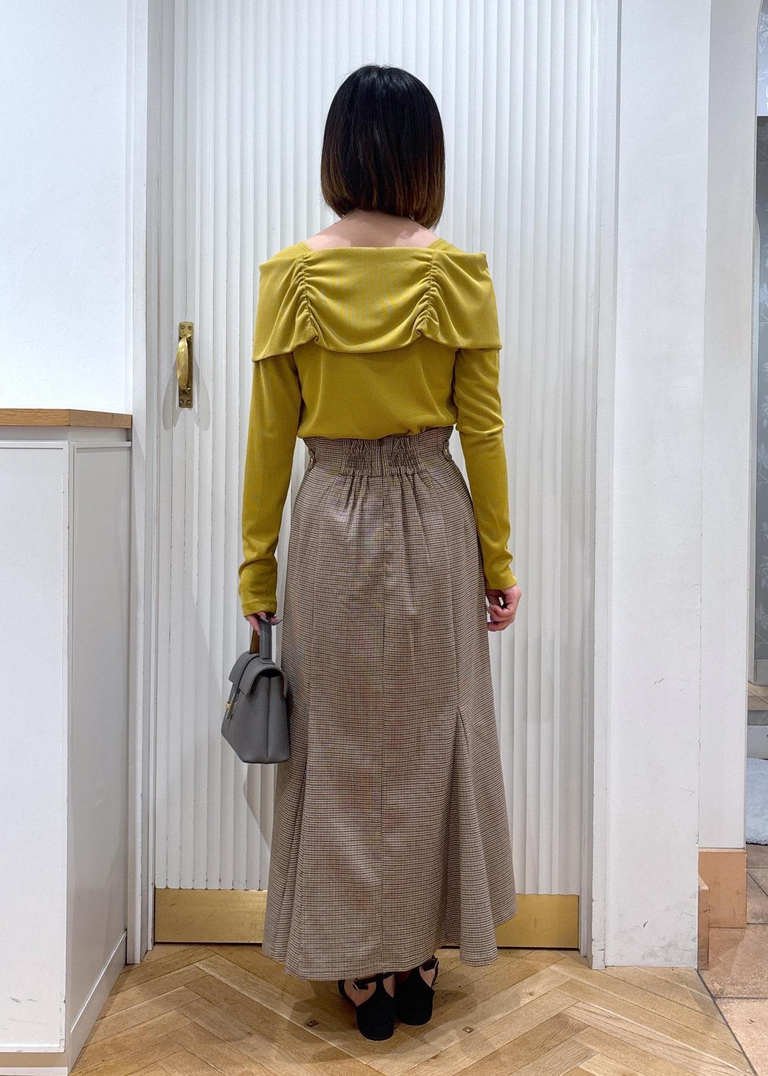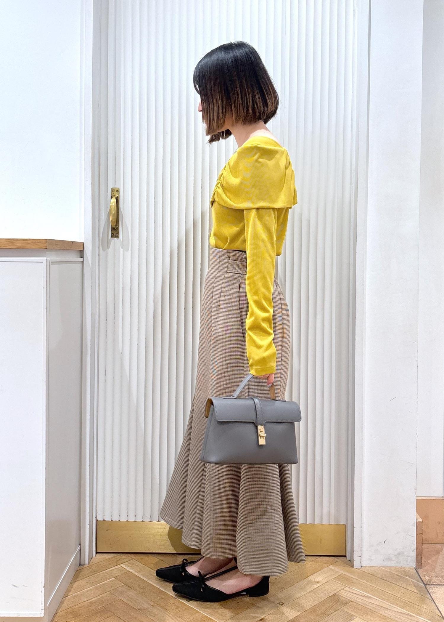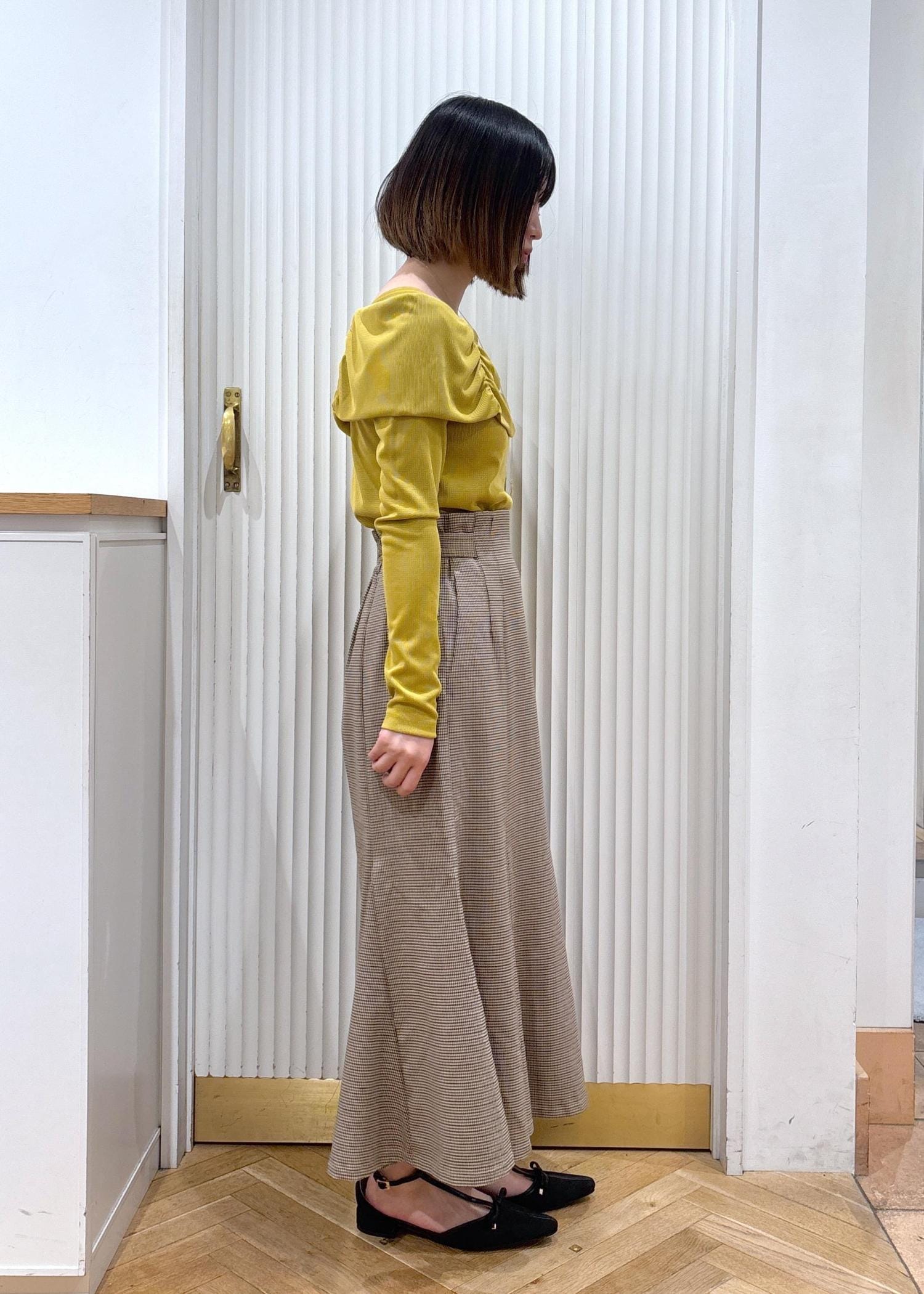 暗めのイエローにチェックを合わせた秋カラー沢山のコーディネートです。ハイウエストのマーメイドスカートなので全体的に体のシルエットが綺麗に見えるコーディネートです。足元に黒を持ってくることでコーデが締まり重みが下に出るため色味のバランスがよく見えます!