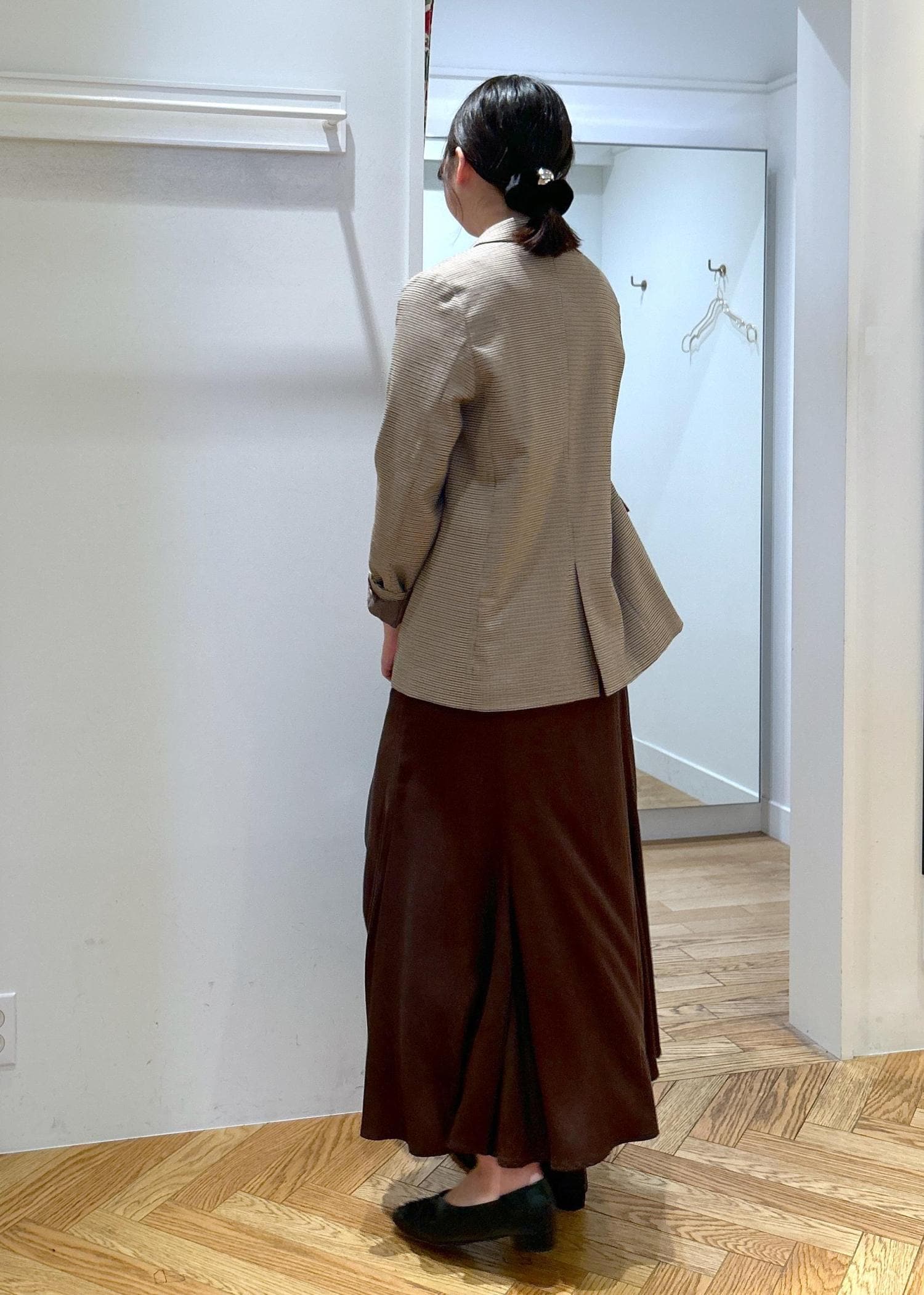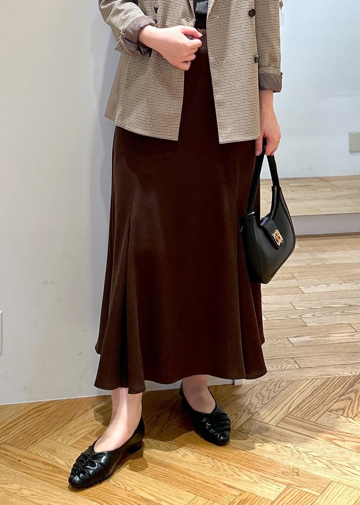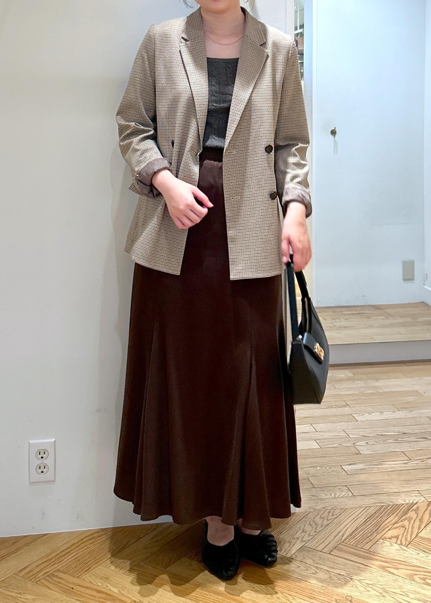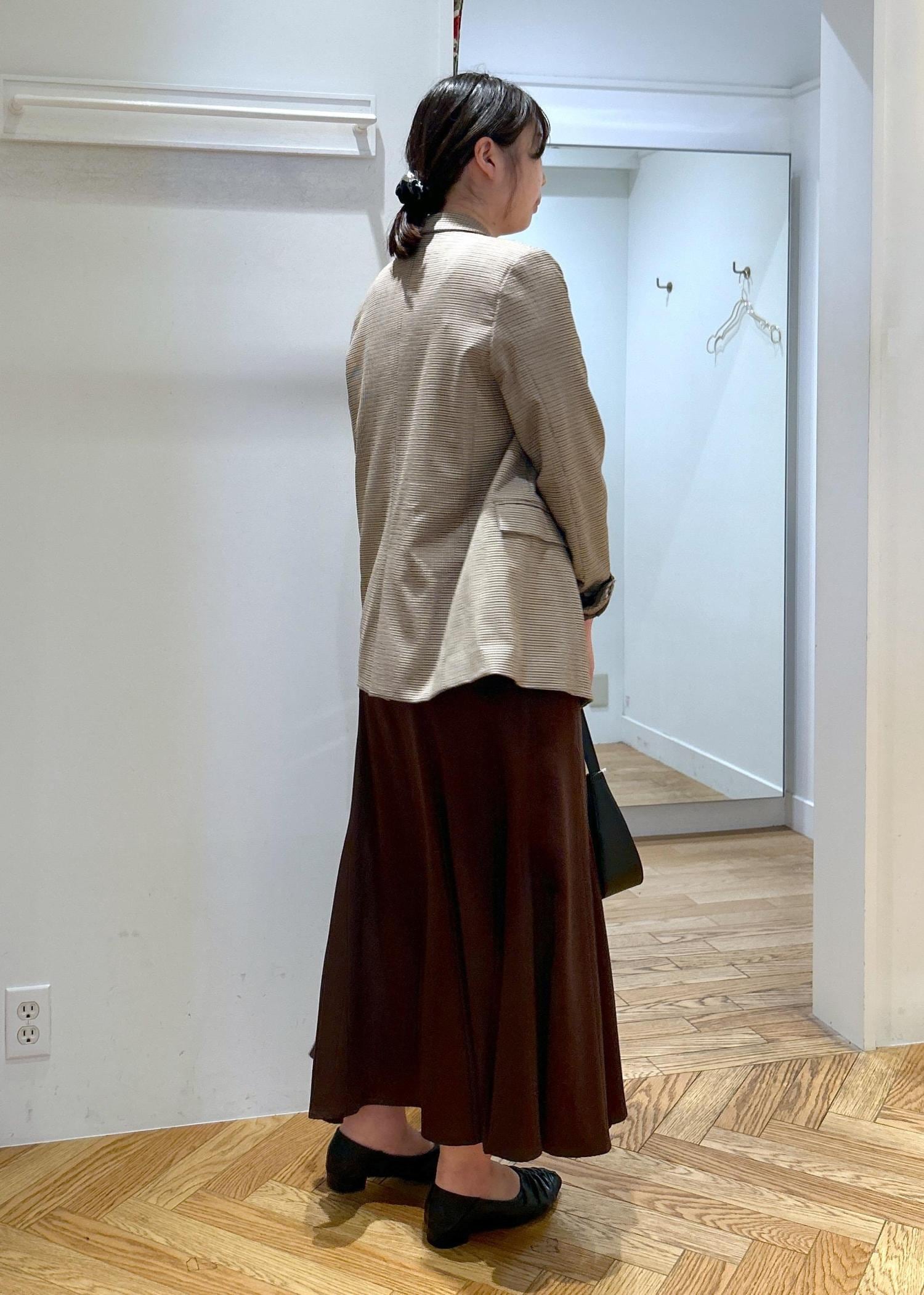 ジャケットをスカート合わせで女性らしい雰囲気に。