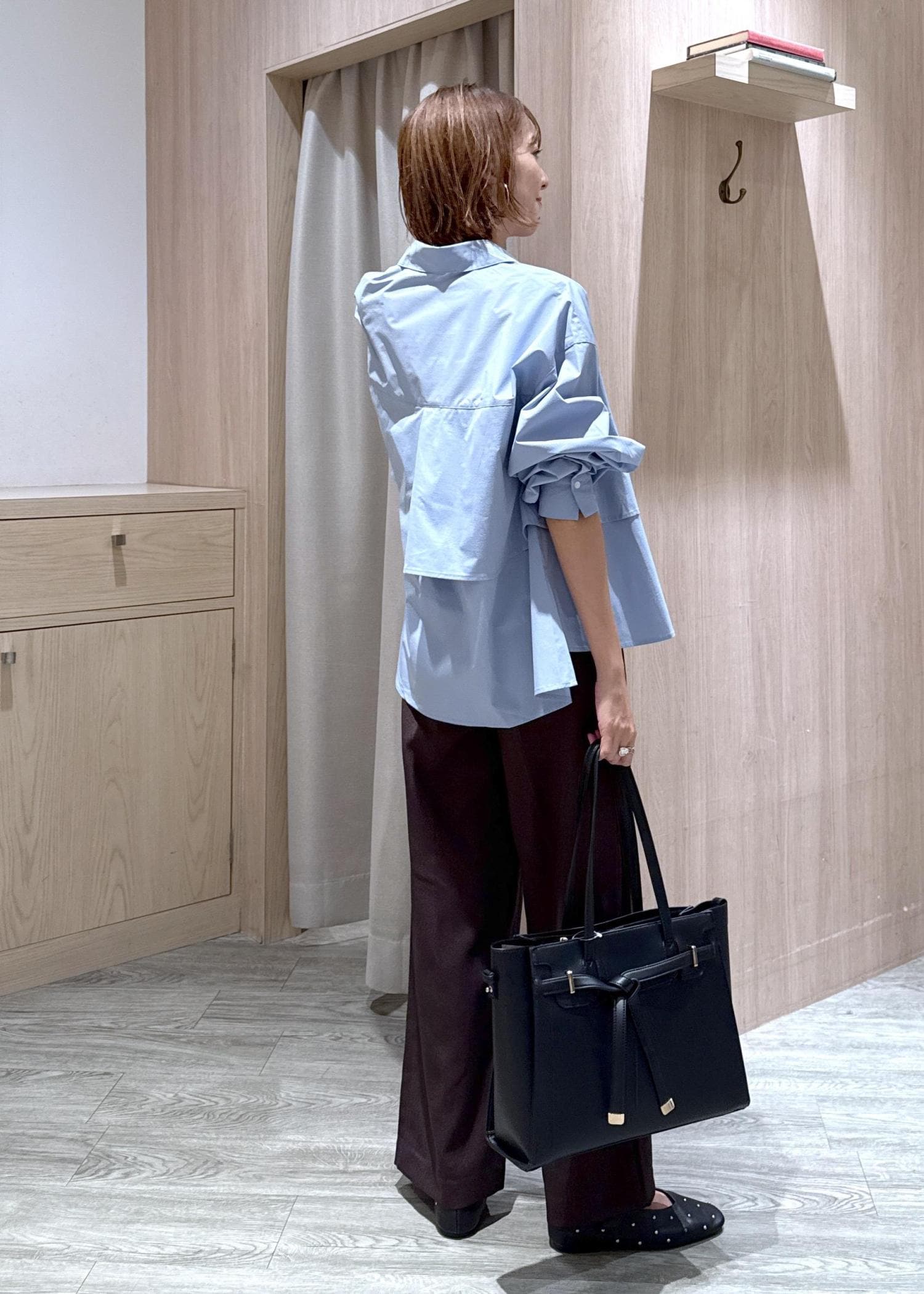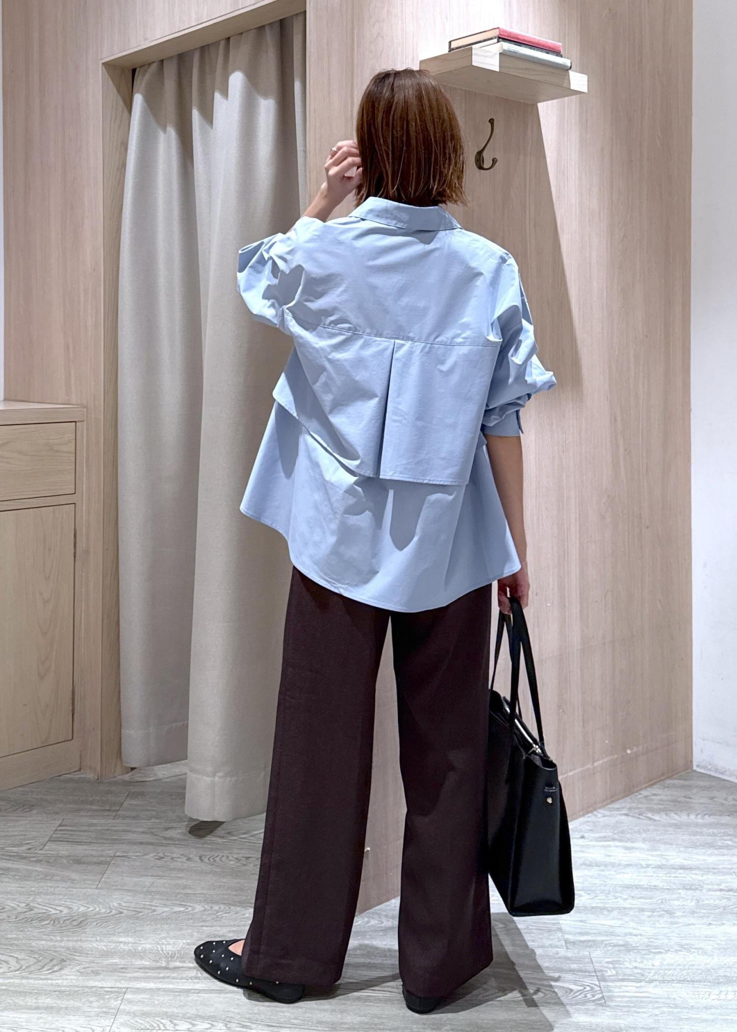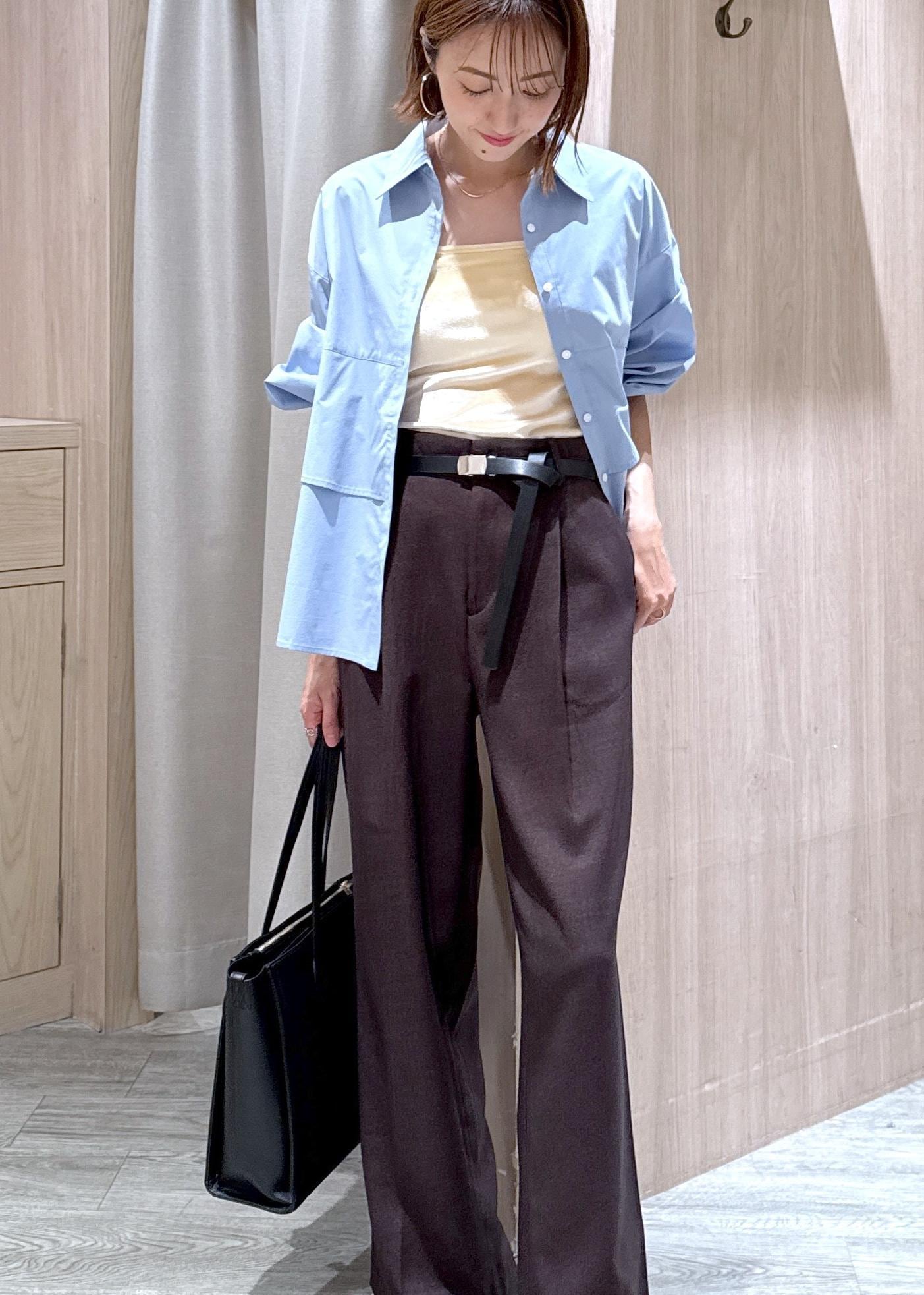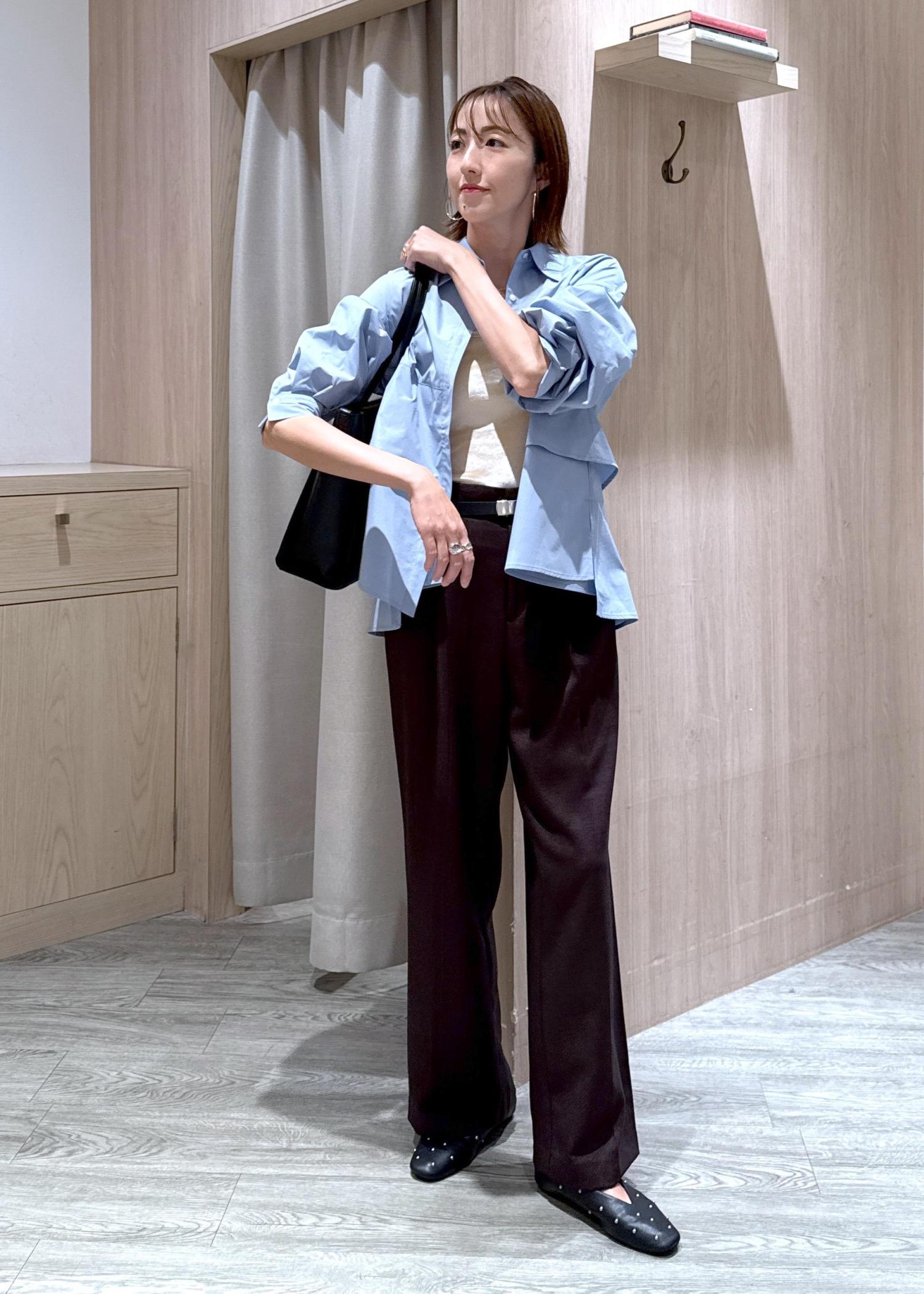 白シャツだときちんとしすぎなので、敢えてブルー×ブラウンでトレンドカラーコーデにしました♪