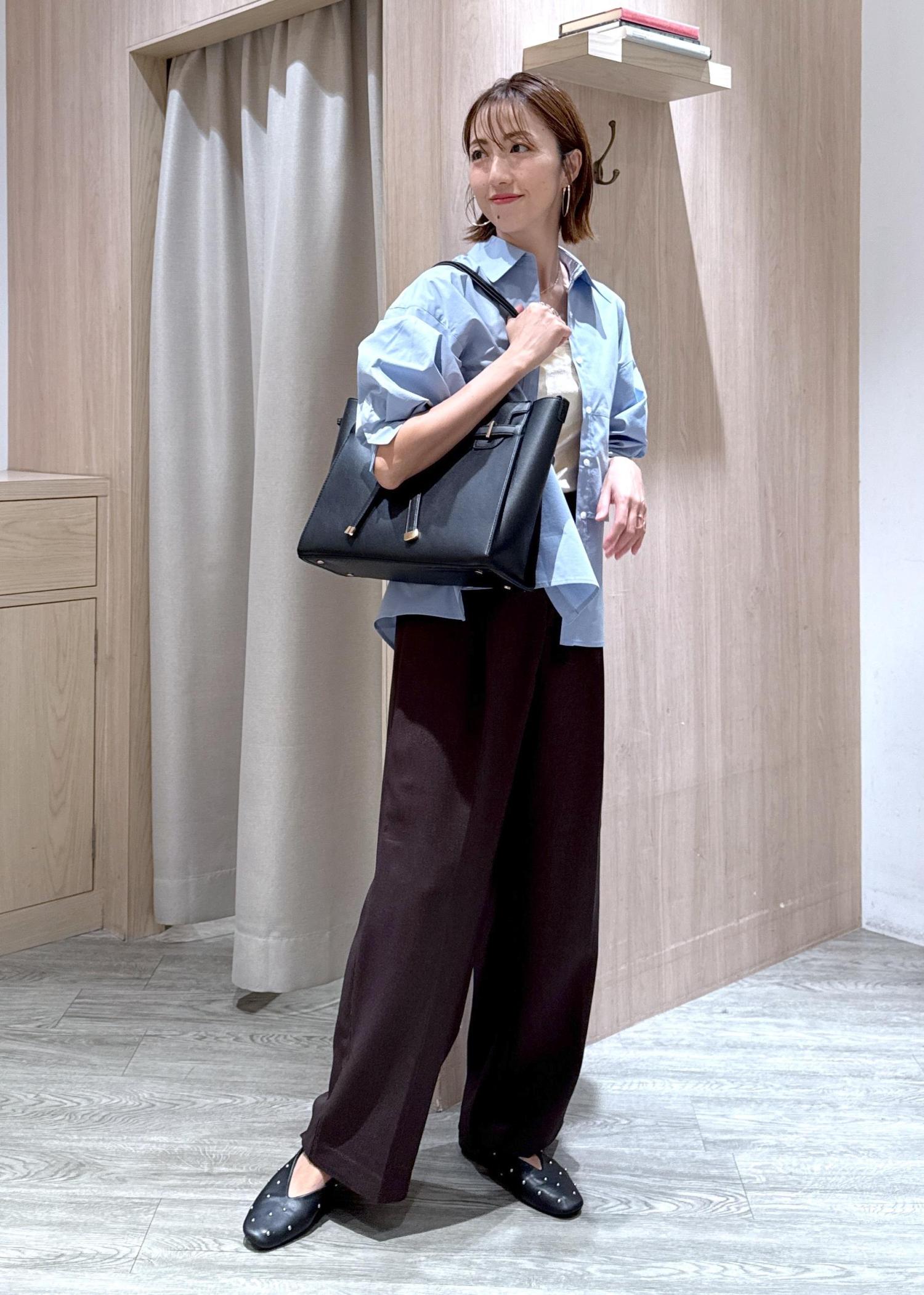 パソコンがすっぽり入る大きめバッグで、会議や研修の日の通勤コーデにしました。