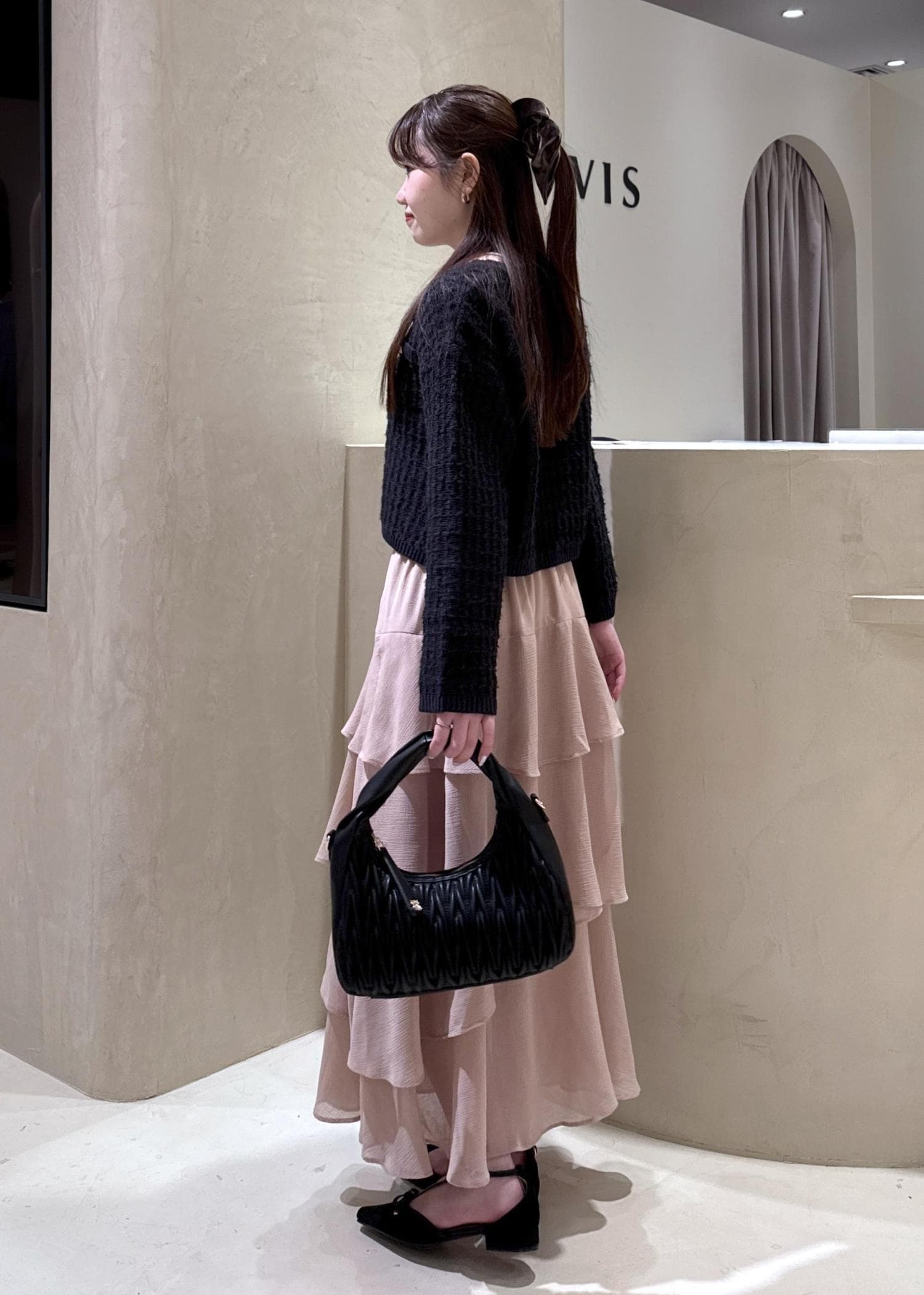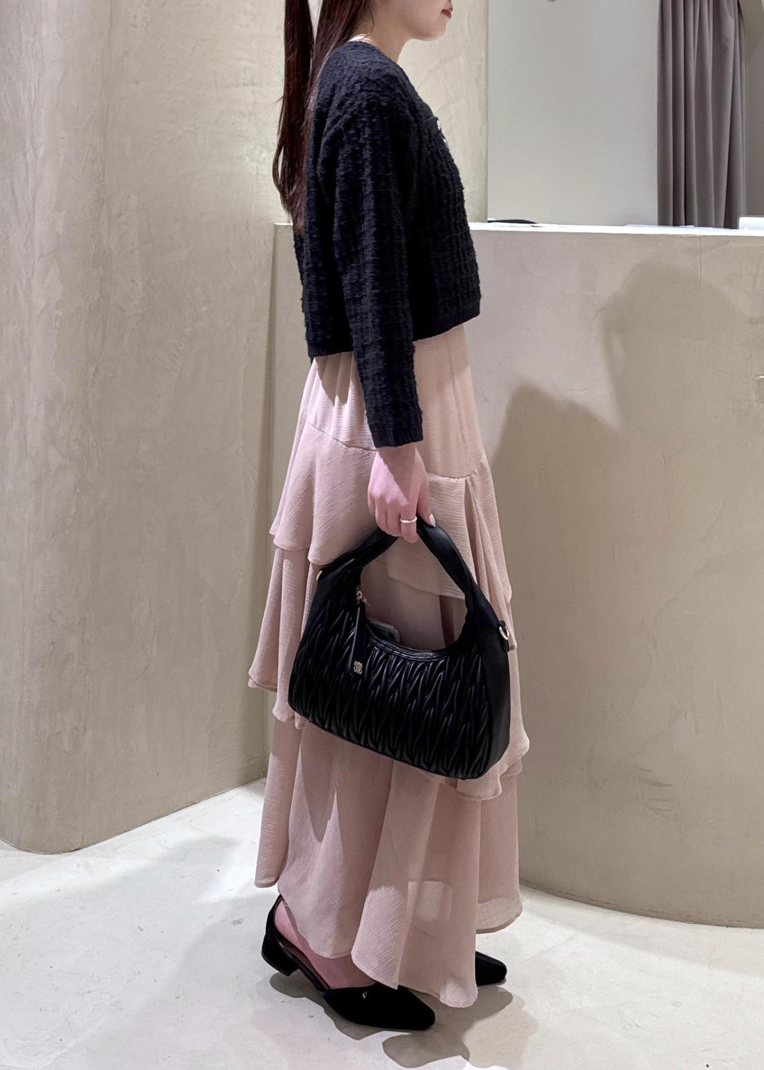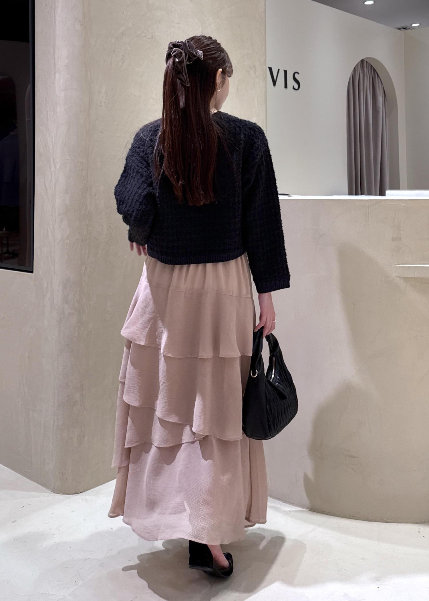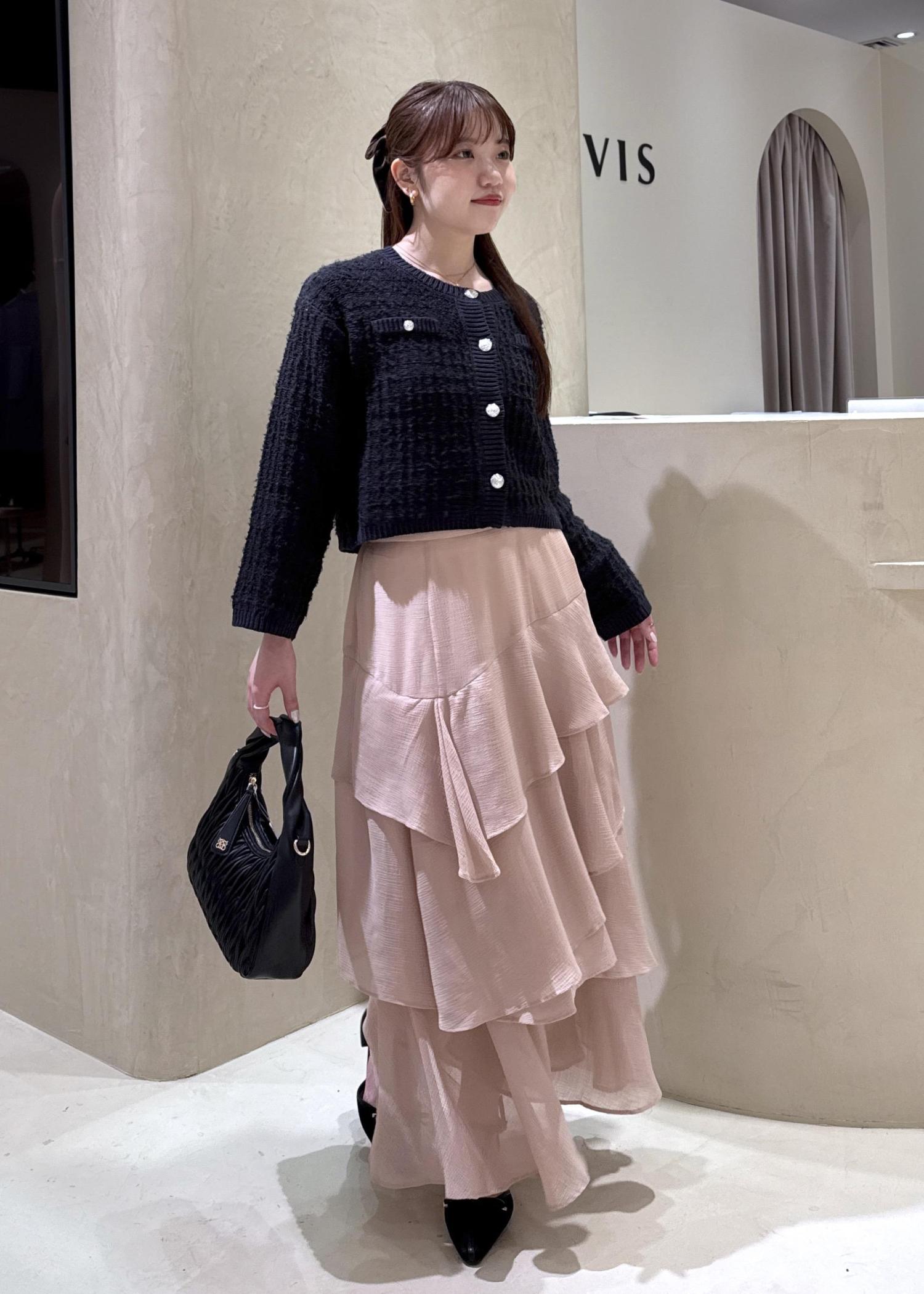 秋冬らしいツイード素材のカーディガンは、着映え間違い無し◎ ティアードスカートと合わせて、ピンクとネイビーの合わせが甘すぎず程良くデートにぴったりなコーデです♡