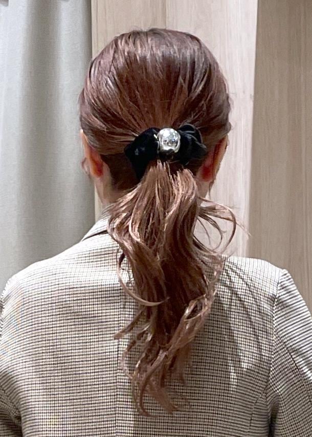 ベロア素材のシュシュでコーデに取り入れると秋っぽくなるアイテムです!