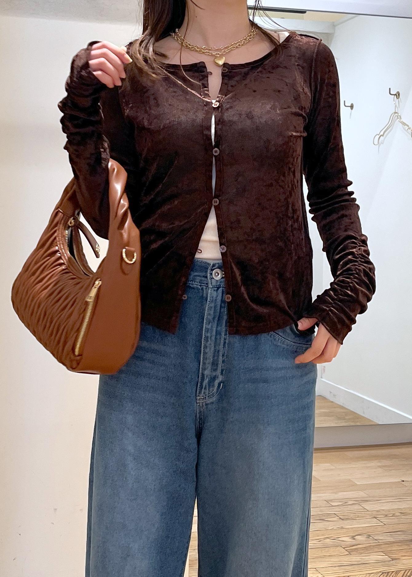 VIS【2WAY】花柄&無地アソート袖シャーリングベロアカーディガンダークブラウン / F¥3,951レビューサイズは全体的にぴったりめなので一枚でも重ね着のインナーとしても使えます。