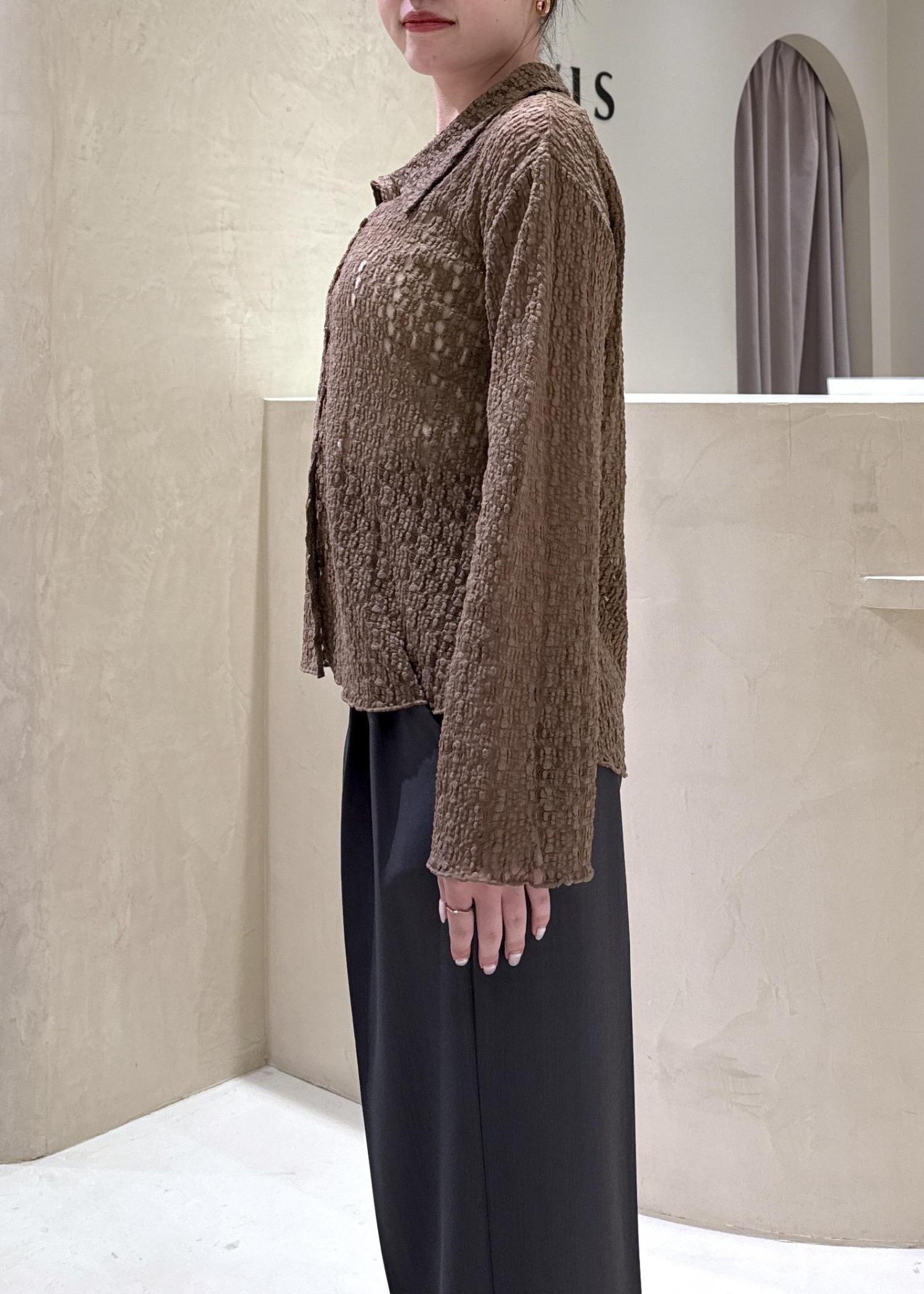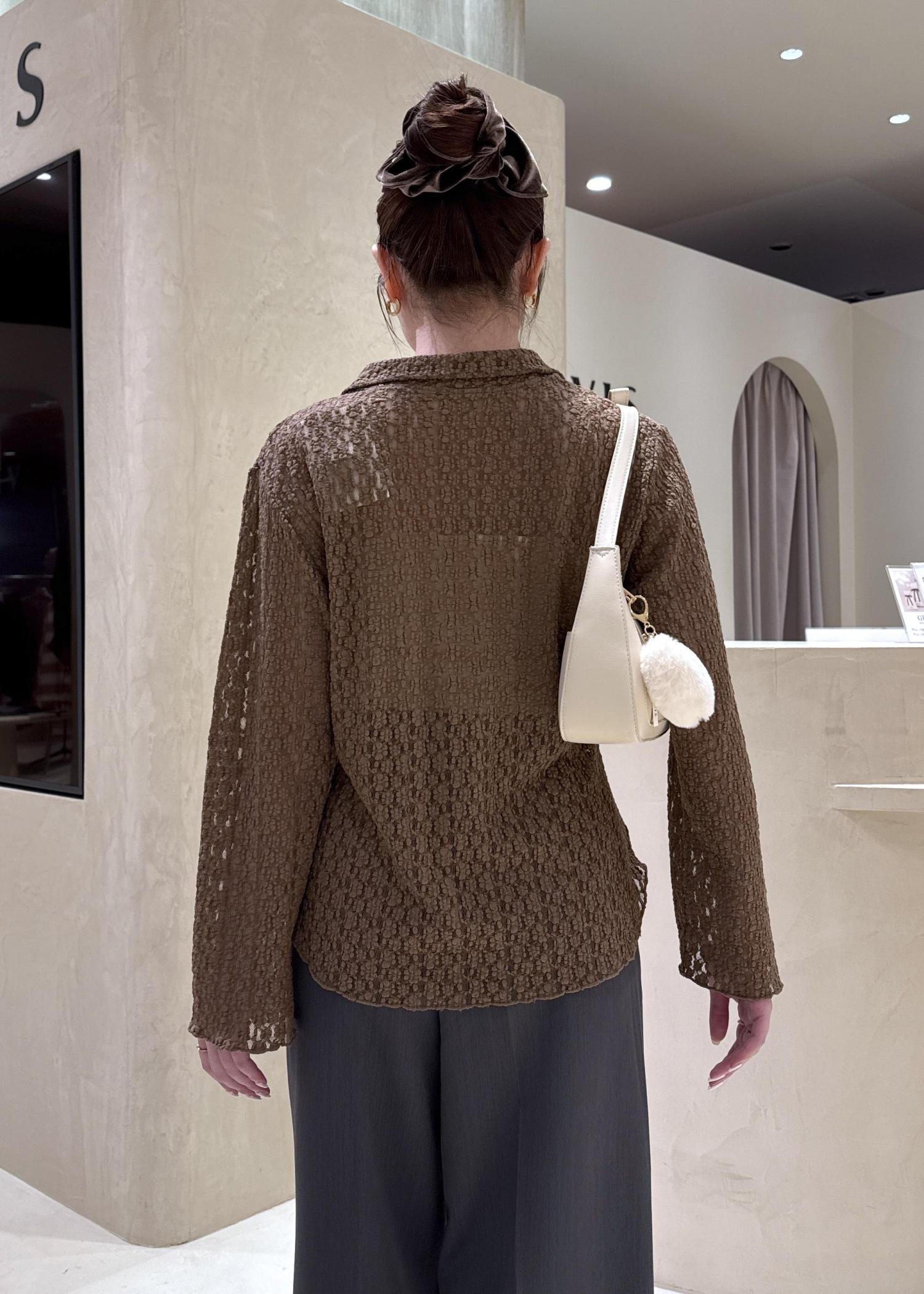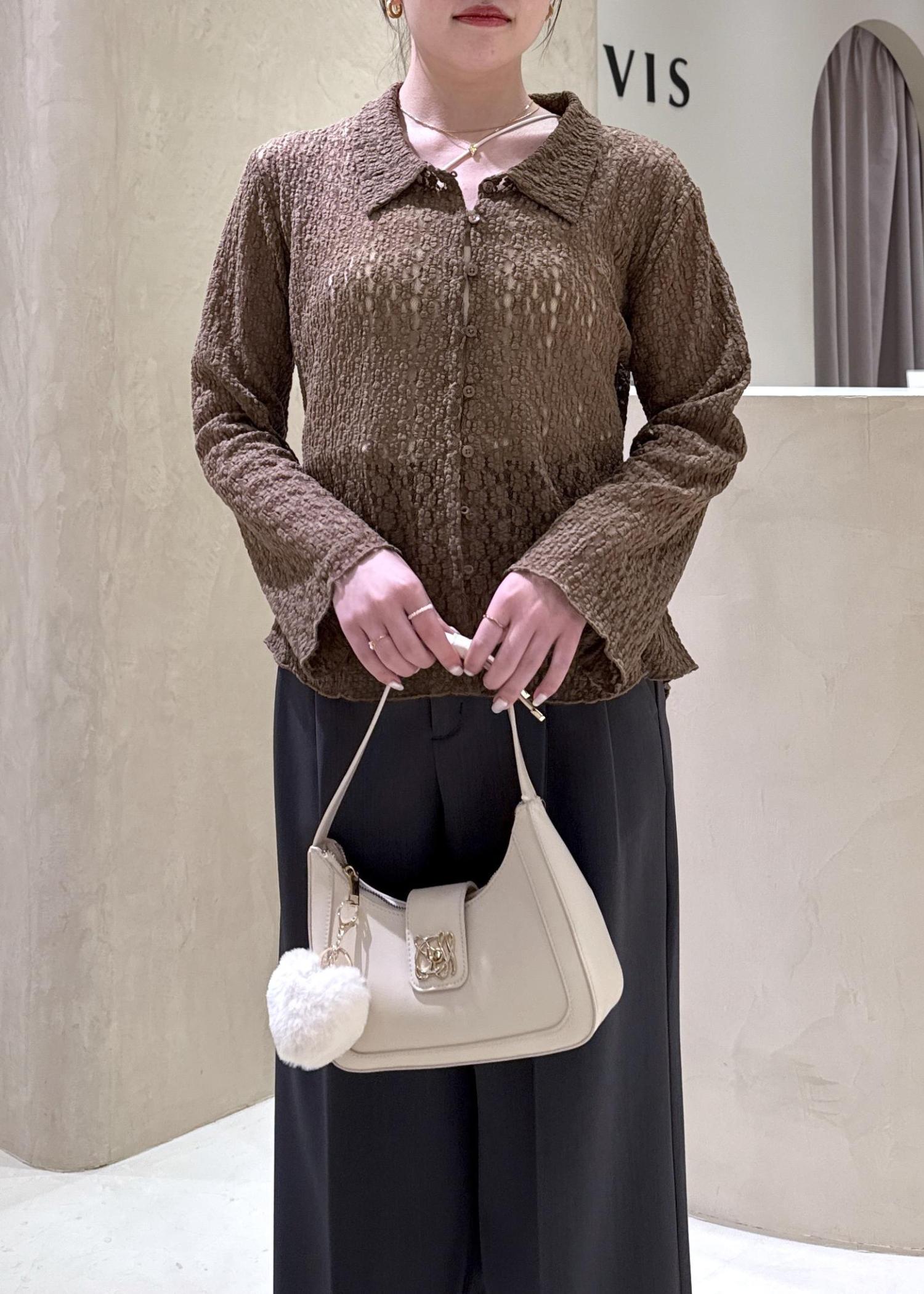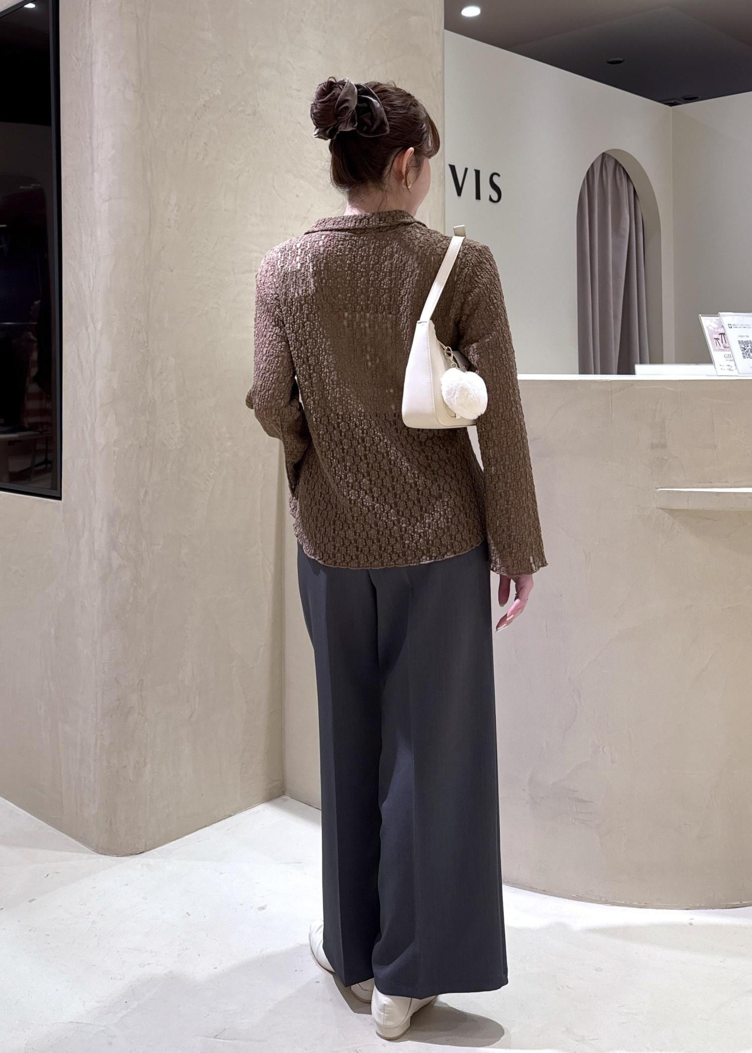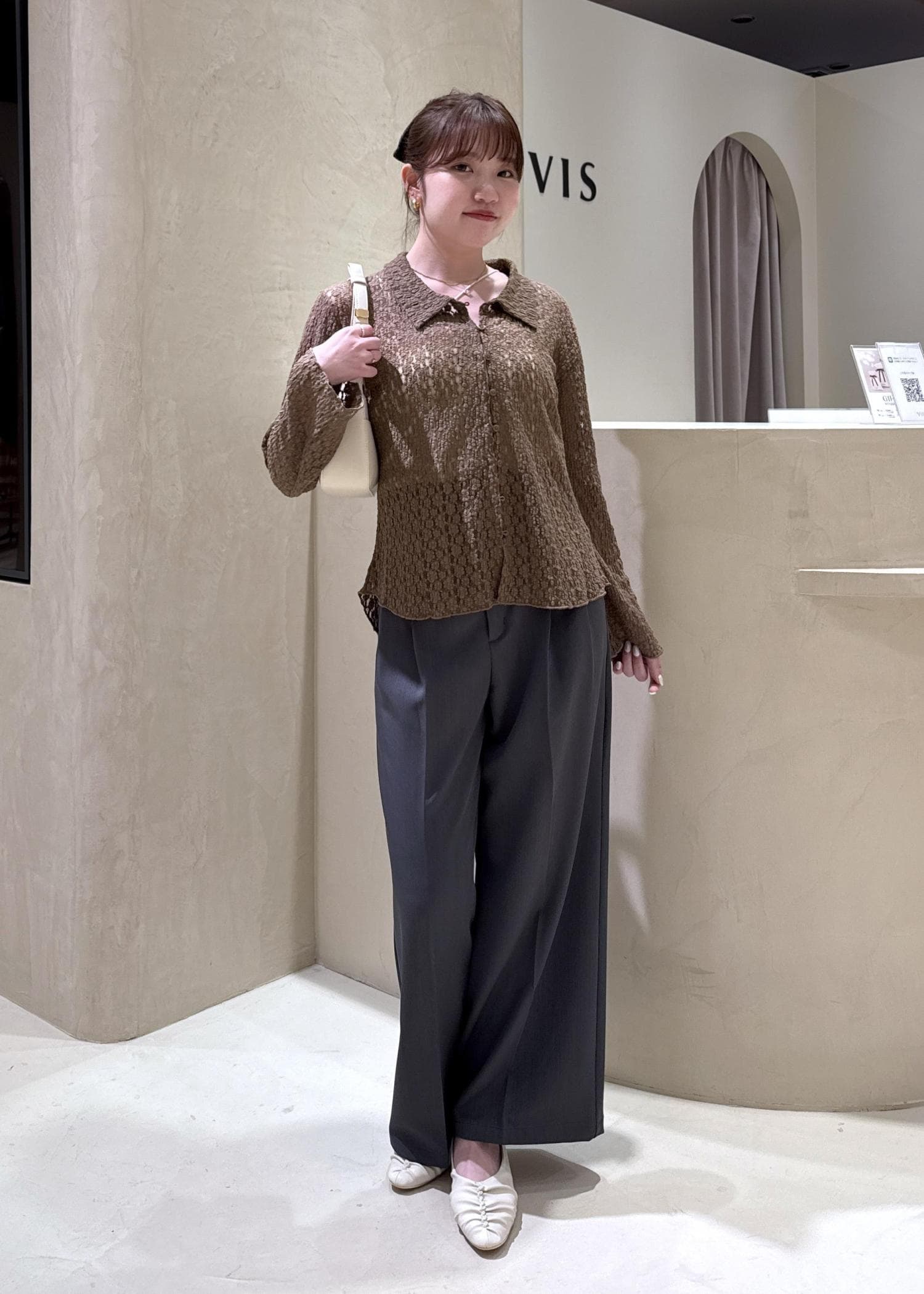 華やかな秋らしいブラウンカラーのレースカーディガンをポイントに、女性らしさをプラスした程良い抜け感のあるコーデに!