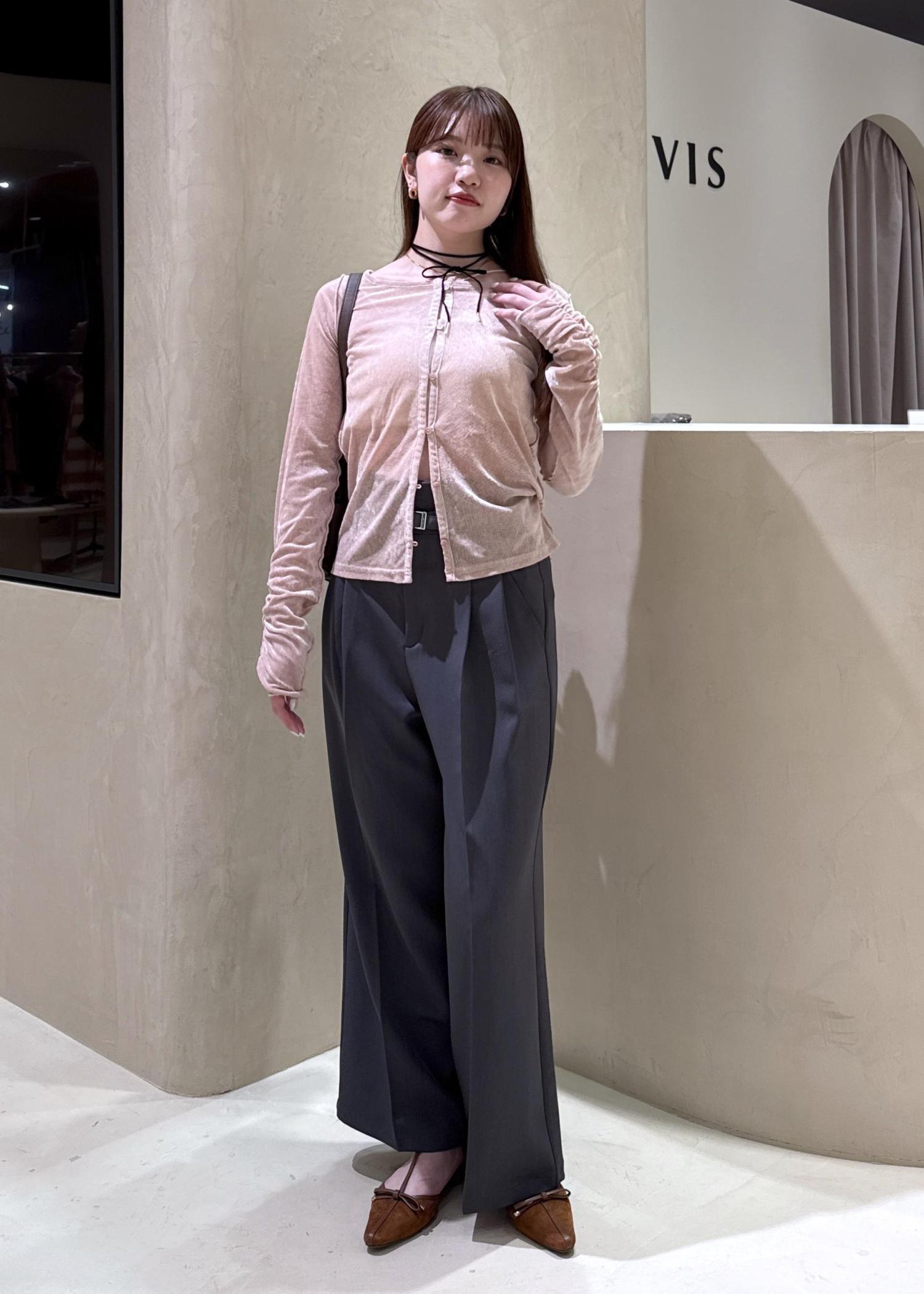 今季トレンド!目を引くベロア素材のピンクカーディガンをメインに、カジュアルなお出かけパンツスタイル!