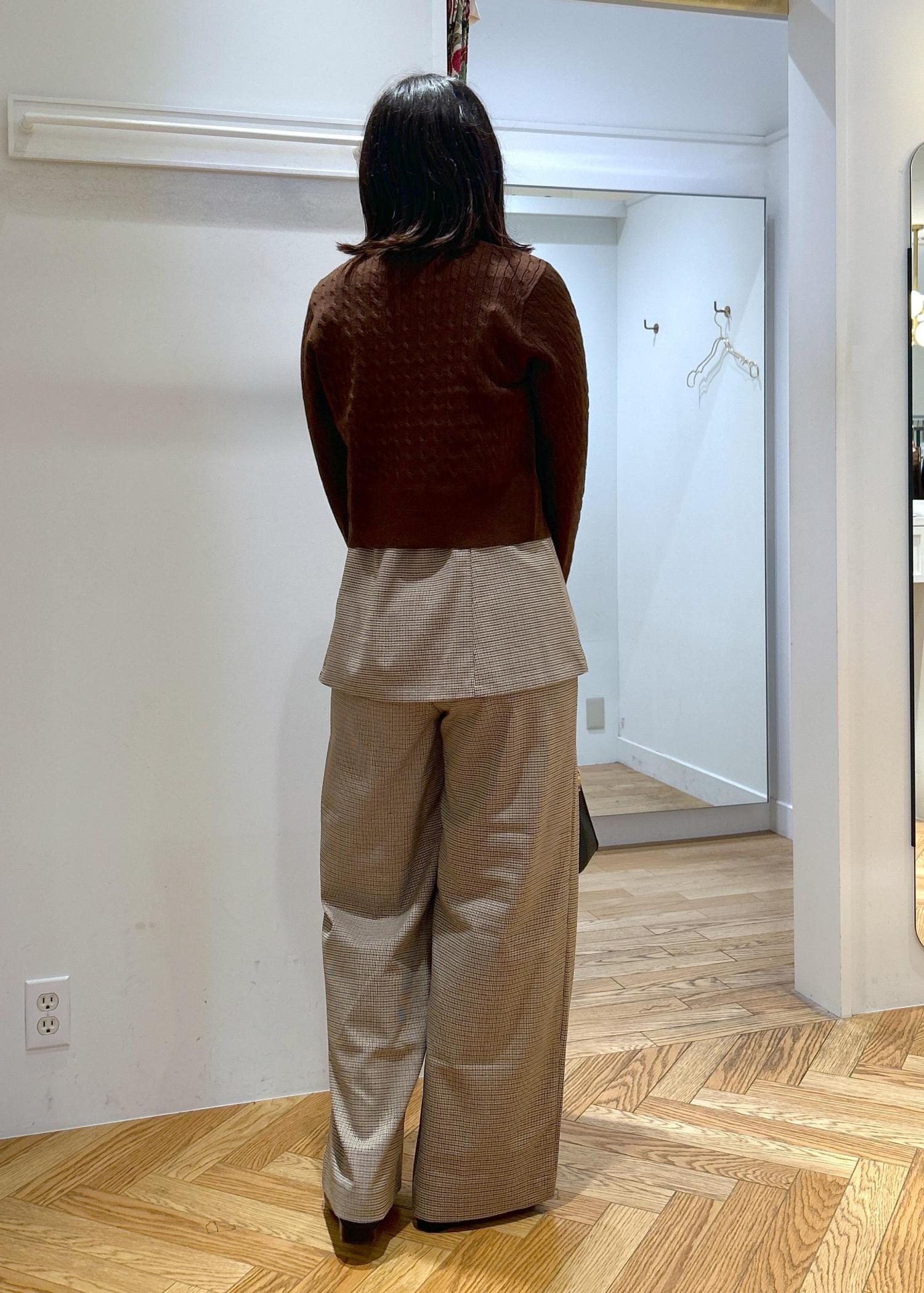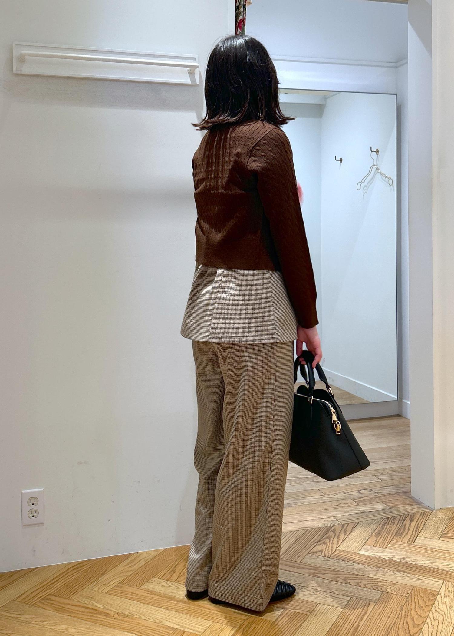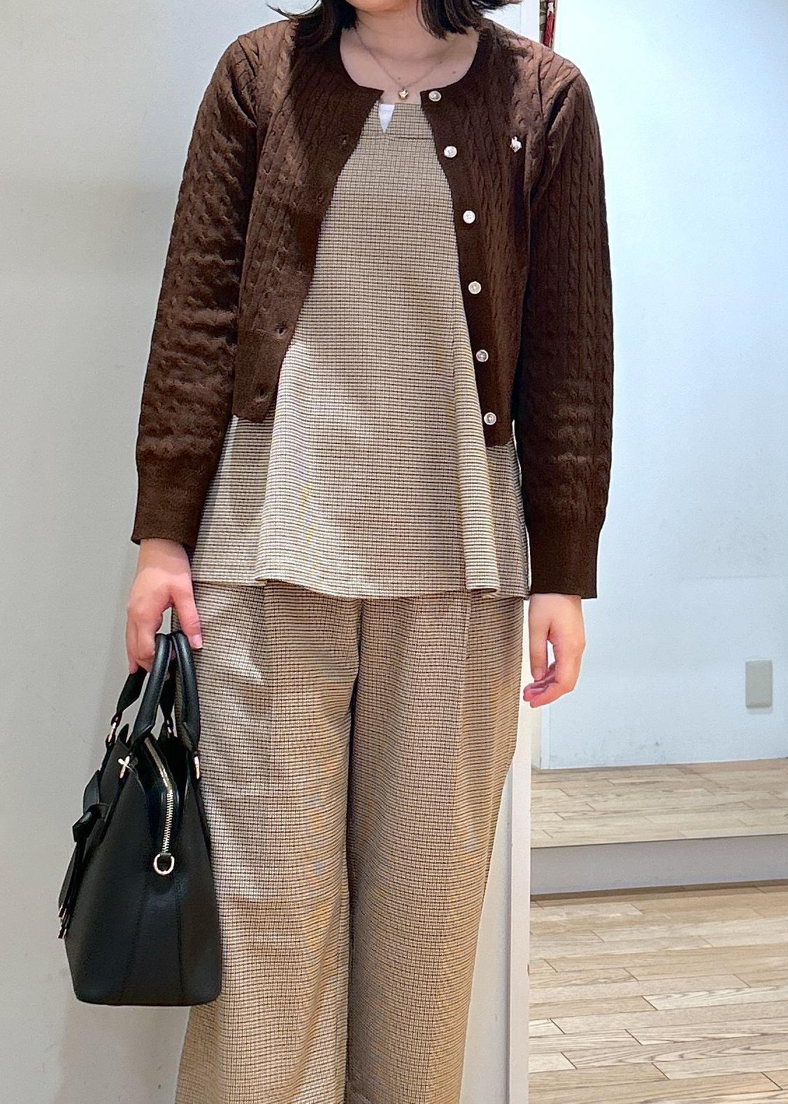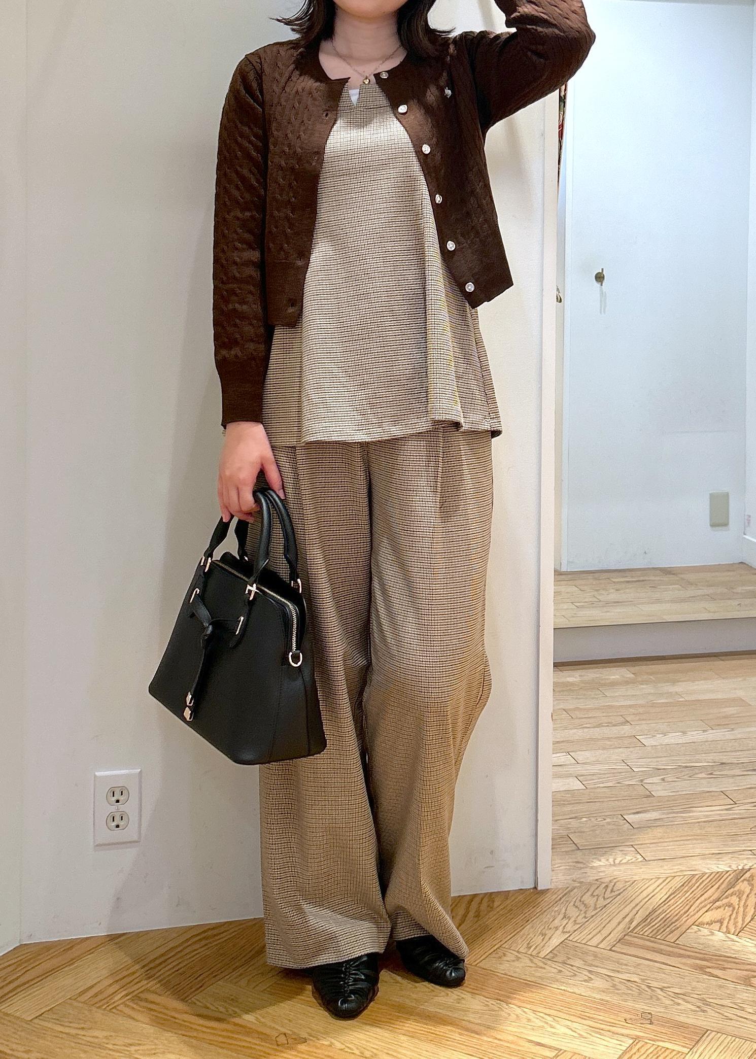 千鳥柄の上下で一気に秋らしい雰囲気に。カーディガンもブラウンカラーで全体的なトーンもまとめました♡