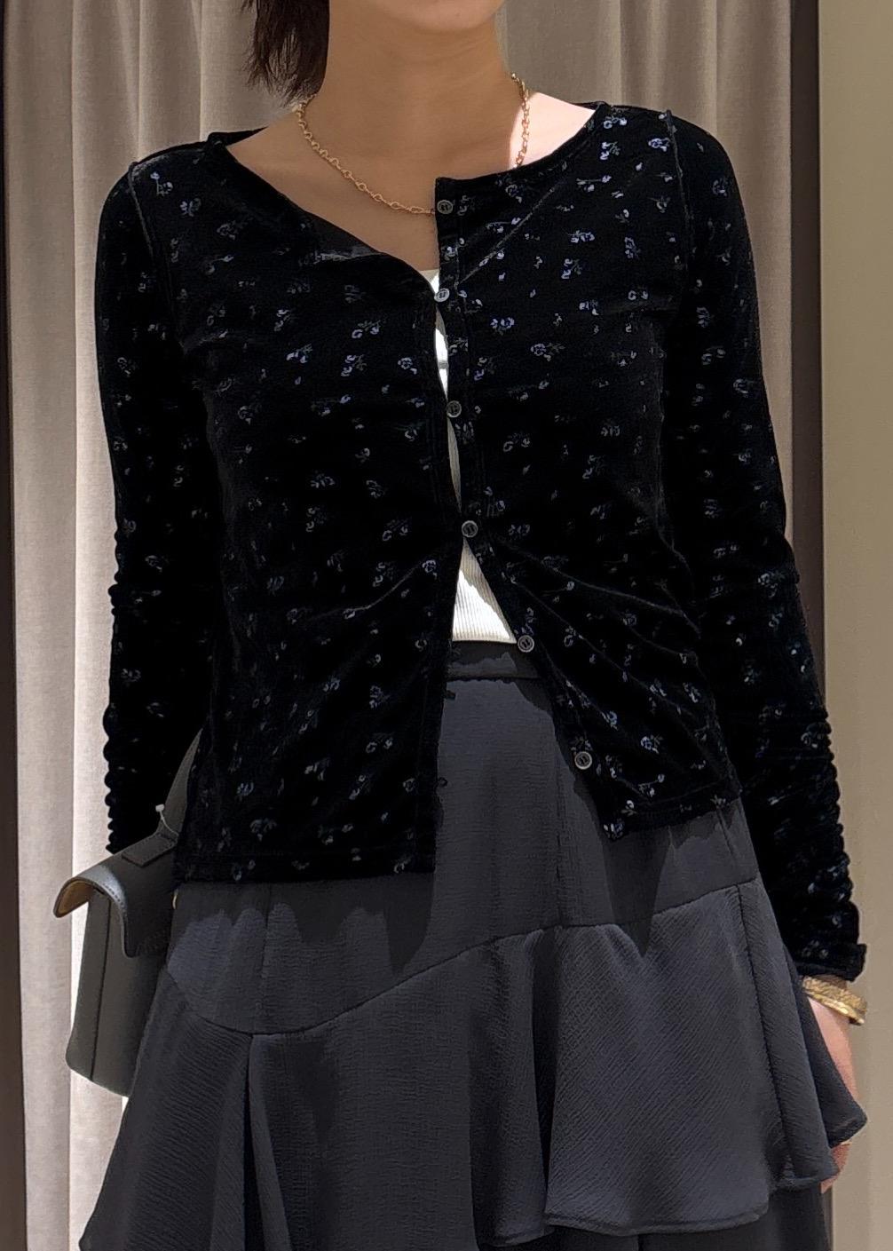 VIS【2WAY】花柄&無地アソート袖シャーリングベロアカーディガンブラック系 / F¥3,951レビュー前後2wayで使えるベロアカーディガン!
