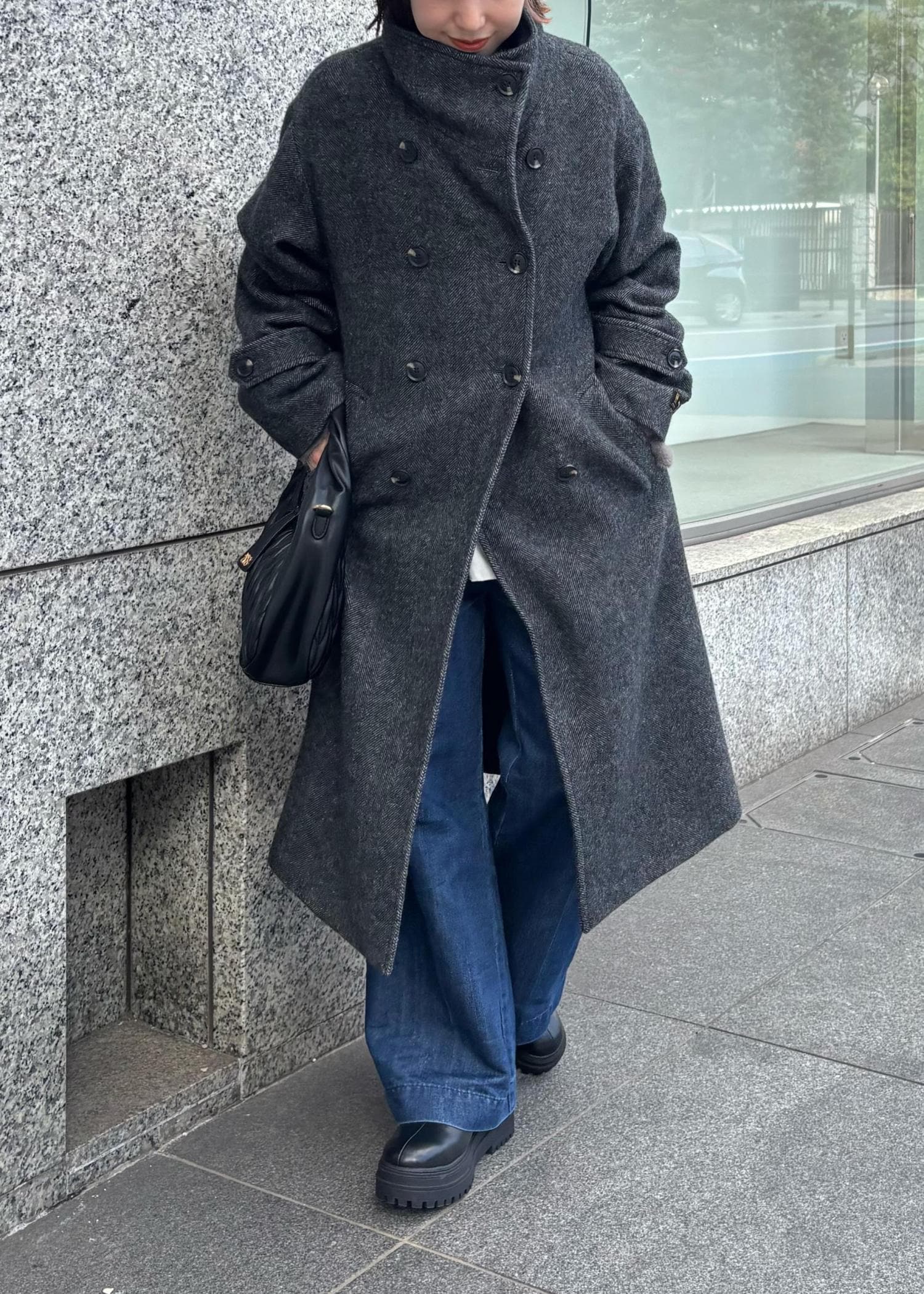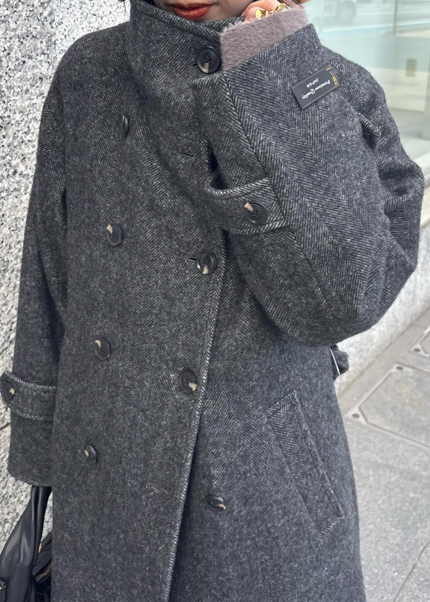毎シーズン大好評の尾州ウールのシャギーコート♪見た目の高見えデザインに加えウールなのにとで軽く、着心地◎ゆっりめなアームなので、中に厚手のニットなども着やすいです。襟元はスタンドにもできるので、見え方を変えられるなど優秀コート♪今回はサンプルでPSサイズ着用、全体的にややゆったりめで着丈はふくらはぎが半分隠れるくらいの長さでした。