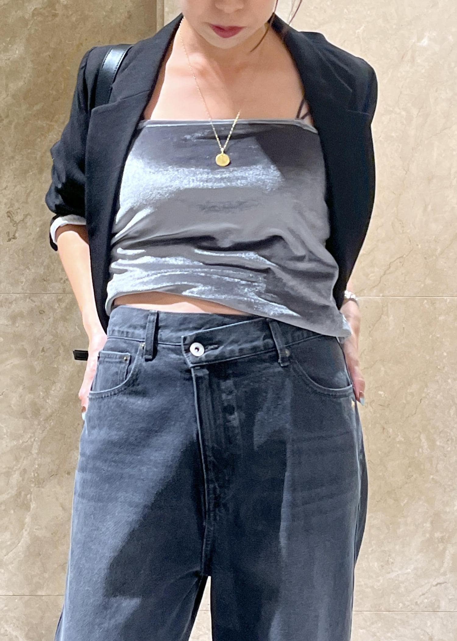 VISカップ付きベロアキャミソールグレー / F¥3,289レビュー身長158cm、着丈は腰あたりまでの丈感。写真のコーディネートでは裾を内側に折り短めに着用しています。