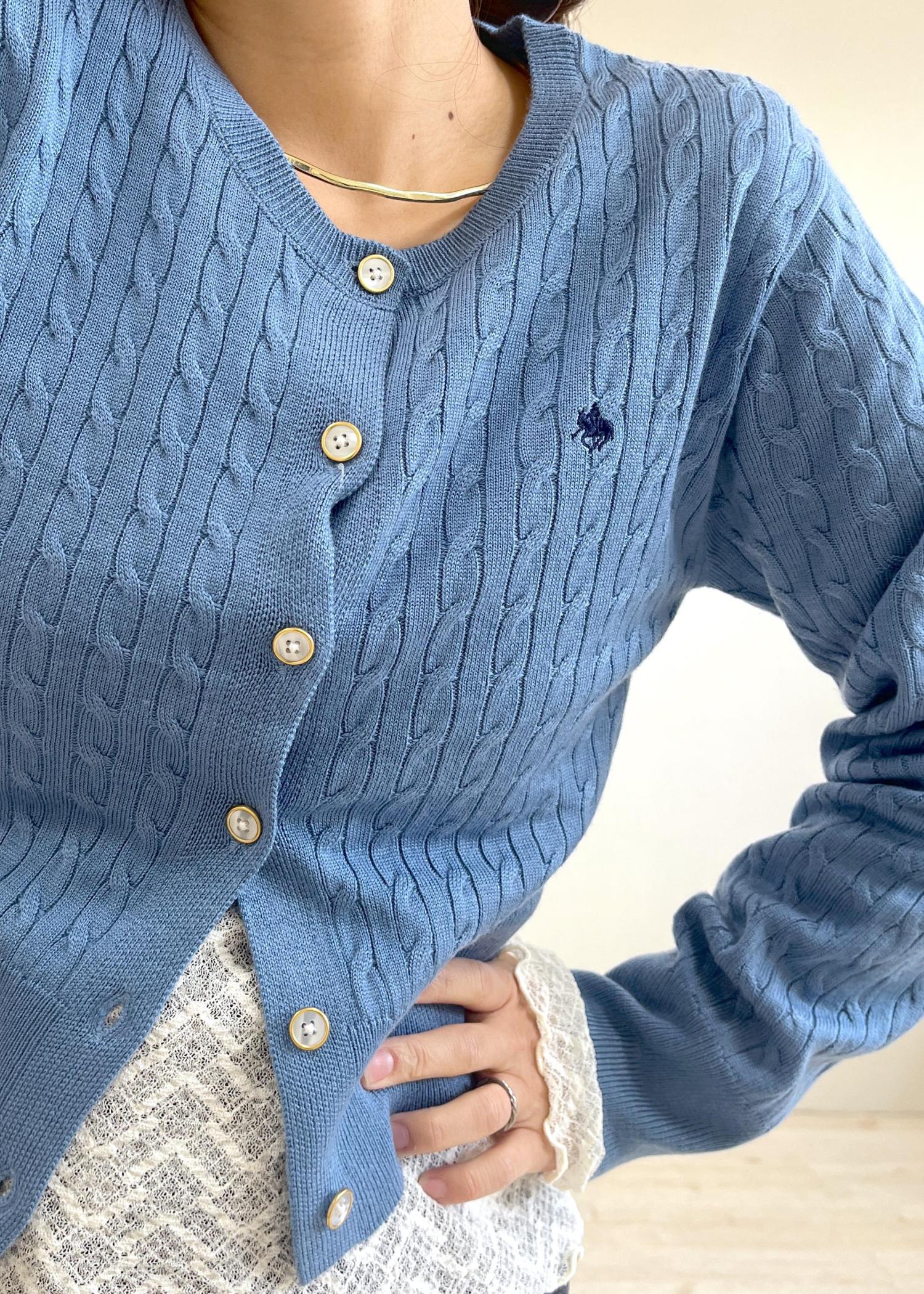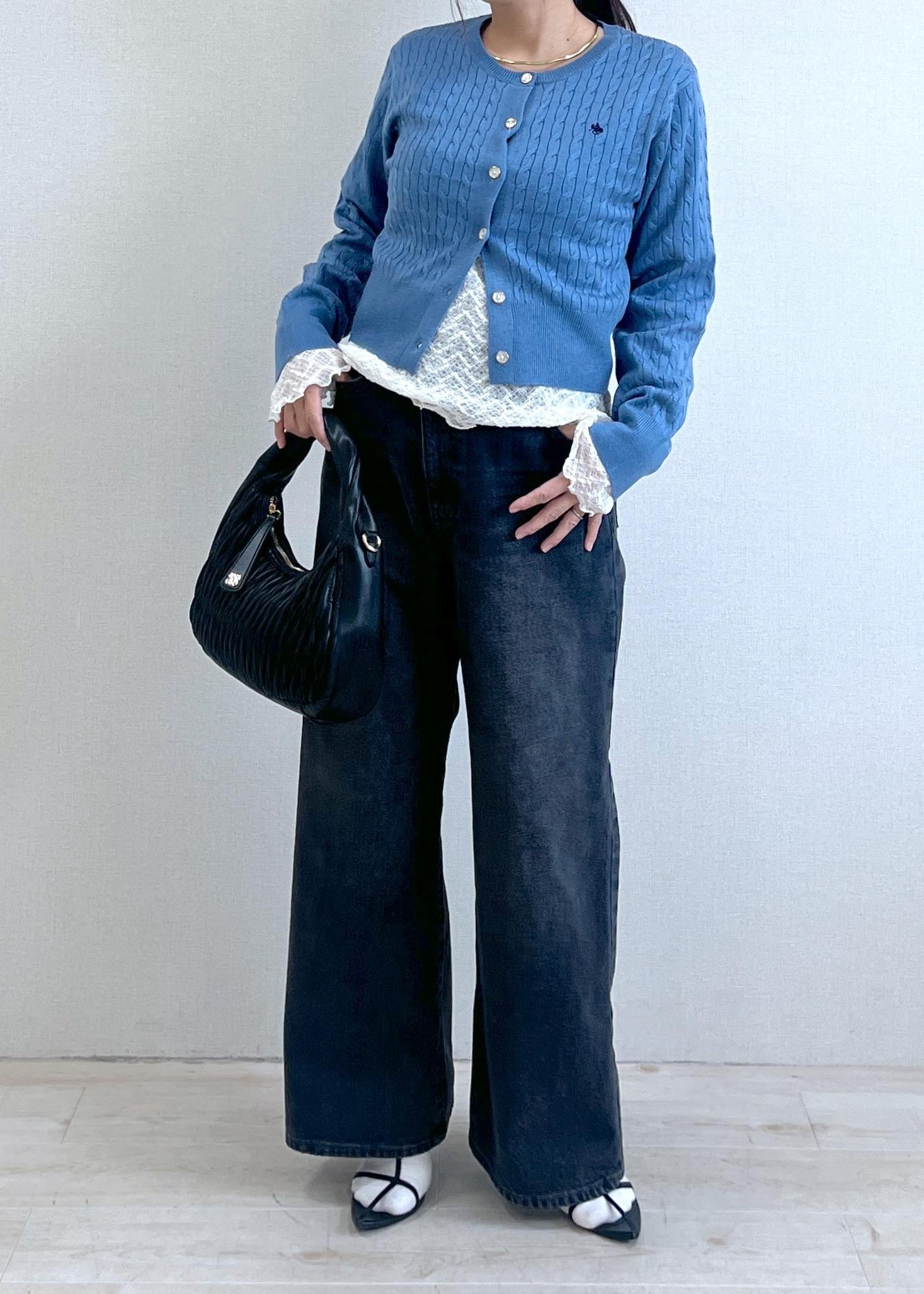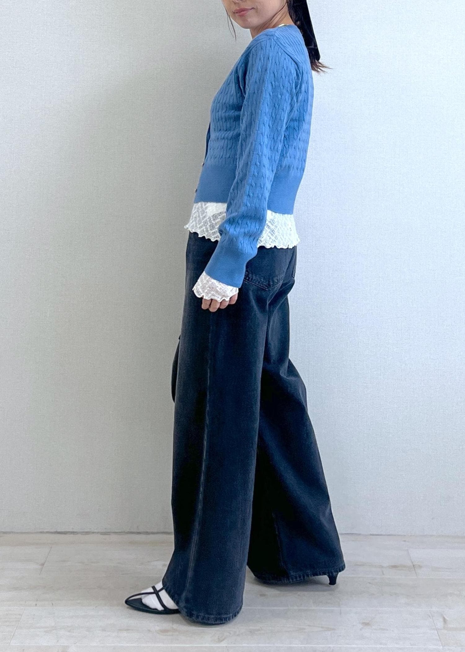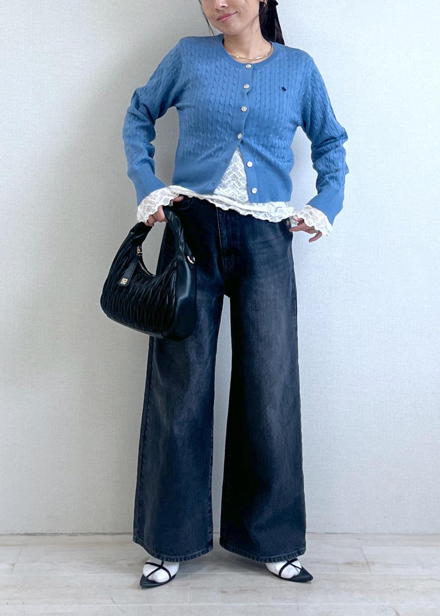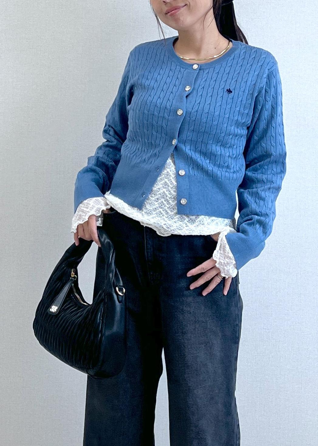 鮮やかなブルーのカーディガンに、裾と袖口から覗くレースを合わせてフェミニンな抜け感をプラス。