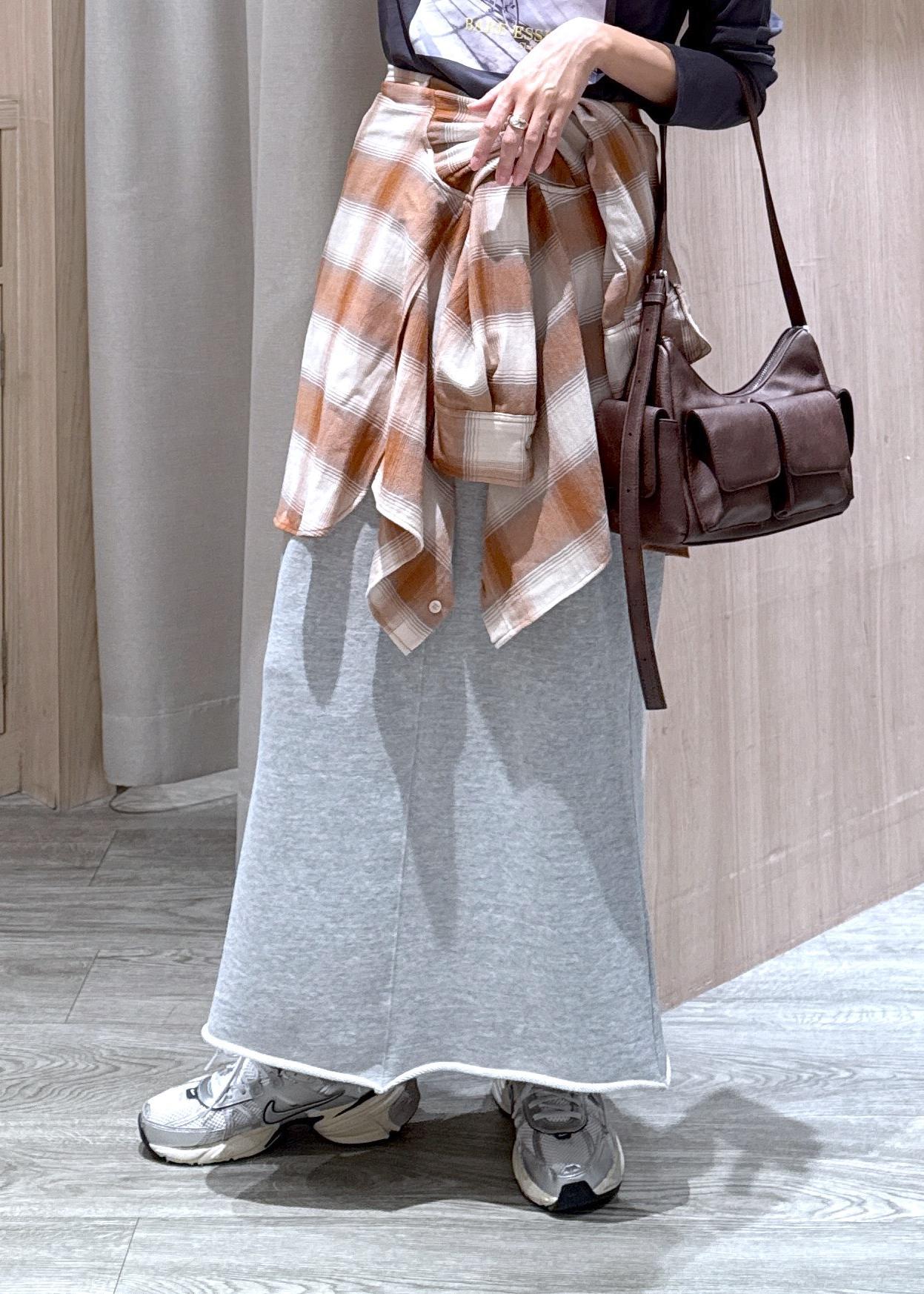 スウェット素材のナローススカートなので楽ちんなのにカジュアルすぎず、キレイめスタイルにも合わせやすいです◎ -