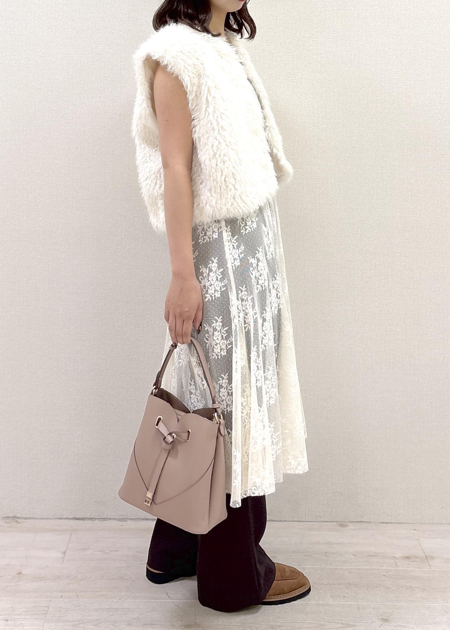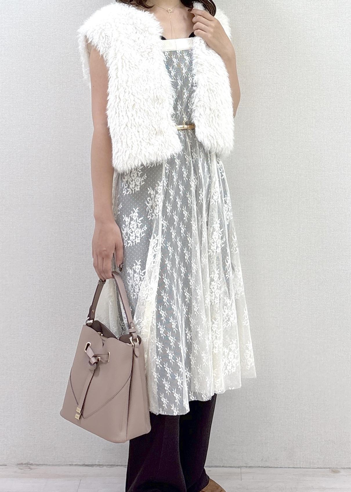 キナリとチャコールの2色展開のファーベスト、普段だったらまちがいなくチャコールを選びそうなのであえて逆張りでキナリを着てみたらショート丈だからか着膨れせずスッキリ着られて可愛かったです☺︎