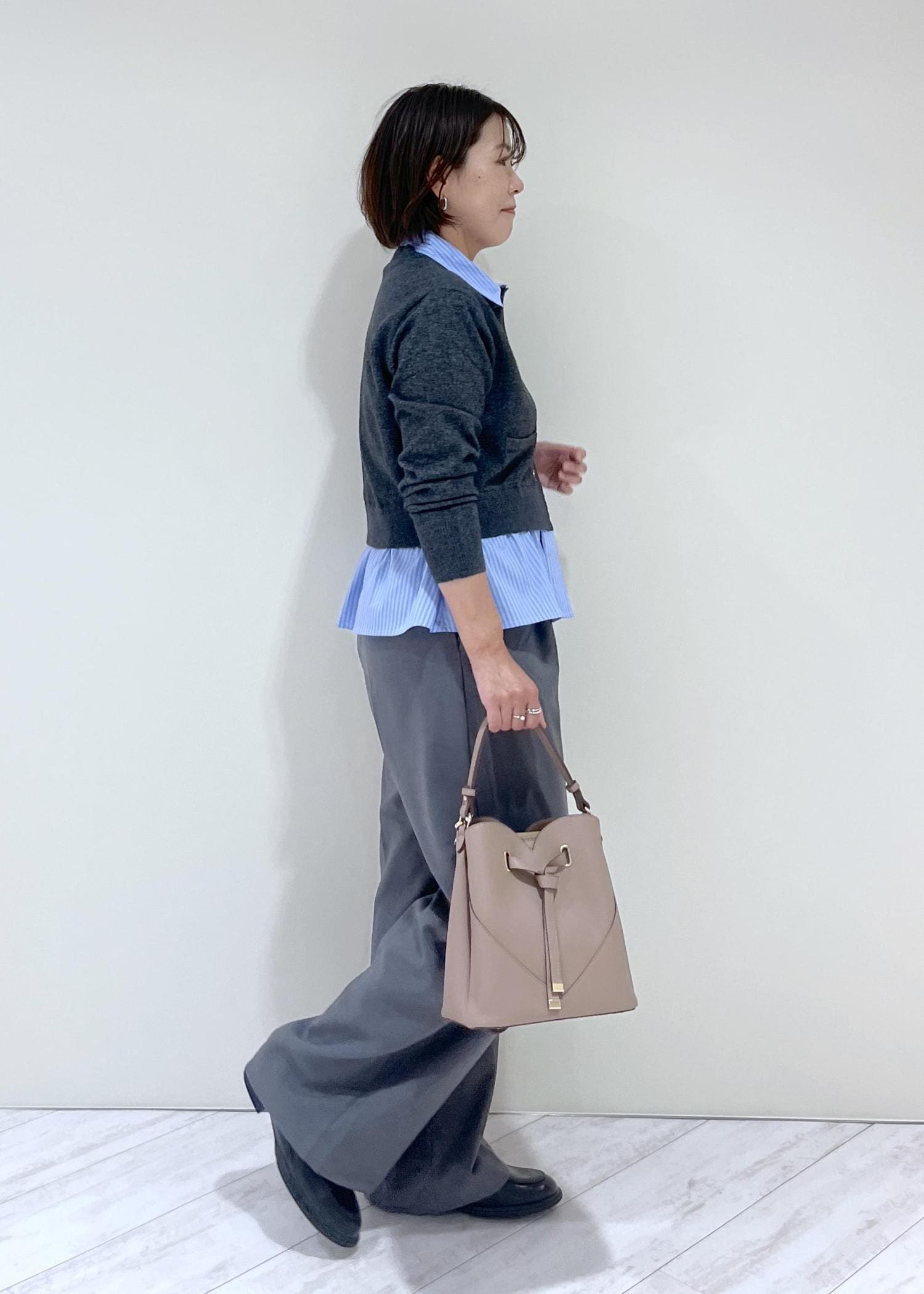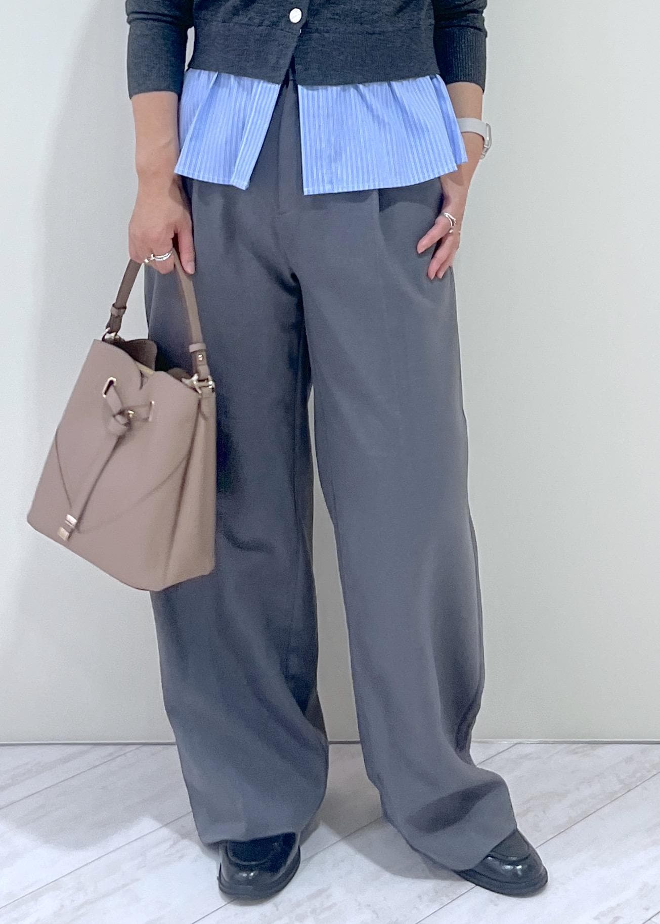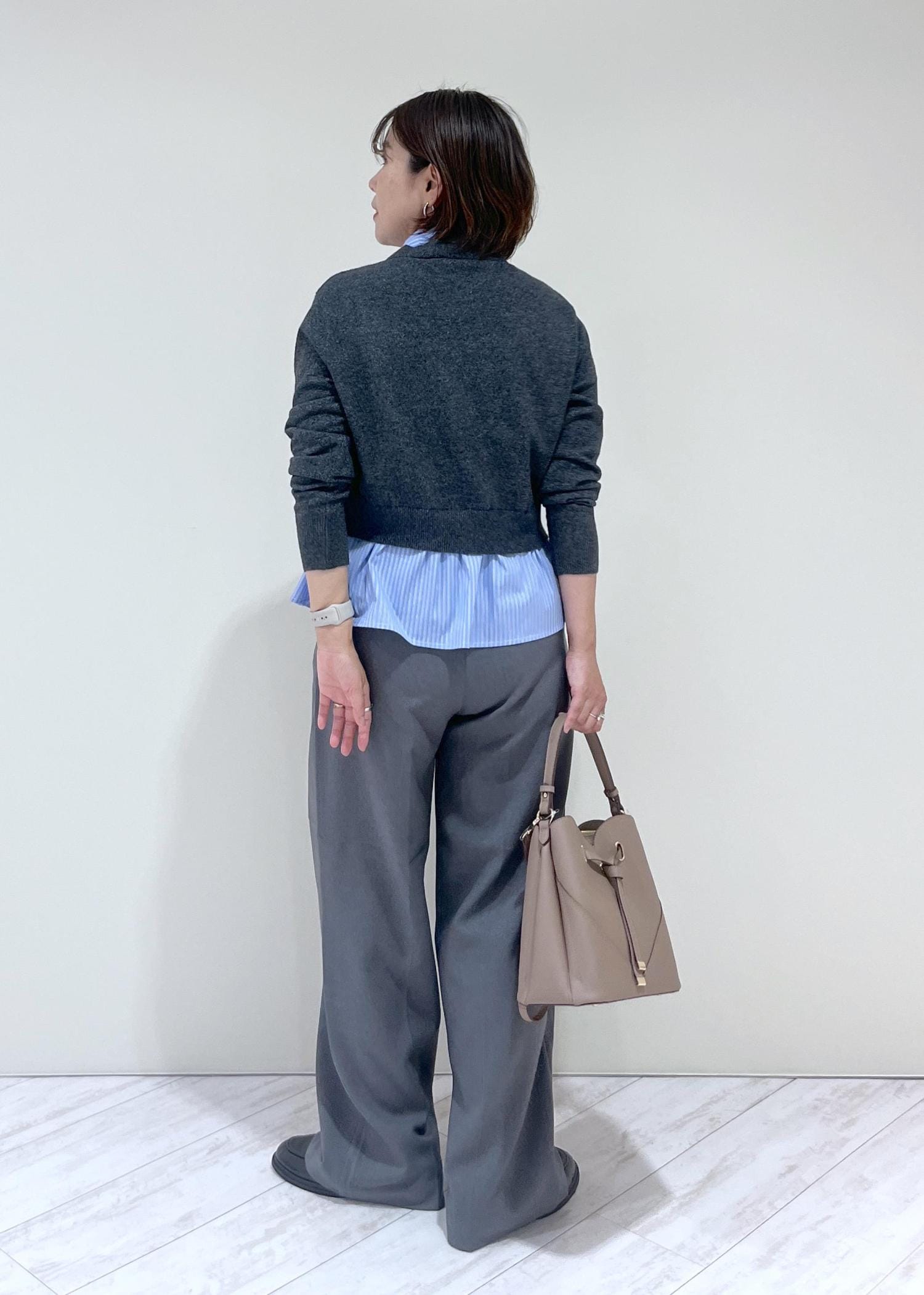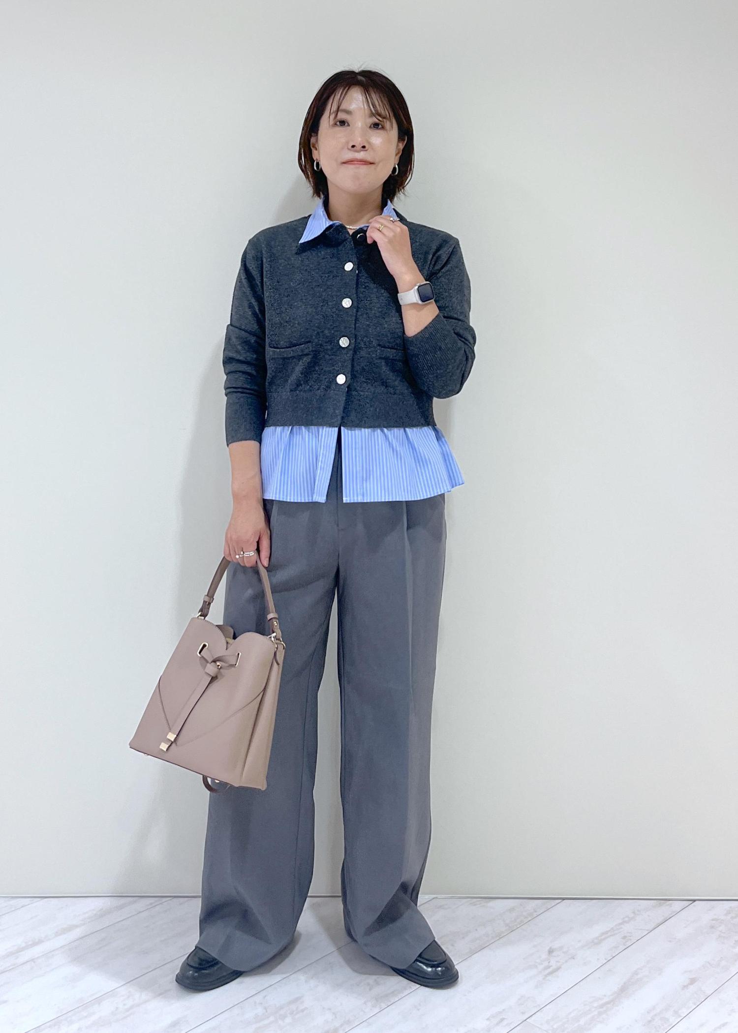 シャツ×ニットカーディガンのレイヤード感がかわいいトップスにシンプルにワイドパンツを合わせてお仕事モードに!!