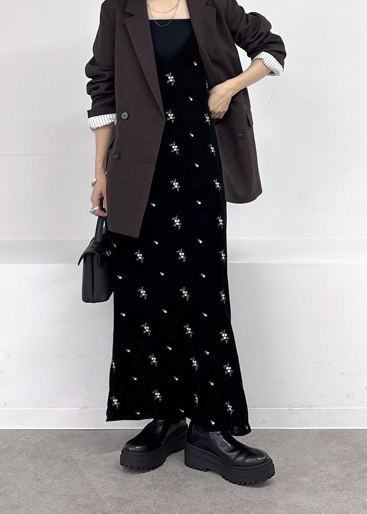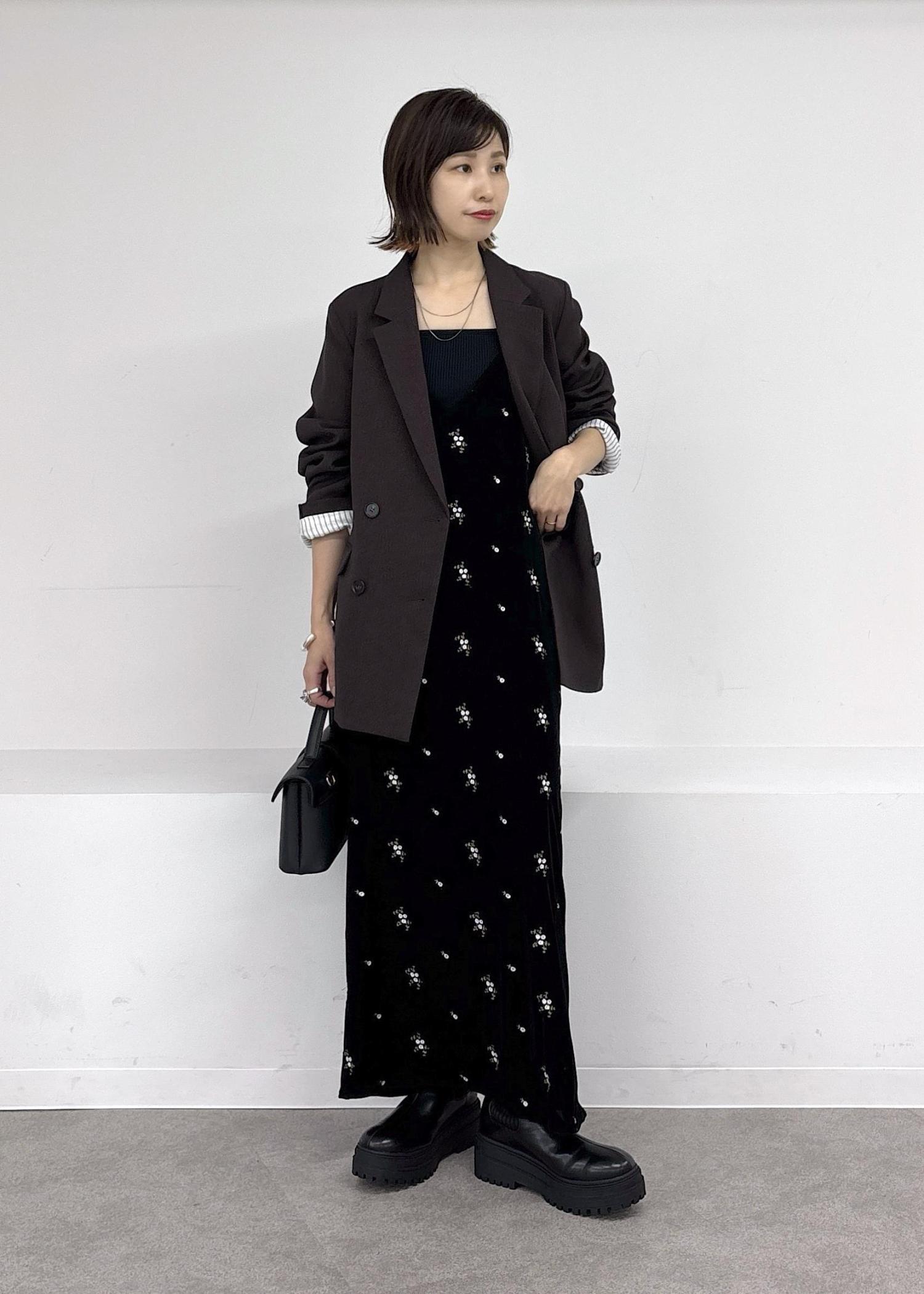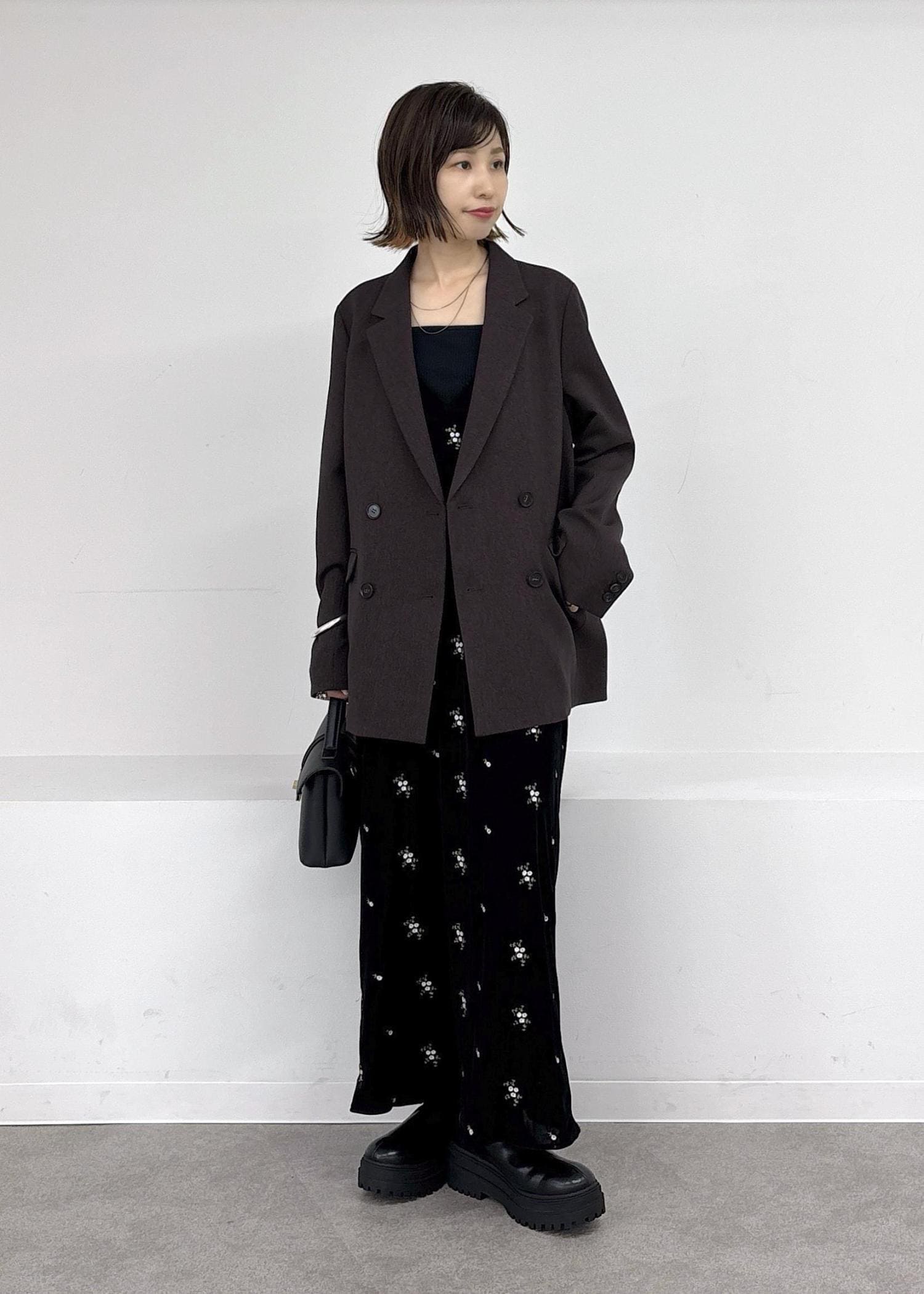 大人気シリーズの美easyジャケットと花柄ワンピで合わせた秋スタイル♪トレンドのブラウン、ベロアを取り入れました◎甘めなワンピースはハンサム要素のジャケットでまとめるのが好みです。秋オススメの大人カジュアルコーデ。