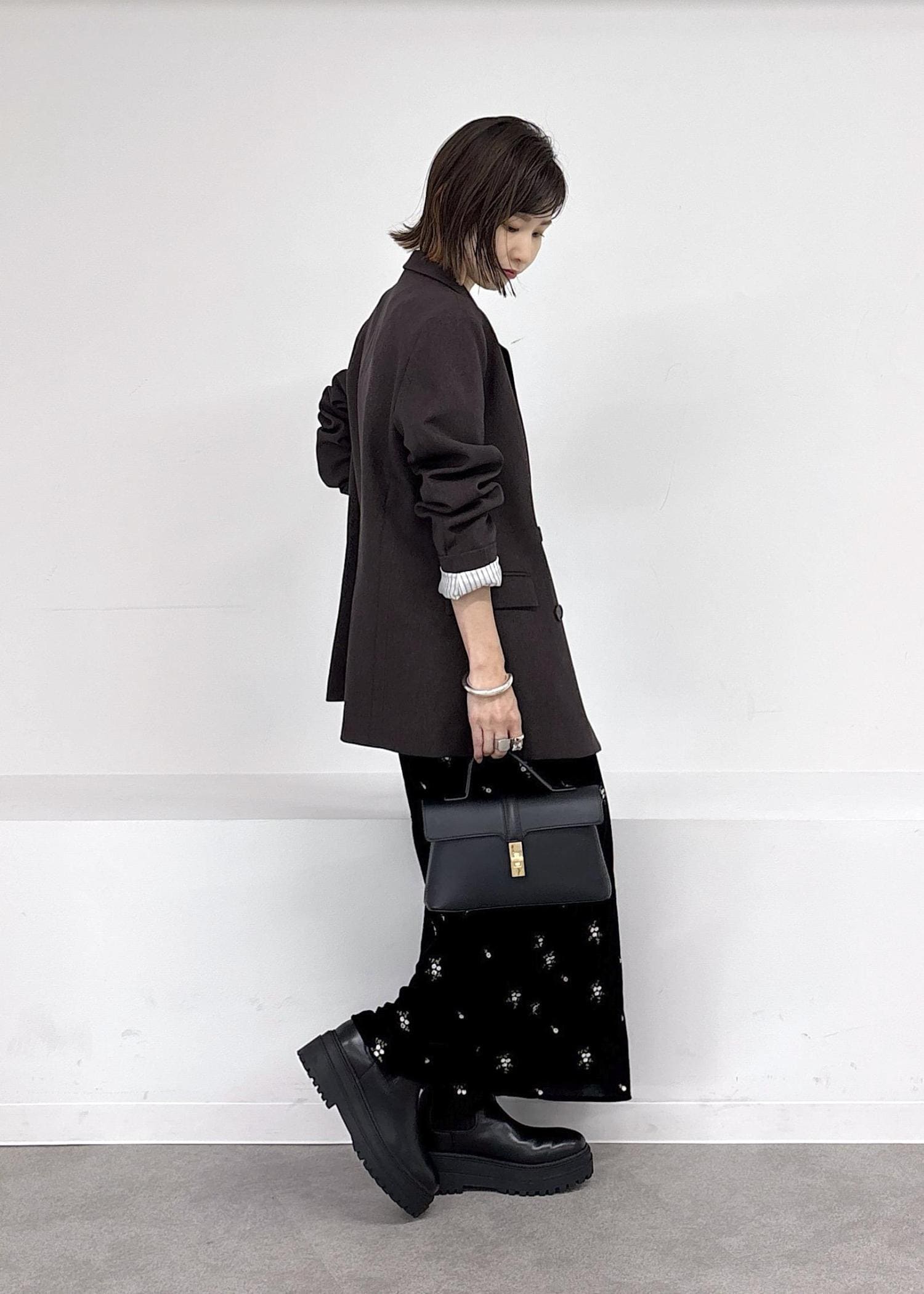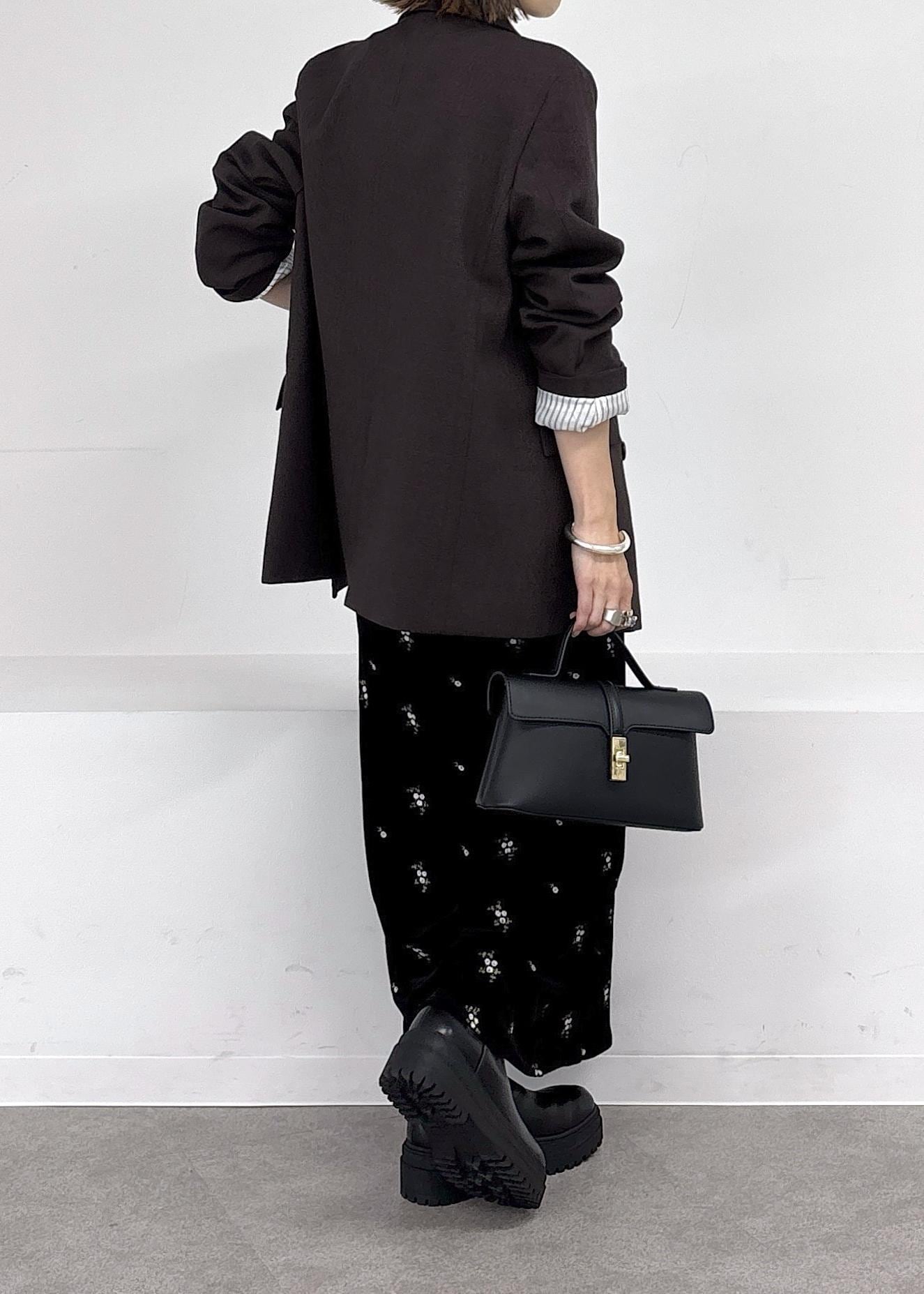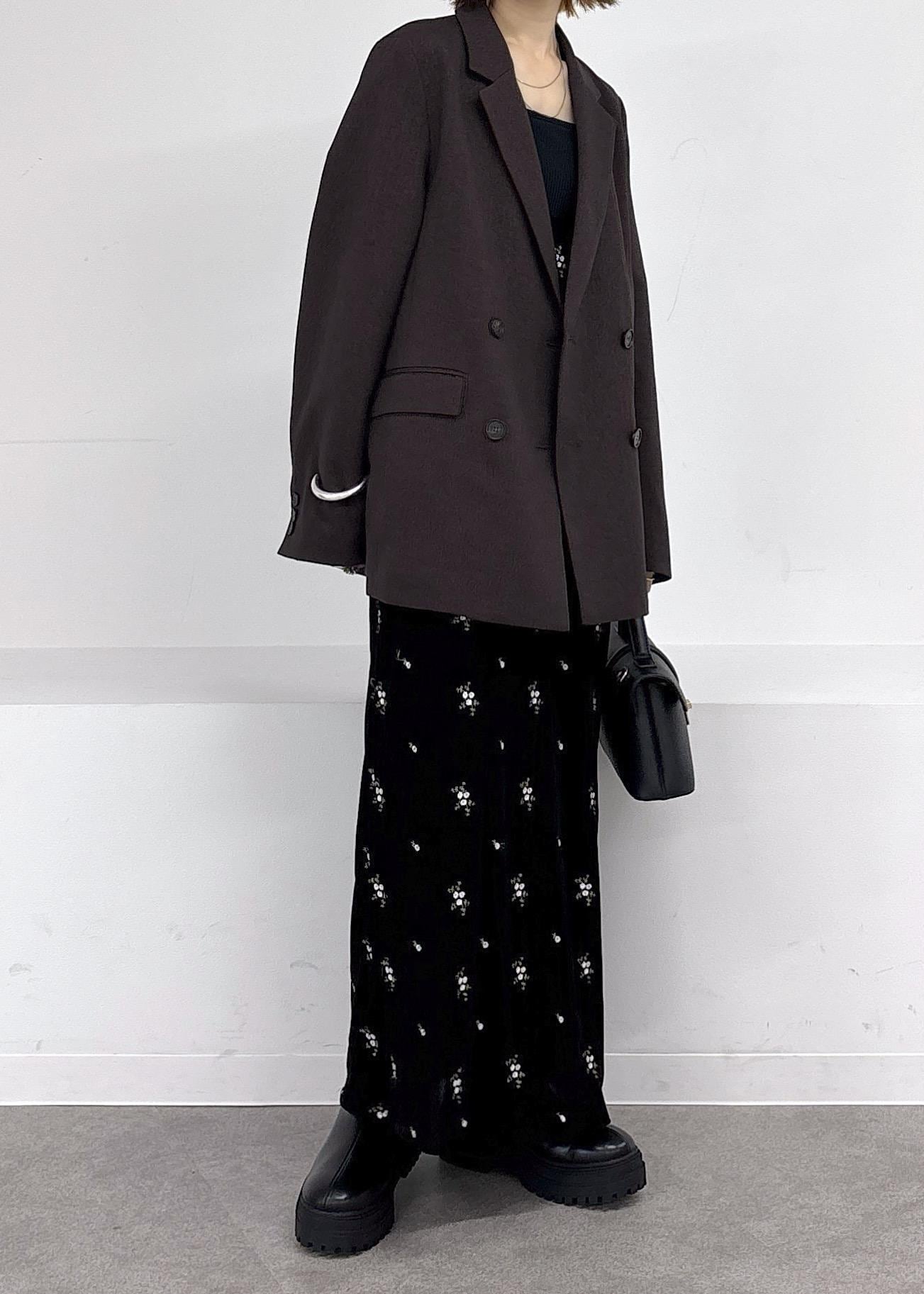 大人気シリーズの美easyジャケットと花柄ワンピで合わせた秋スタイル♪トレンドのブラウン、ベロアを取り入れました◎甘めなワンピースはハンサム要素のジャケットでまとめるのが好みです。秋オススメの大人カジュアルコーデ。