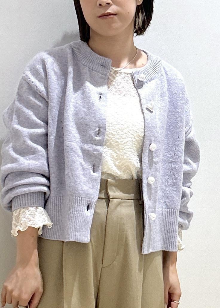 VISハートアソートパール釦ラメミックスカーディガン/イージーケア・一部WEB限定カラーパープル系 / F¥5,489レビューウール混のラメ入りのニットカーディガンです。厚みもあり、暖かくボタンを閉めてトップスとしても、インナーを合わせて羽織りとしても使えます。