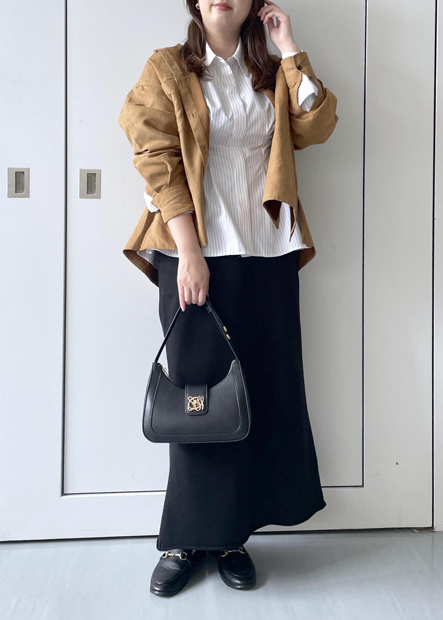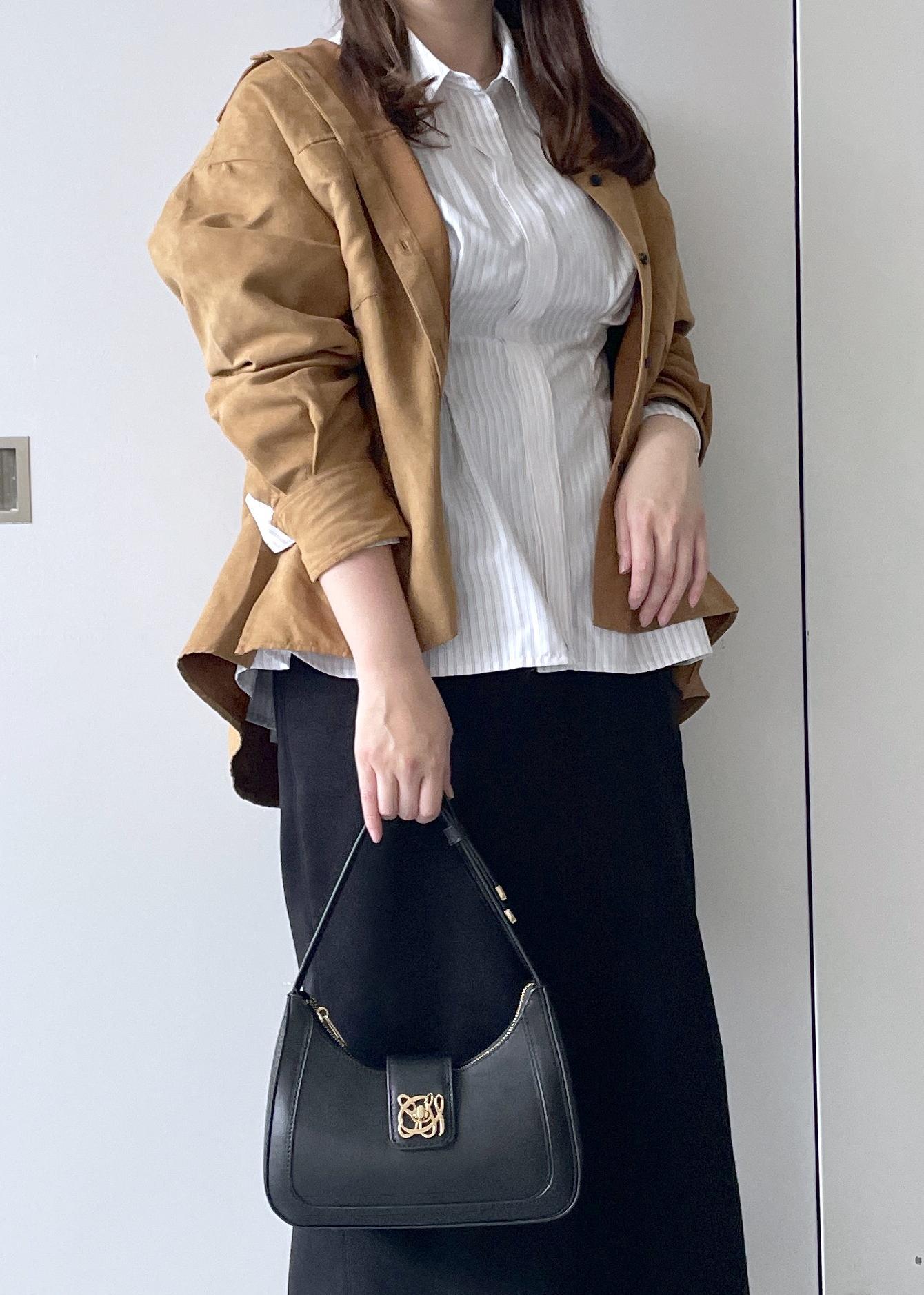 オーバーシルエットですが、程よい厚みのある生地なのでボリュームもですぎずきちんと感があるスエードシャツです。 -