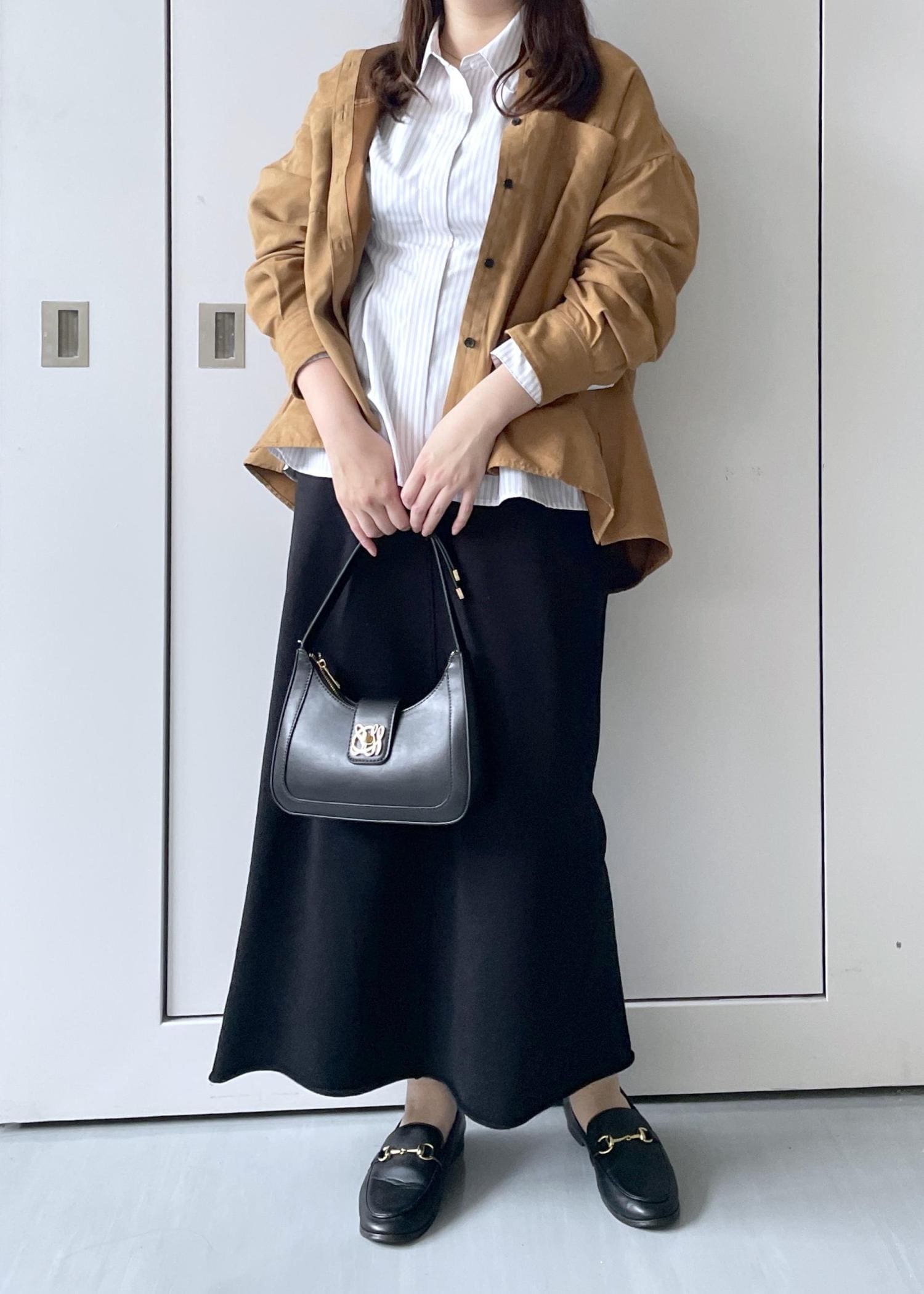 VISスエードライクロングスリーブシャツキャメル系 / F¥4,843レビュー163cmでヒップがほとんど隠れる丈感です。