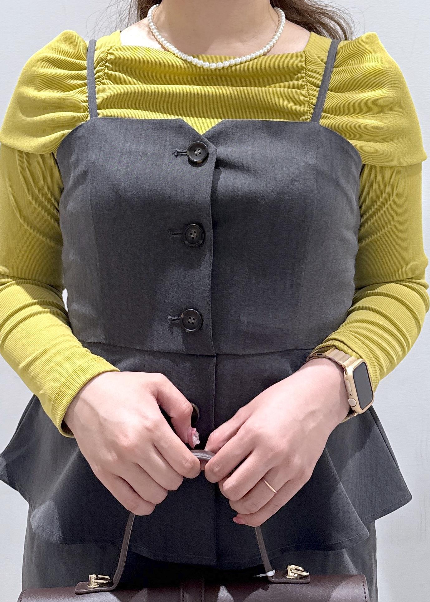 VISビスチェドッキングライクキャミワンピースグレー / F¥7,689レビュー昨年も大人気だったビスチェドッキングワンピース☆見た目がセットアップのように見えますが、繋がってワンピースなので一枚で楽に着ることができます。骨ストの私ですが、元々上半身に分厚い私でもキャミの紐の部分でデコルテラインを綺麗に見せることができ、胸元のボタンも後ろがゴムだから簡単にとめることができ、お腹周りが隠れIラインのスカートで細く見えするので、骨格関係なく全員にオススメしたいワンピースです!