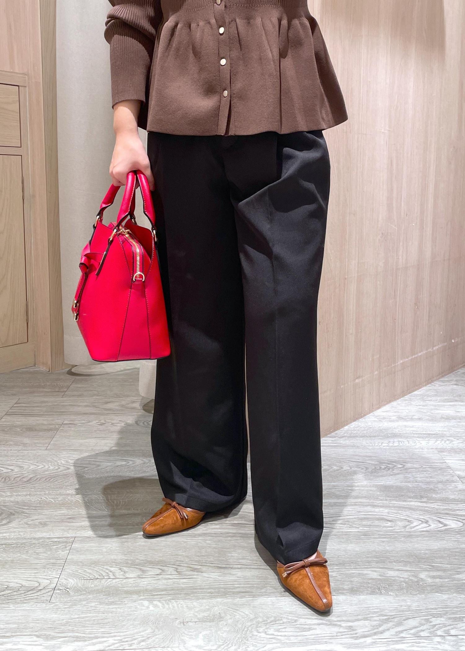 落ち着いた色味のコーデなのでバックには差し色のレッドを取り入れました!