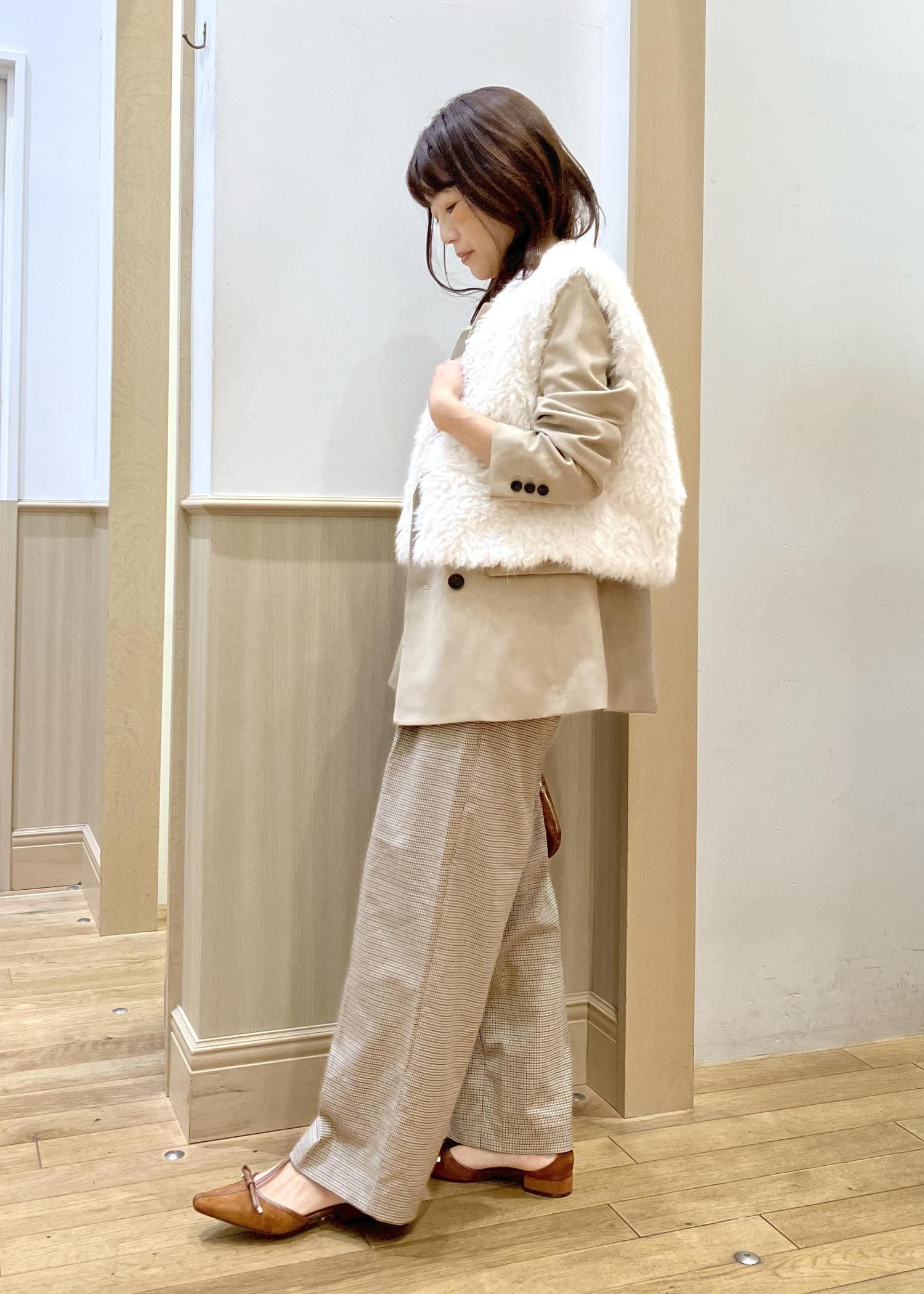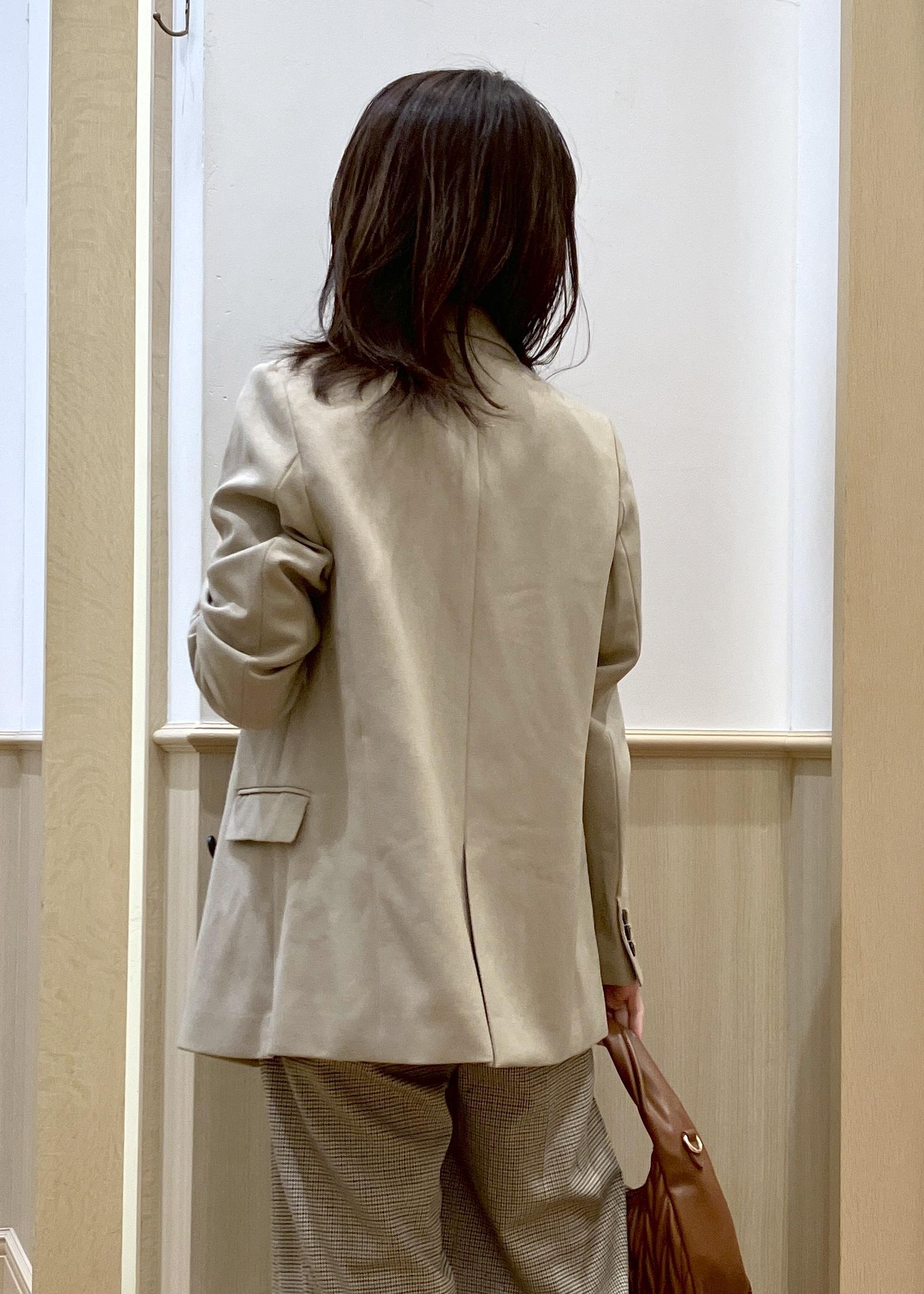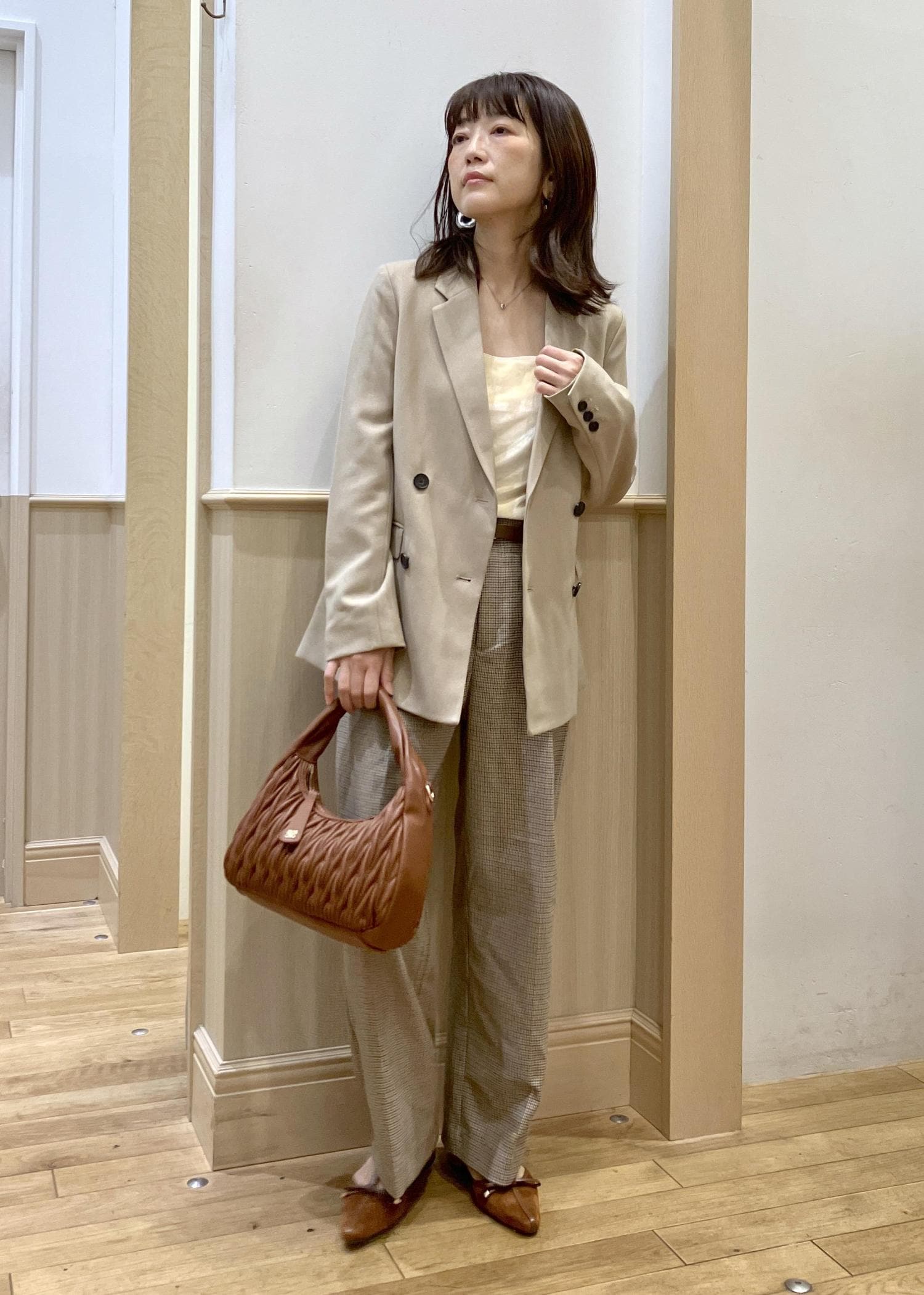 ジャケットの上に敢えてのベストを重ねてみたのですがカラーを揃えてさりげないポイントになるようにしてみました。ボトムスはチェック柄でややカジュアル感をプラスしてます。