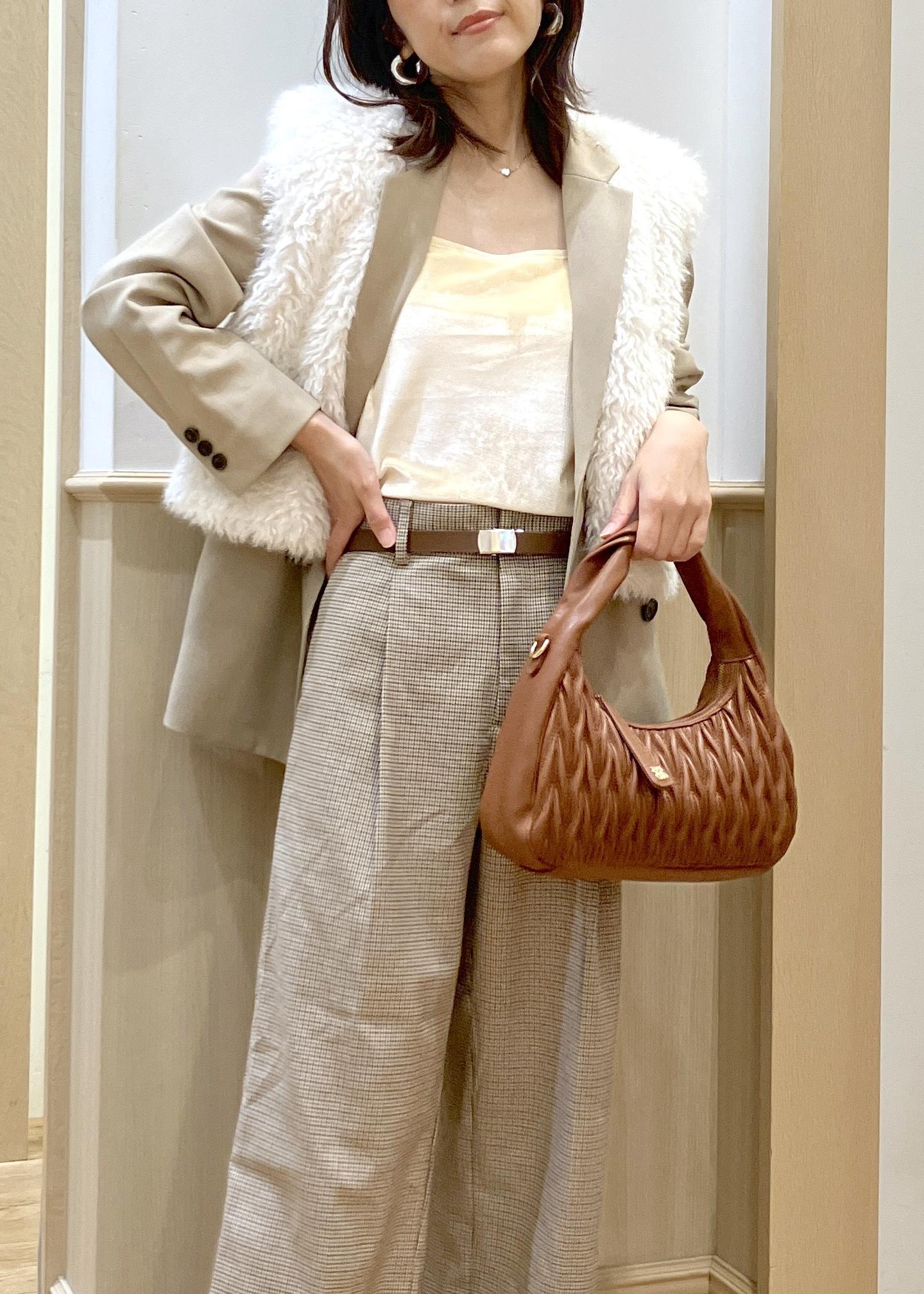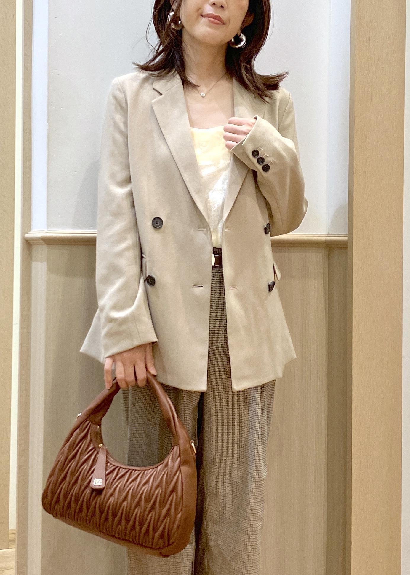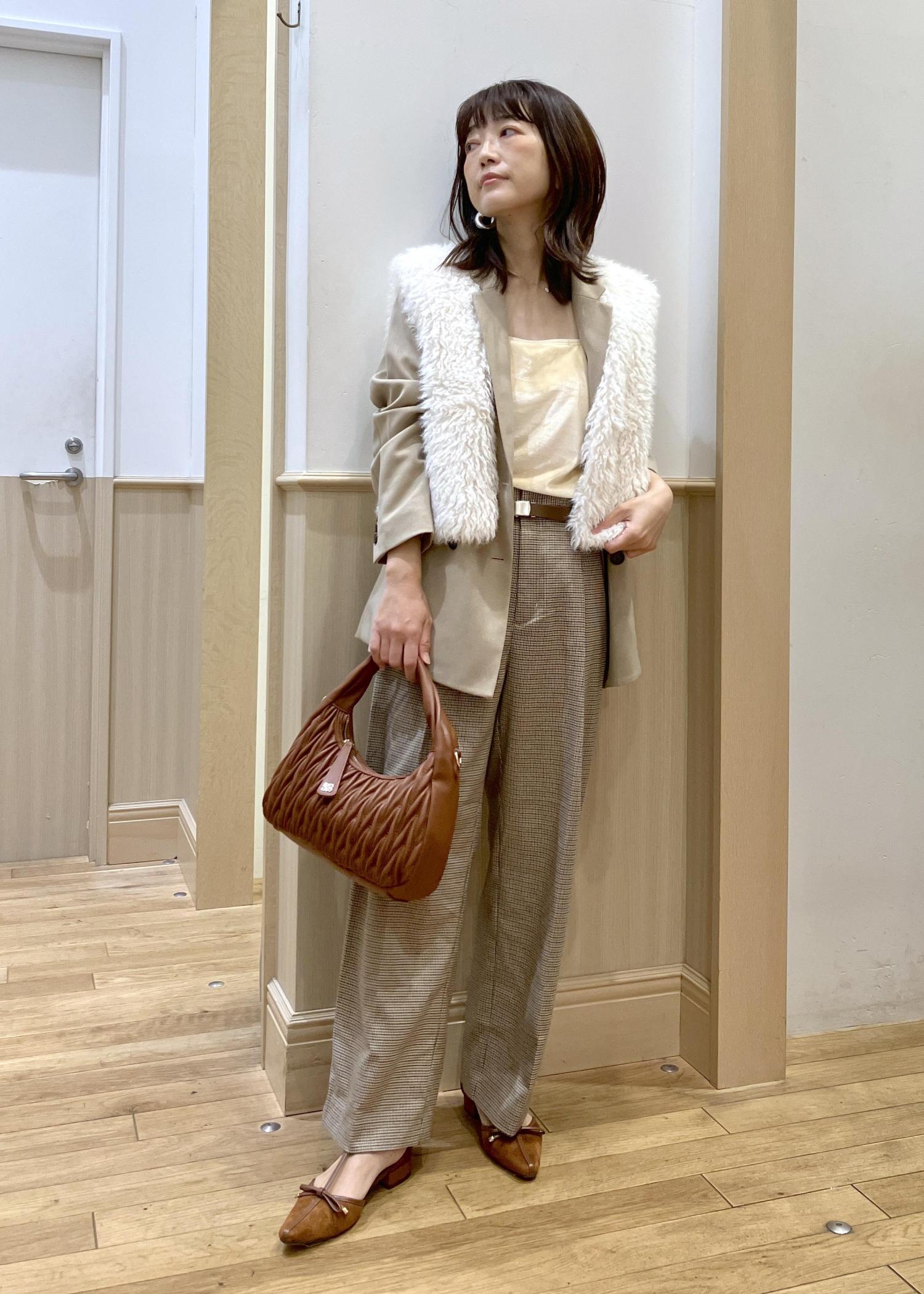 ジャケットの上に敢えてのベストを重ねてみたのですがカラーを揃えてさりげないポイントになるようにしてみました。ボトムスはチェック柄でややカジュアル感をプラスしてます。