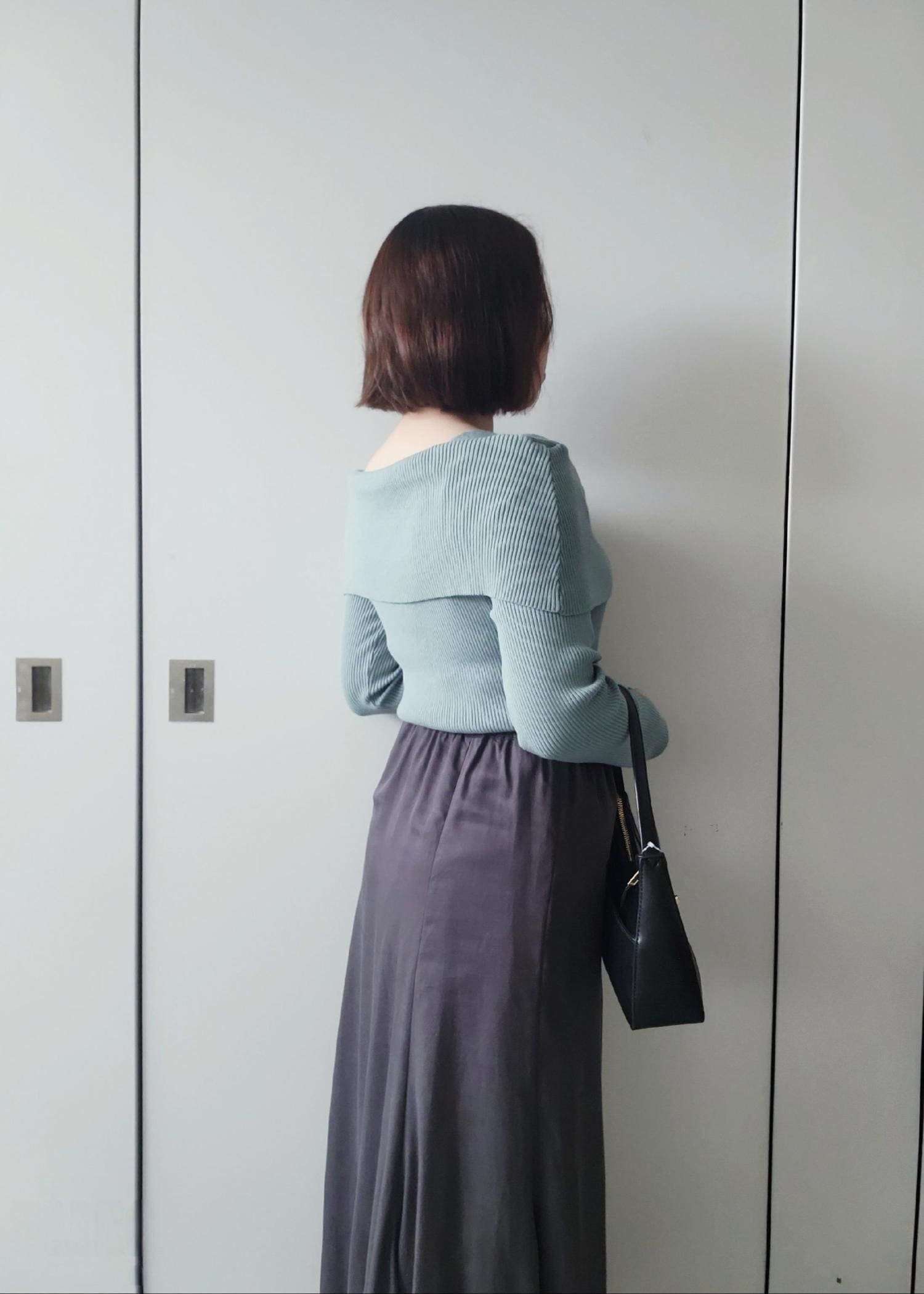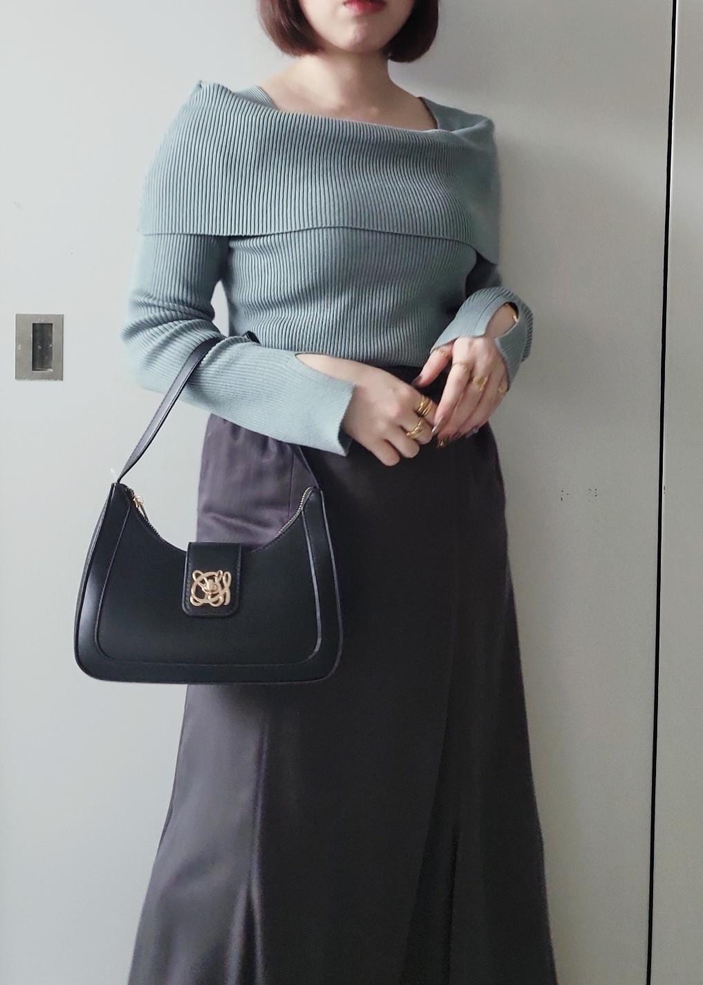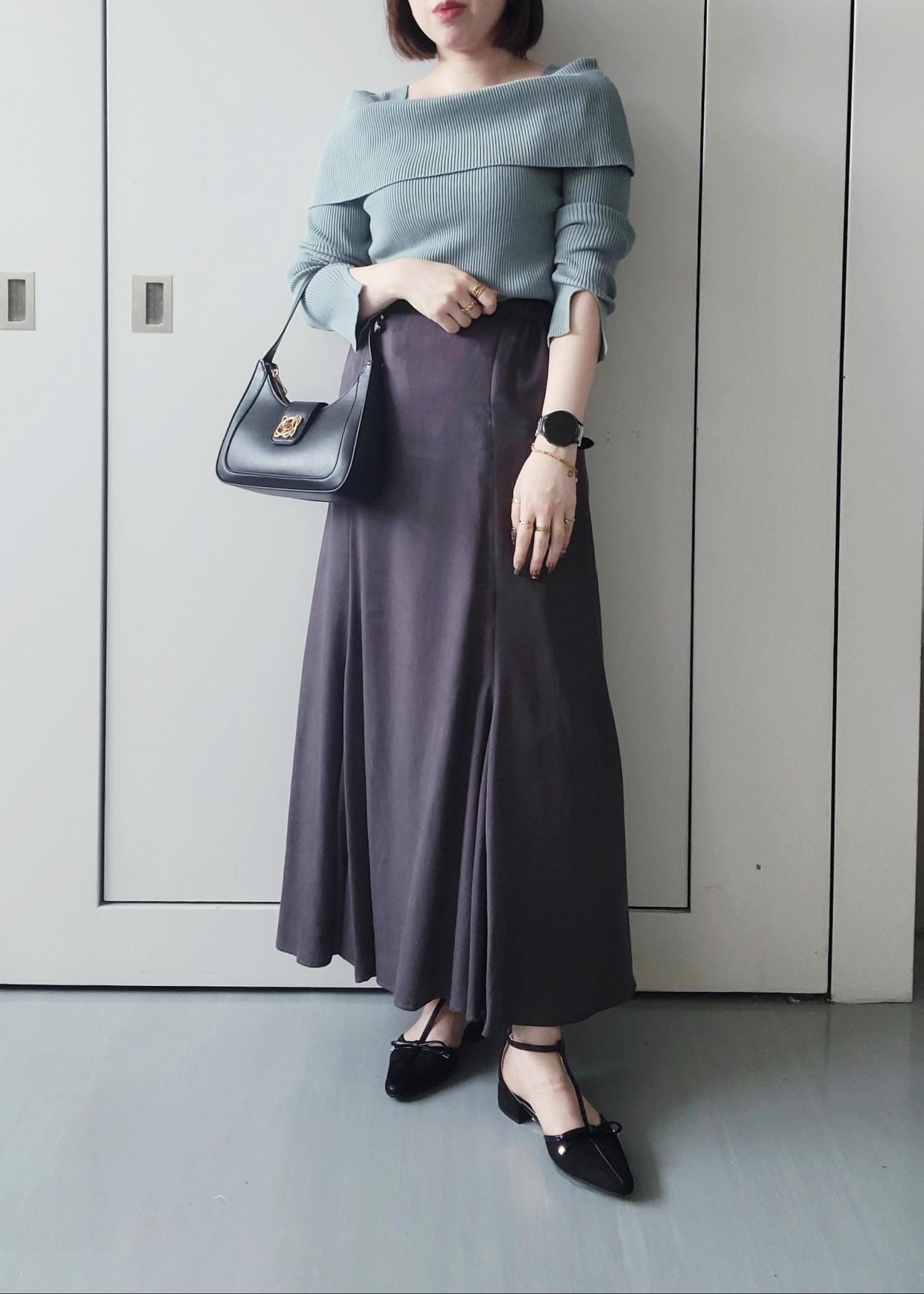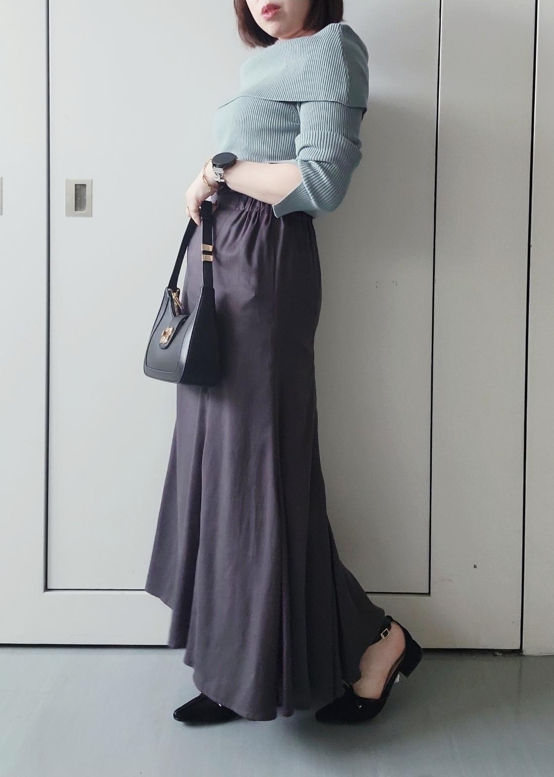 カラーニットにダークトーンでまとめた大人フェミニンスタイルにしました。落ち着きのある雰囲気でオフィススタイルにも◎!
