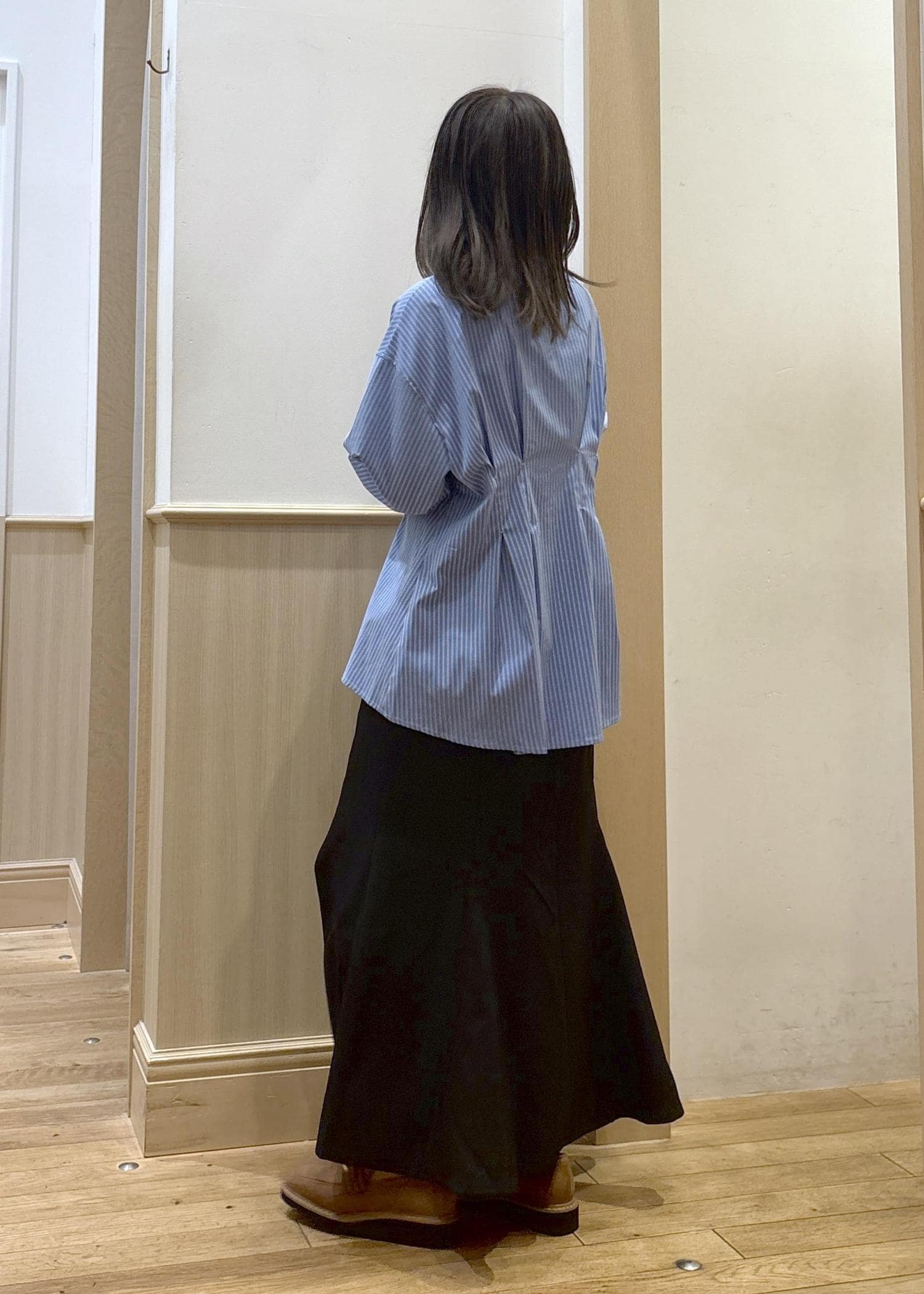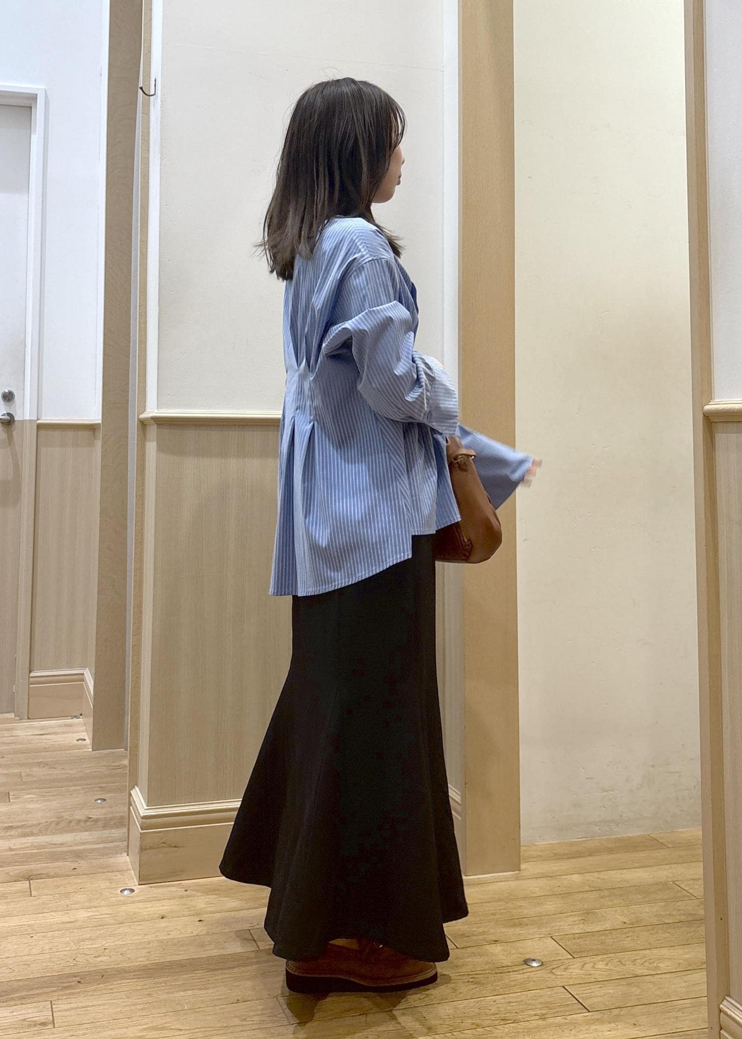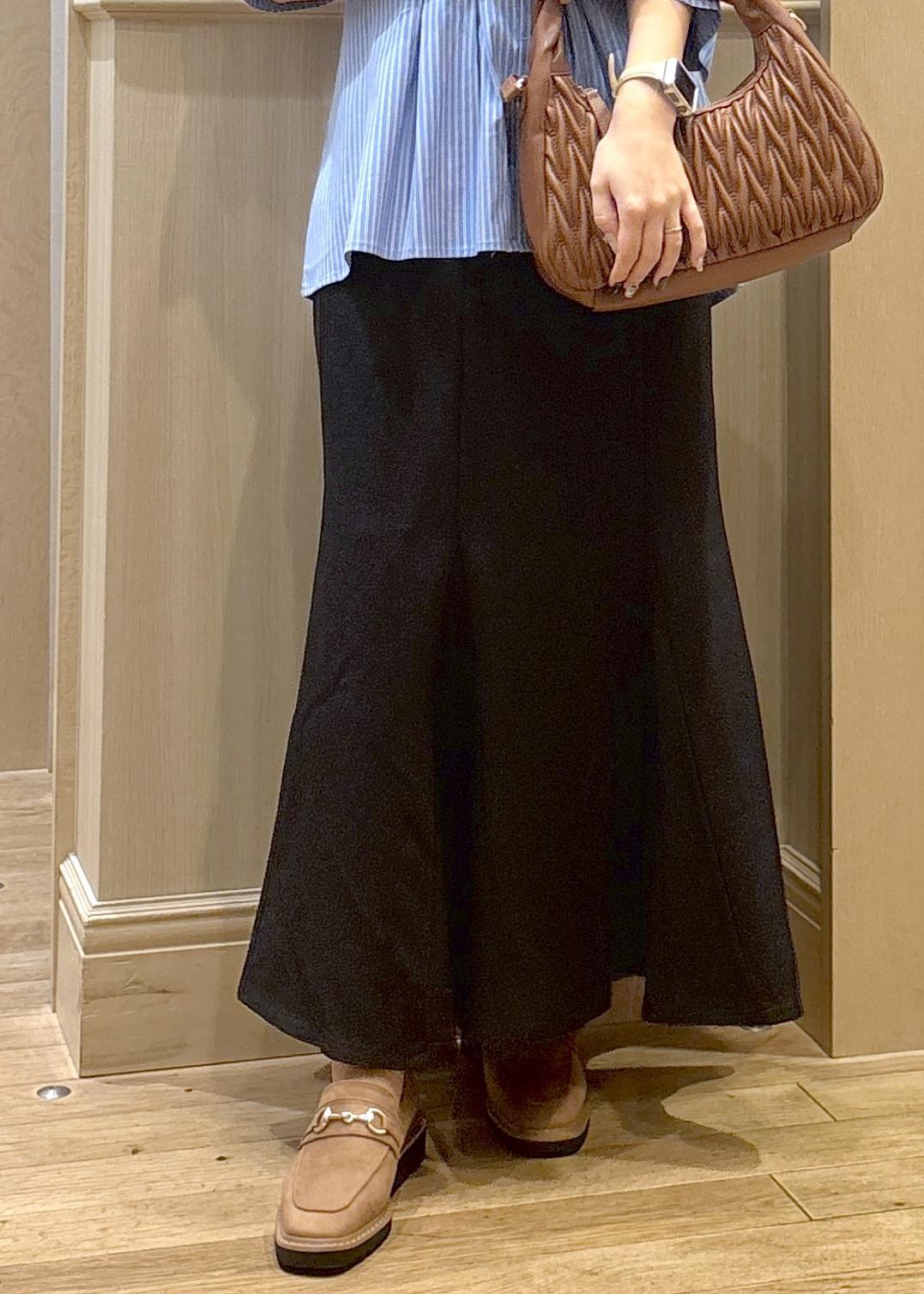 くるぶしくらいまでしっかり長さが欲しい時は、Mサイズでウエストを両ボタン詰めると、トップスをインして少し大きいくらいで、シルエットは綺麗なので、着たいバランスによってサイズ感を選びやすいスカートです。 -