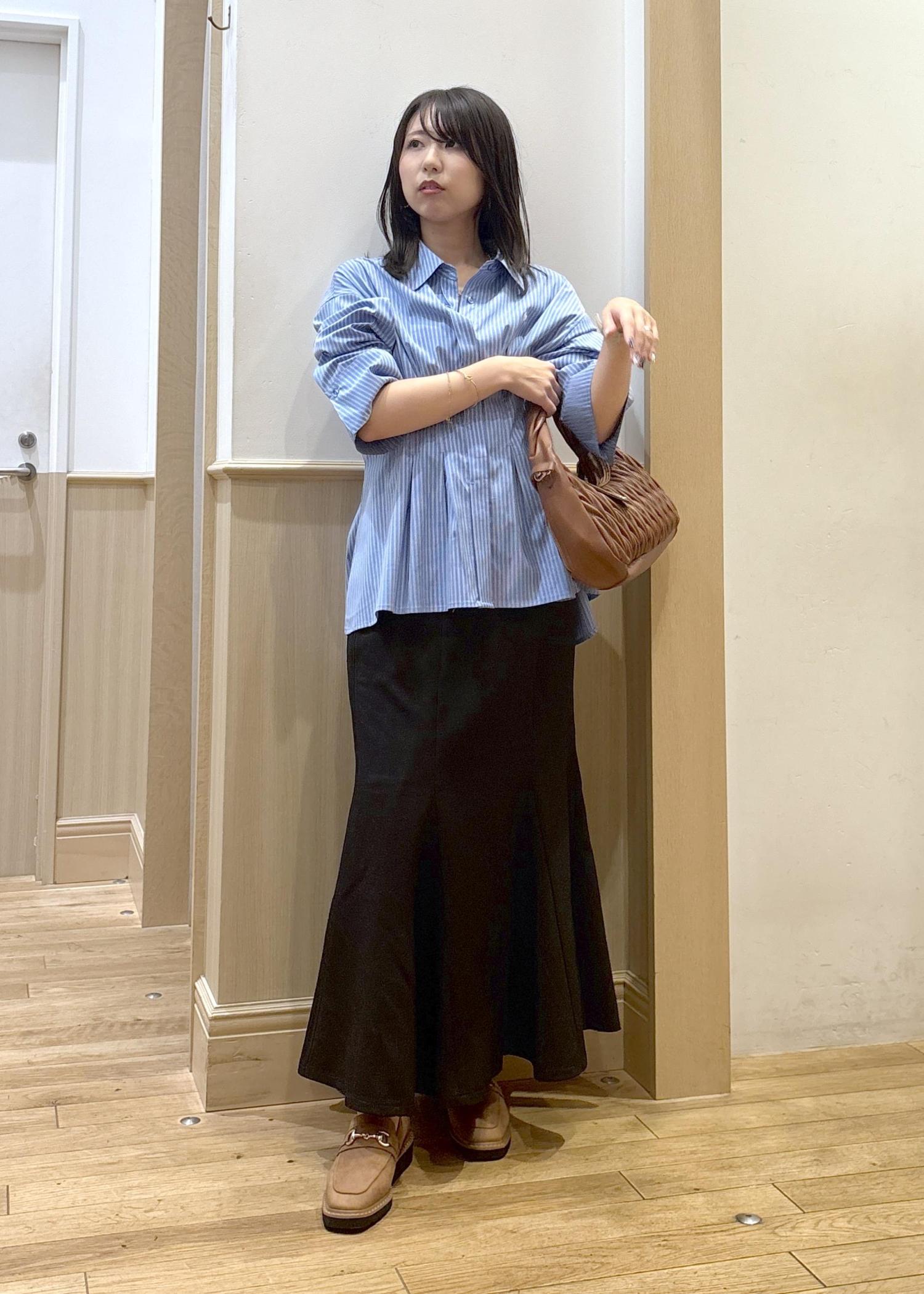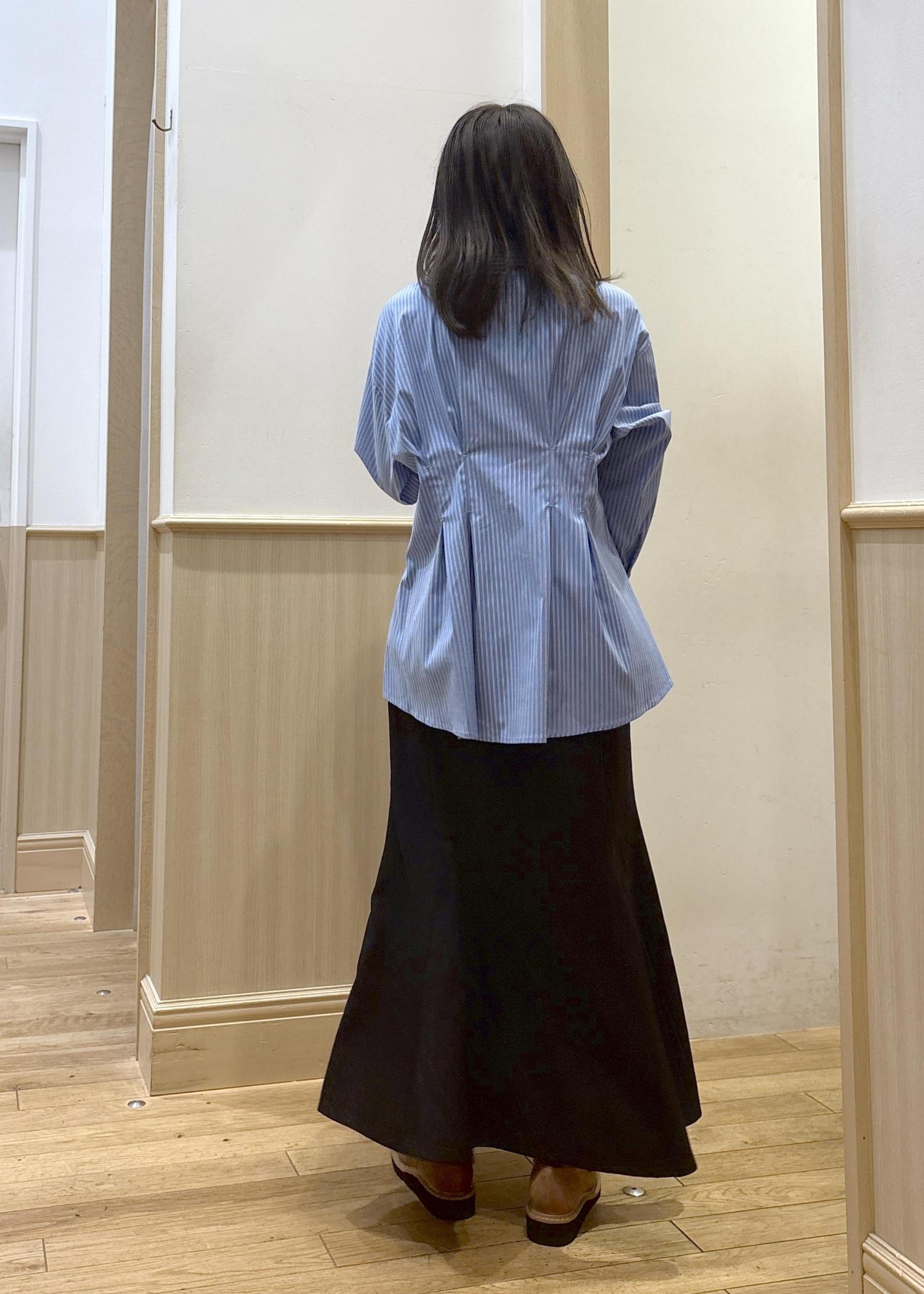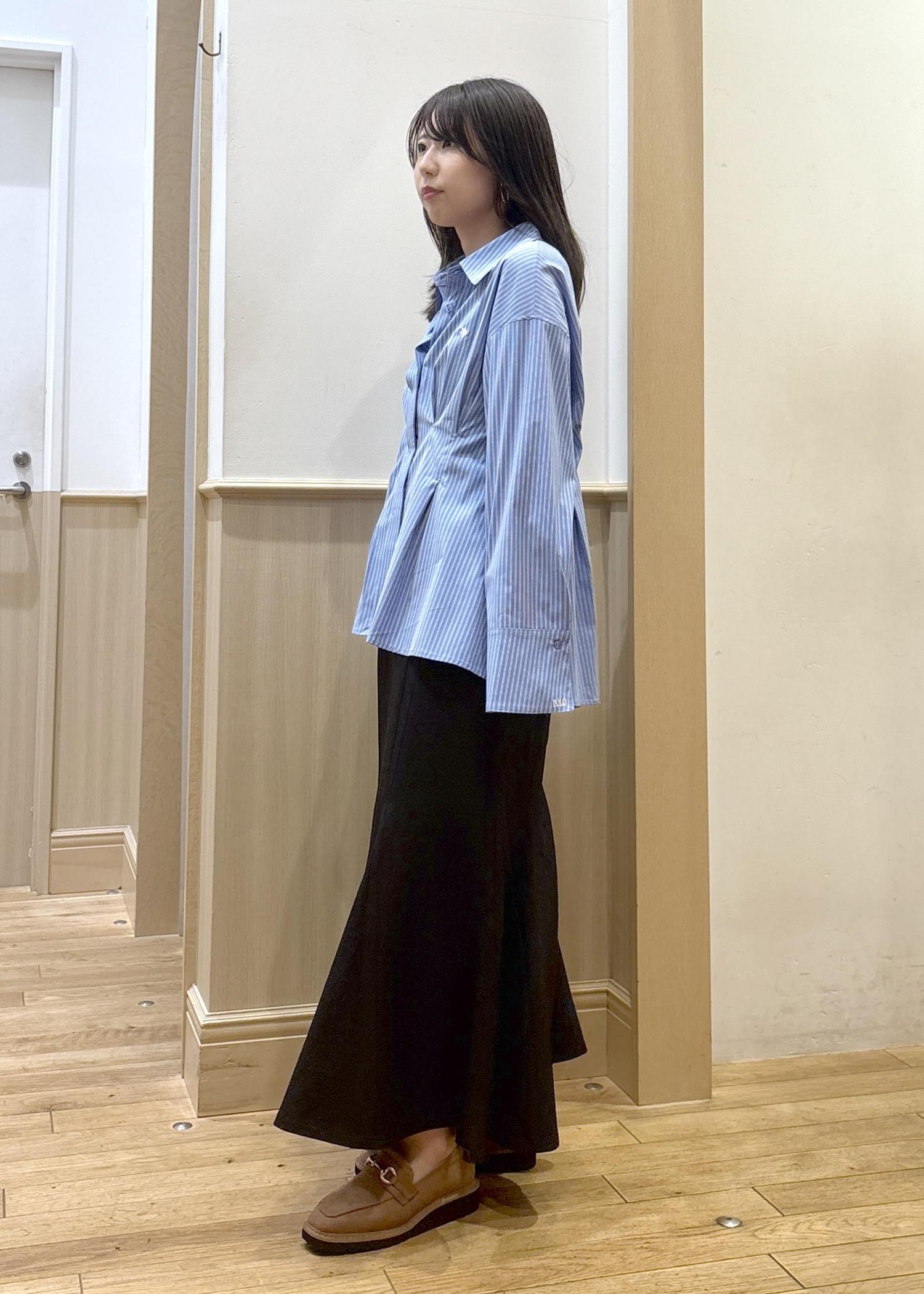 くるぶしくらいまでしっかり長さが欲しい時は、Mサイズでウエストを両ボタン詰めると、トップスをインして少し大きいくらいで、シルエットは綺麗なので、着たいバランスによってサイズ感を選びやすいスカートです。 -