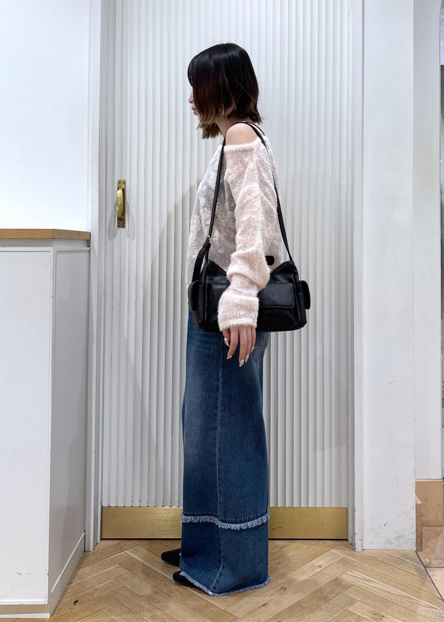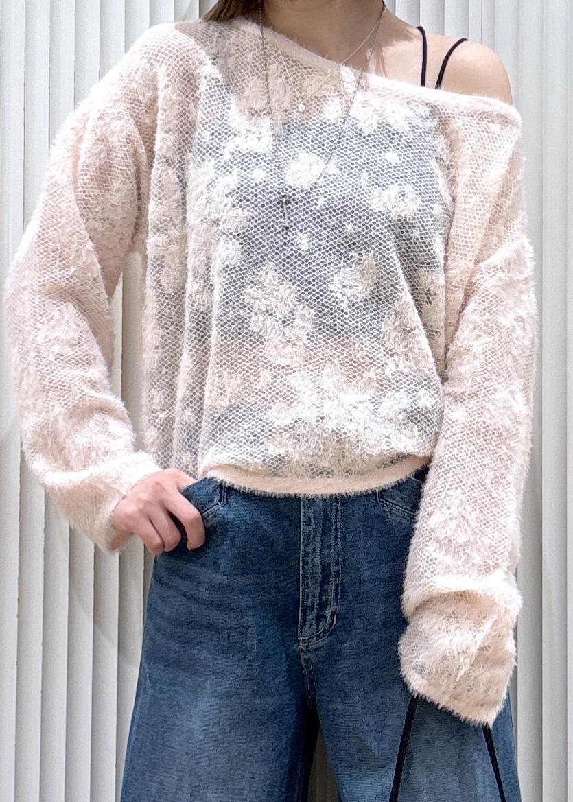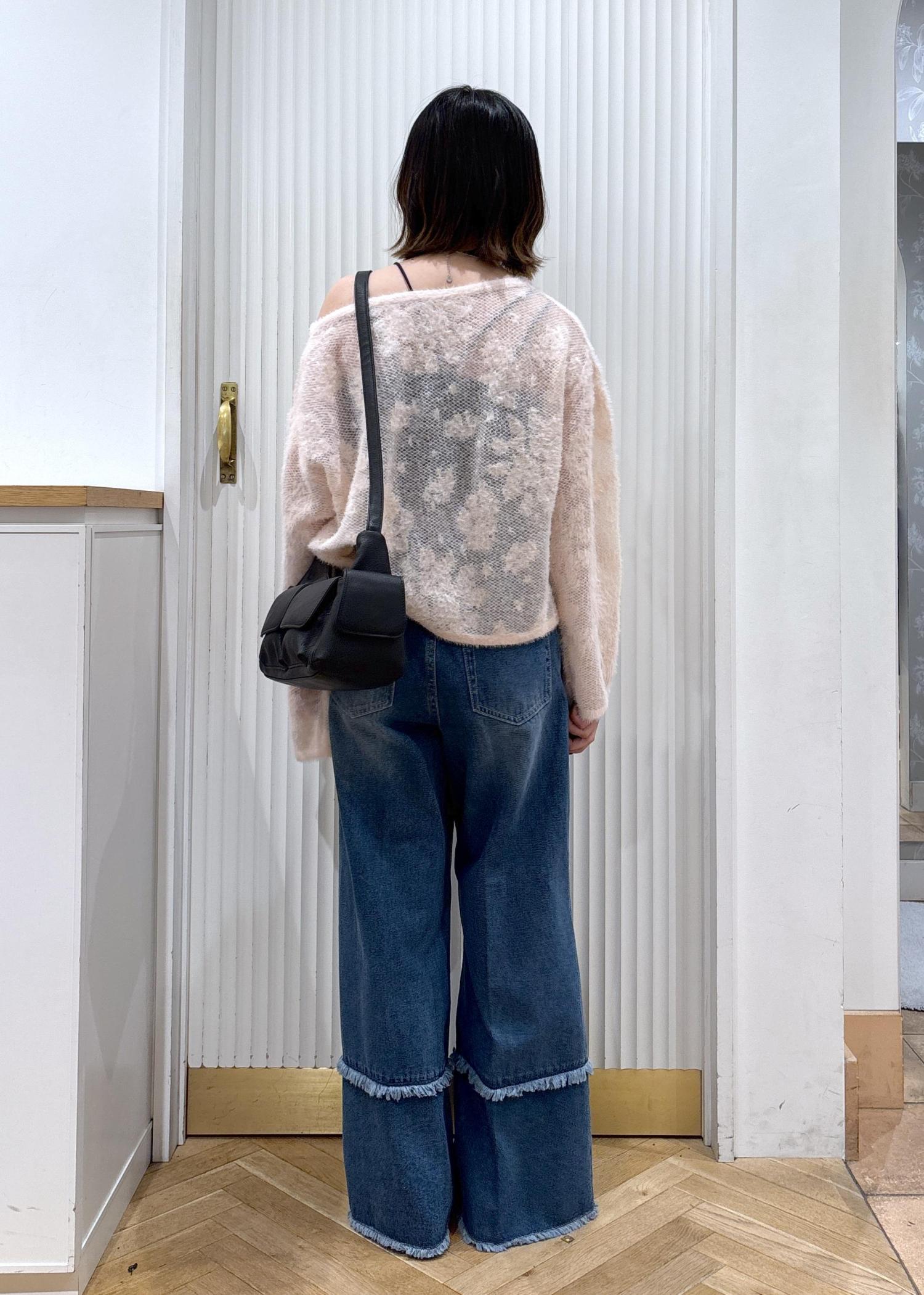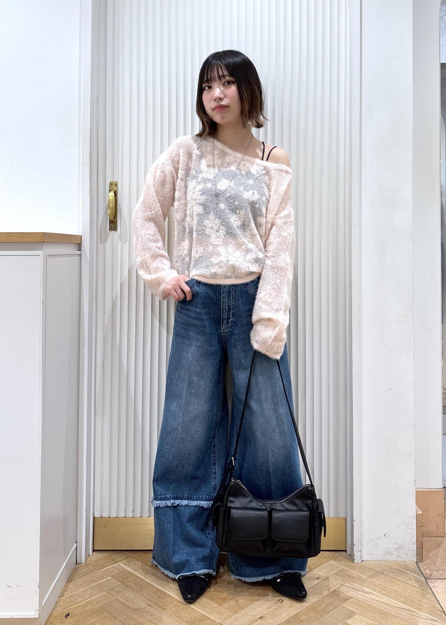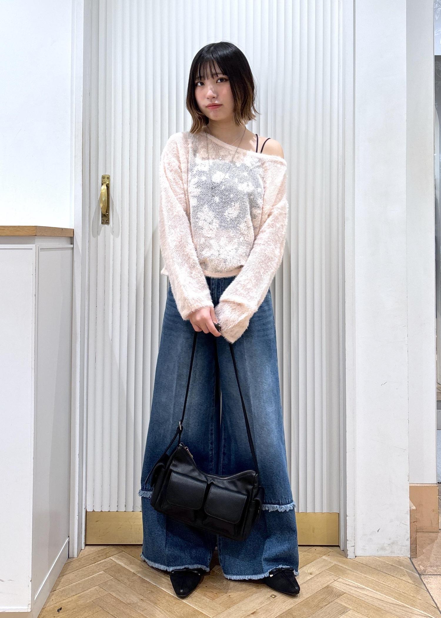ピンクのシアーニットにデニムを合わせたカジュアルコーデです!他のアイテムを黒にすることでコーディネートが締まり子供っぽくなりにくいです。またニットをワンショル風に着るのが◎