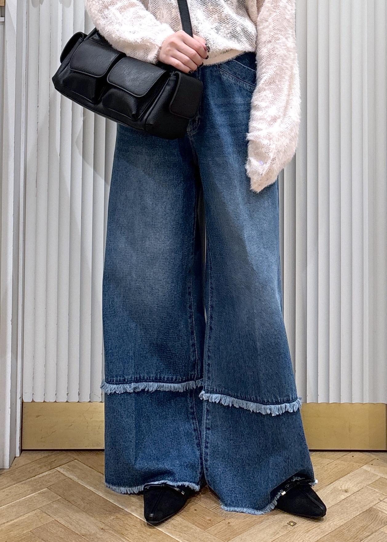VISフリンジフレアデニムブルー系 / S¥4,395レビュー153センチ着用でヒールを履いてギリギリ引きずらない丈感でした。