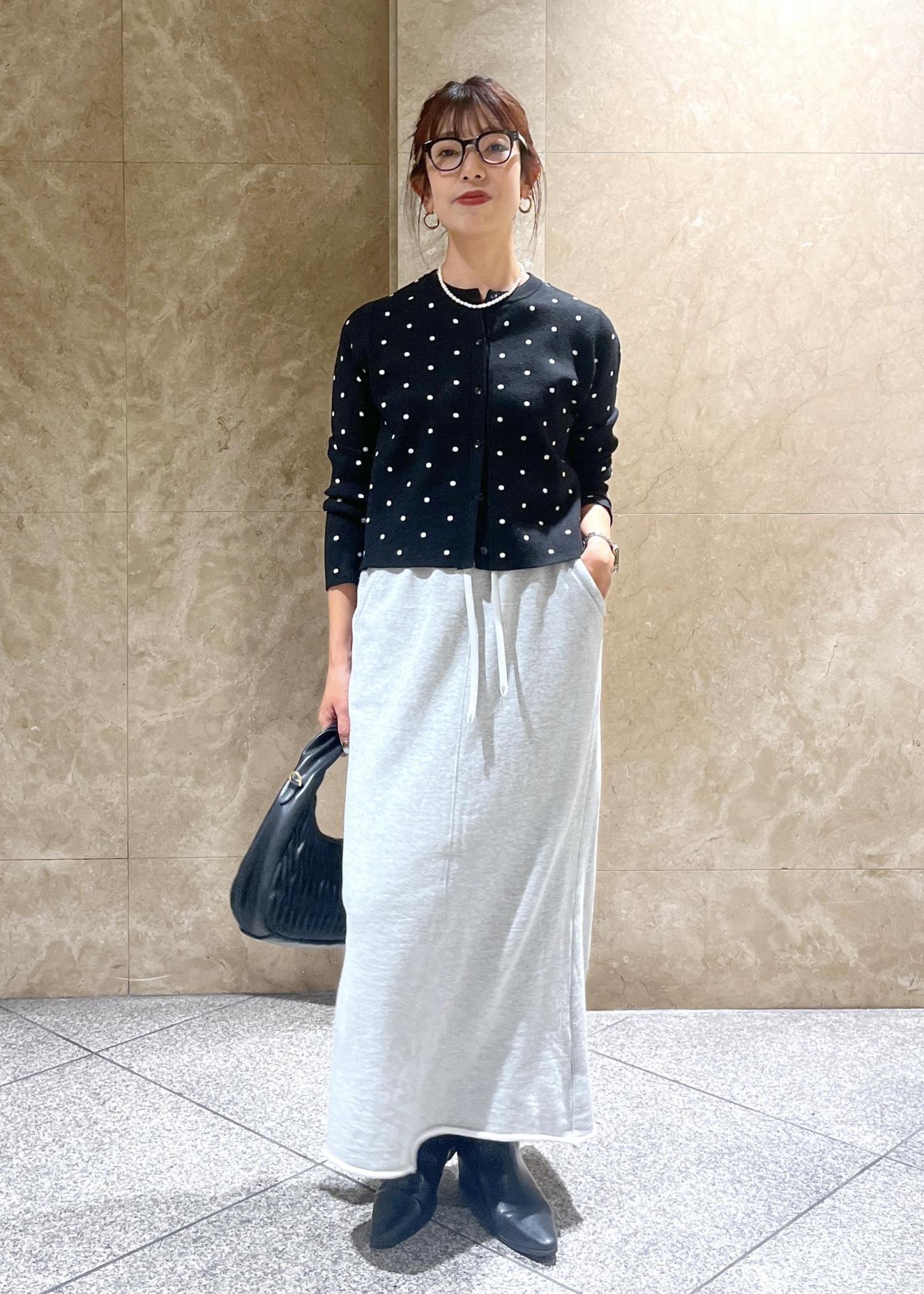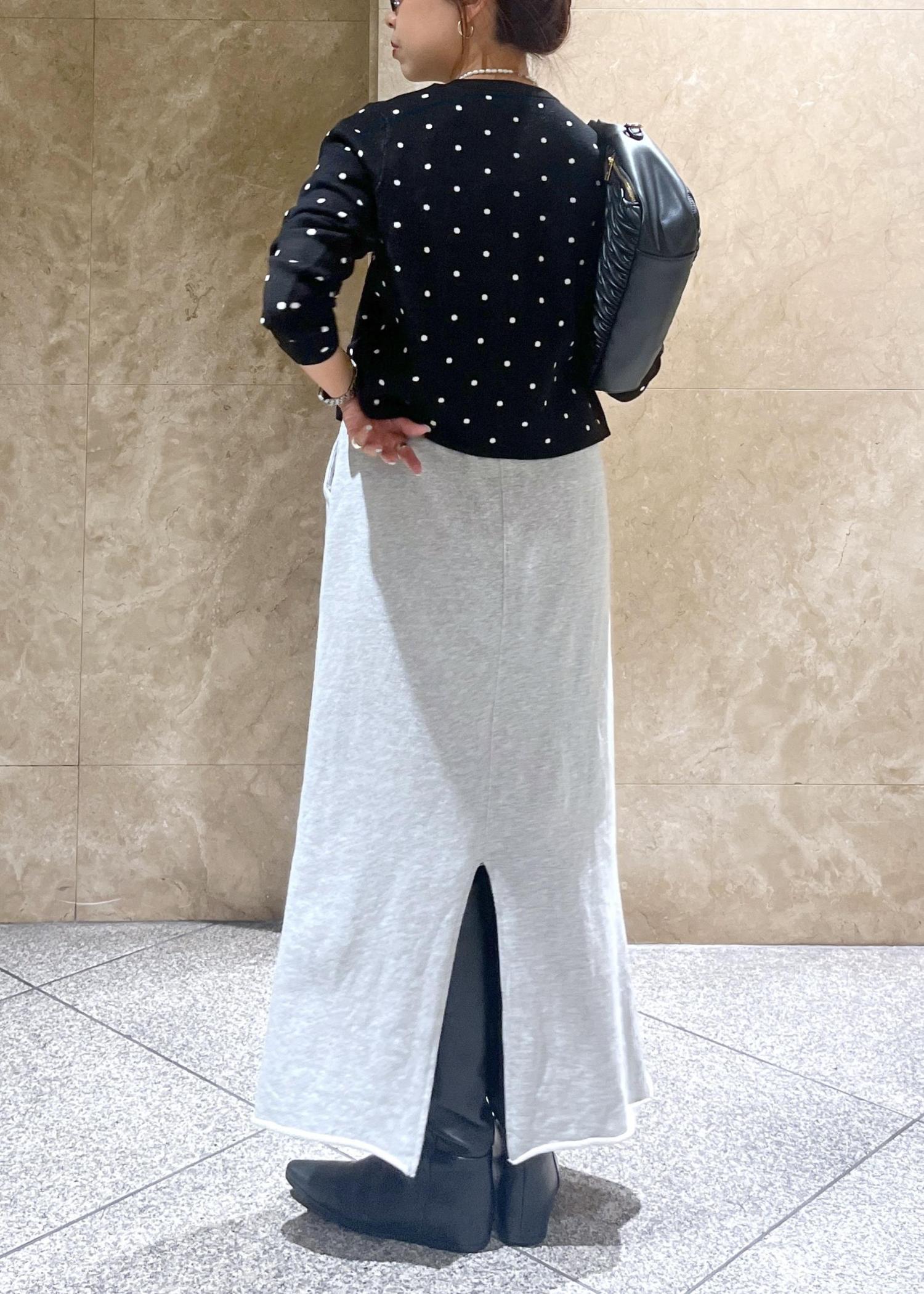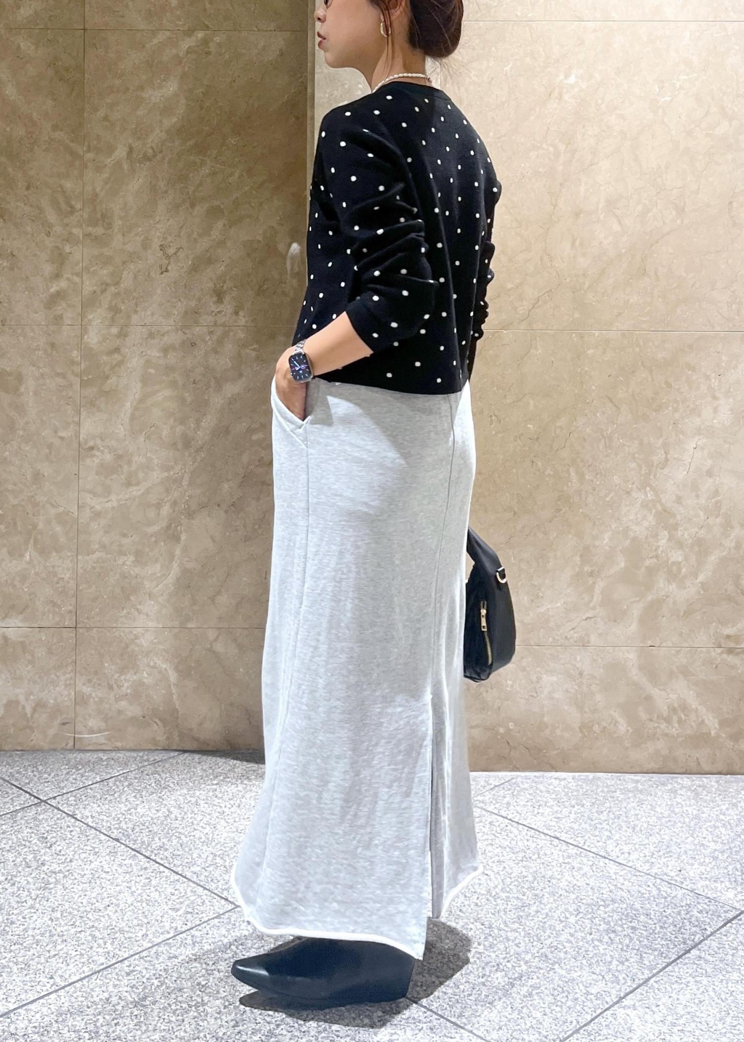 スウェットの楽な着心地はもちろんのこと、タイトすぎないながらすっきりとしたシルエット、後ろの深めのスリットでほどよい抜け感もあり、女性らしく着用できます。 -
