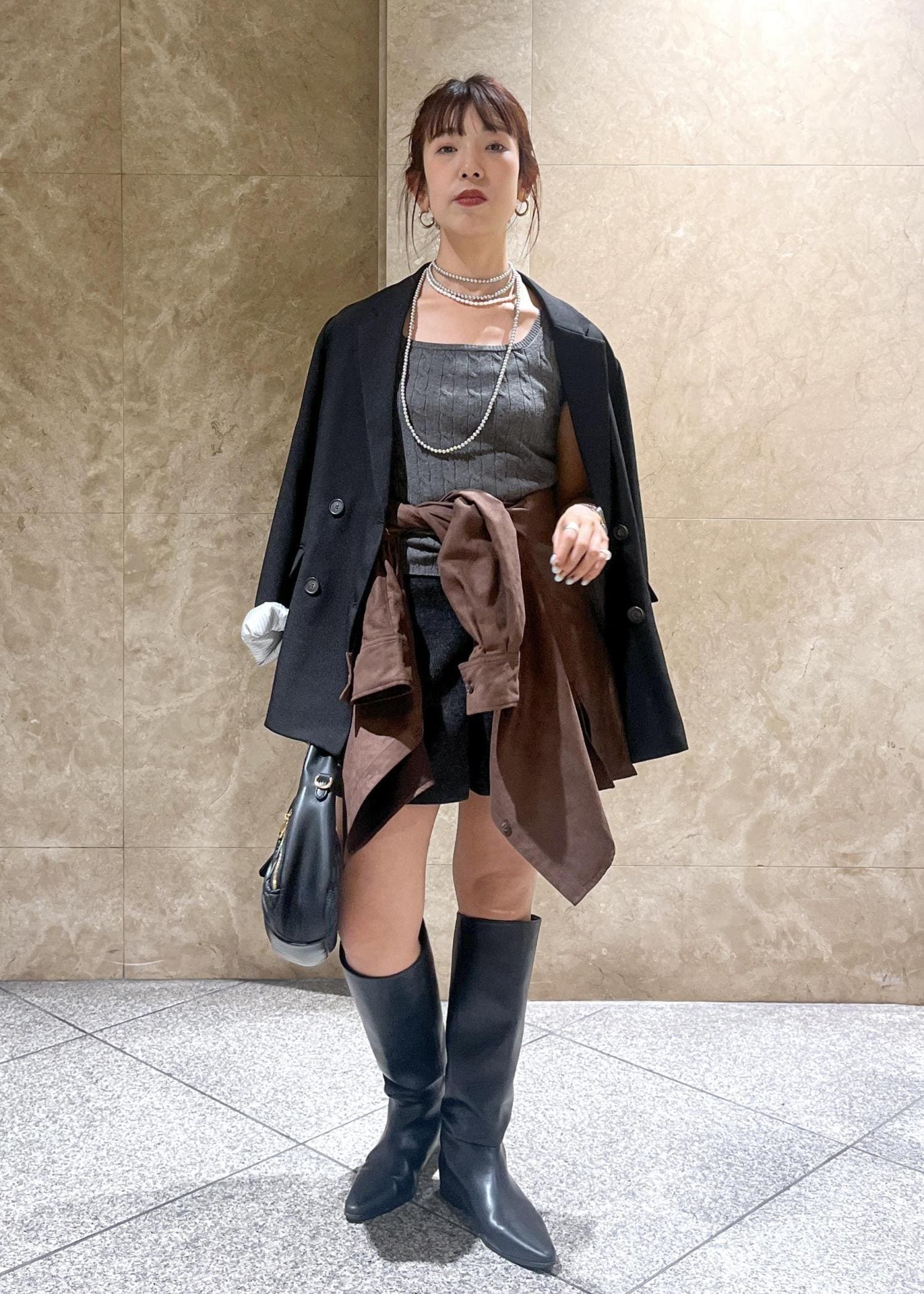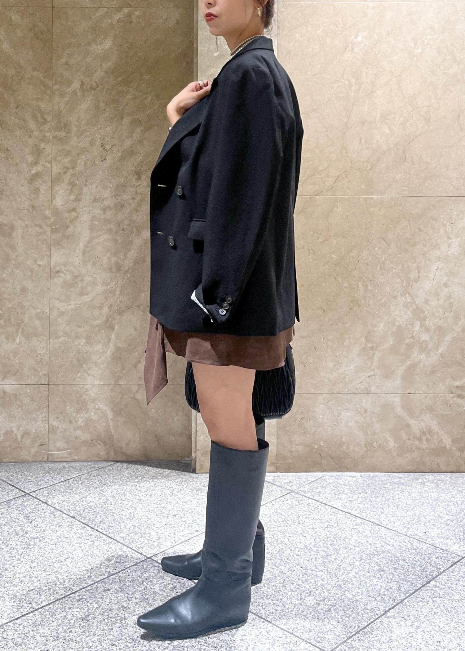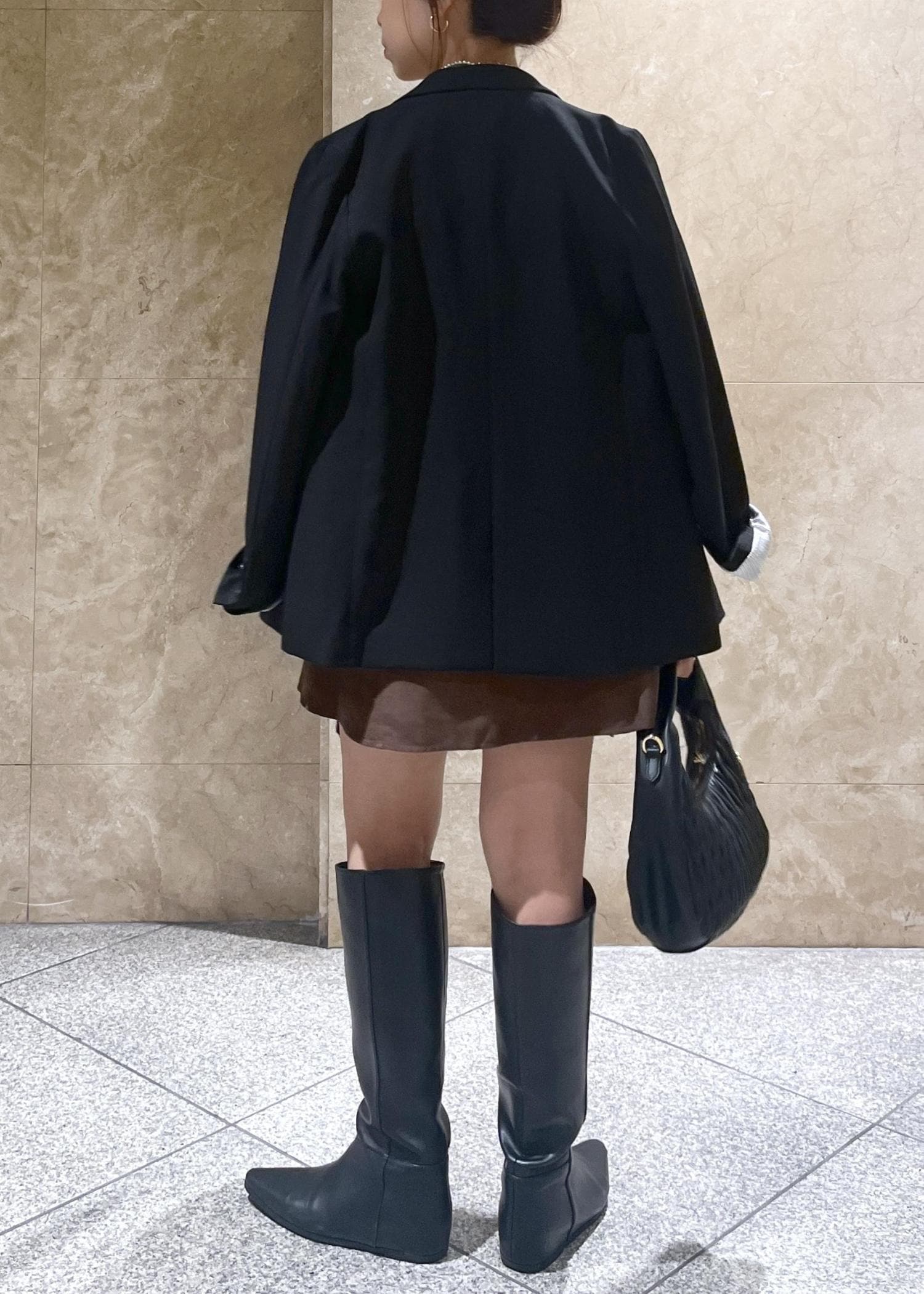着丈はコンパクトなミニ丈なので、脚はもちろん出るのですが、ロングブーツを合わせた時のスタイルバランスは抜群で、裾が少し広がり太ももまわりにちゃんと隙間ができるので、細見え効果も◎