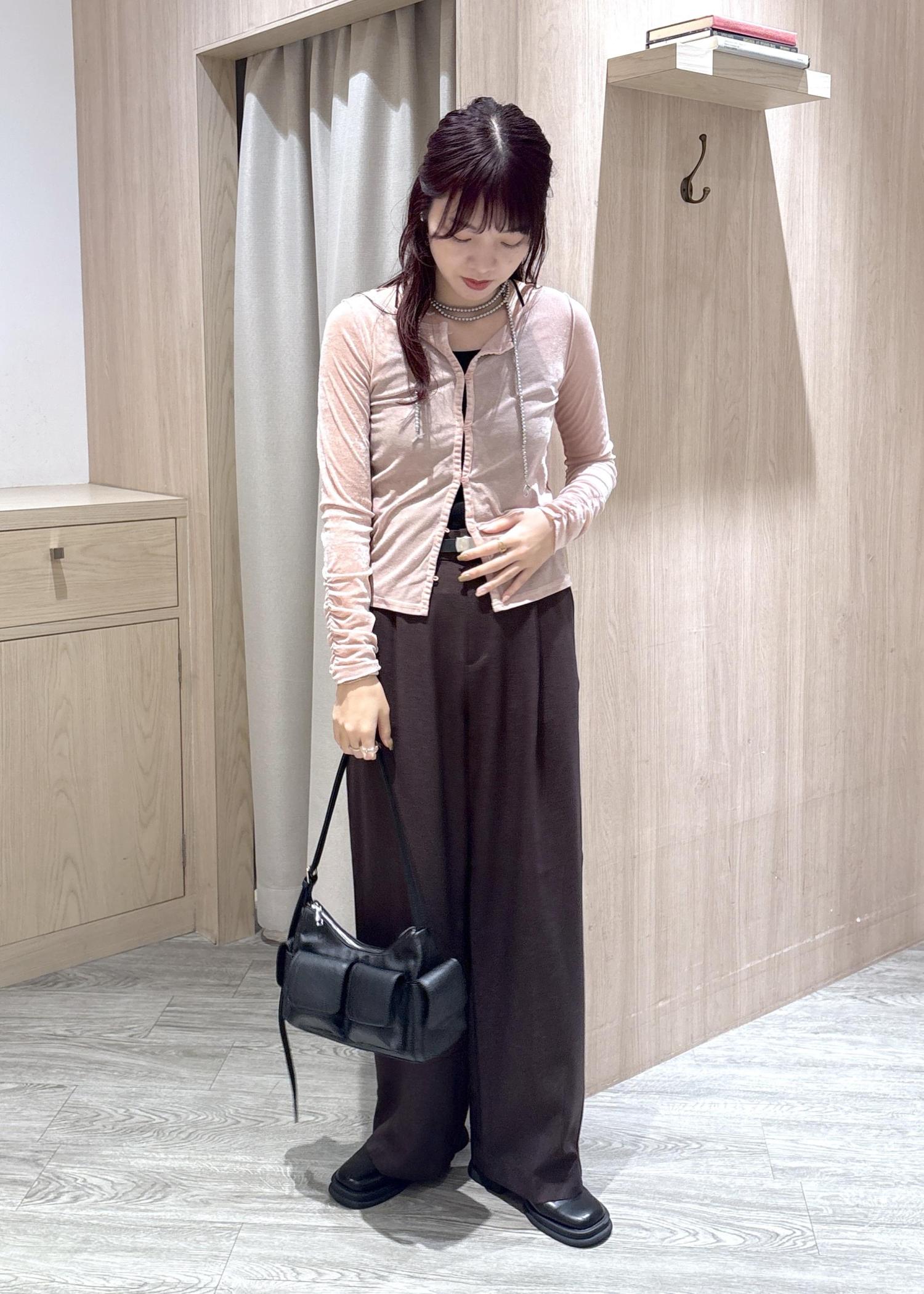 可愛いカラーのピンクも甘くなりすぎないように、ブラウンのワイドパンツにブラックの小物を合わせました!
