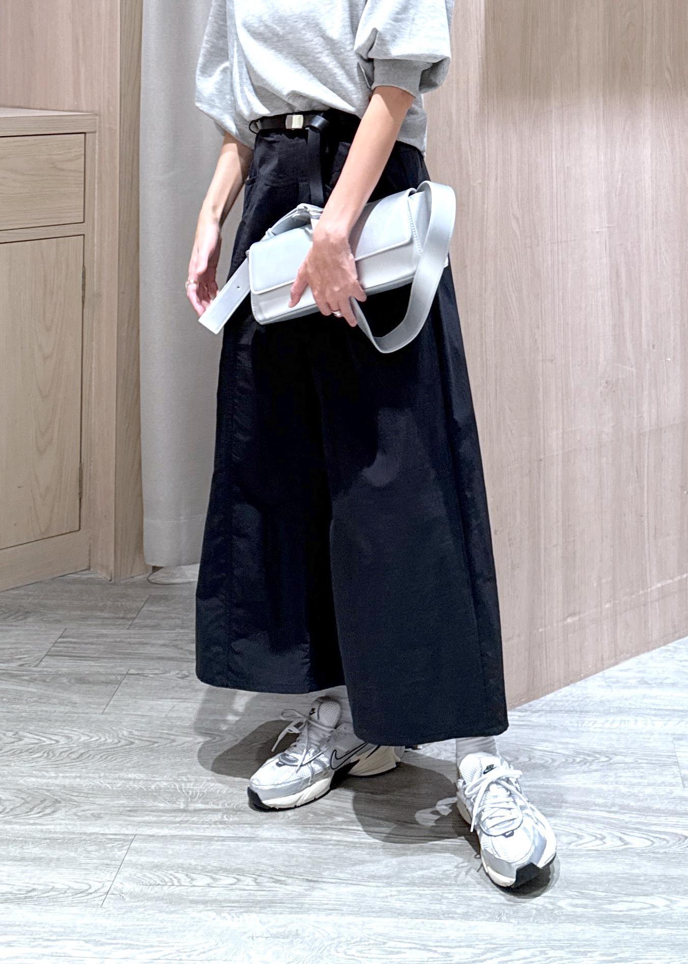 ナイロン混のシャカシャカした素材のフレアスカートです。