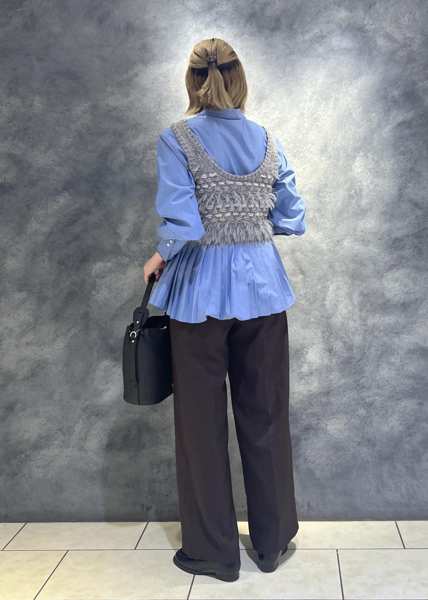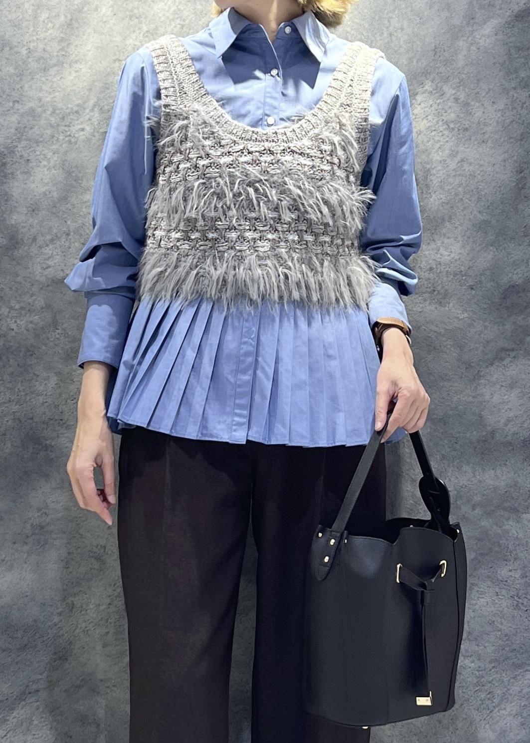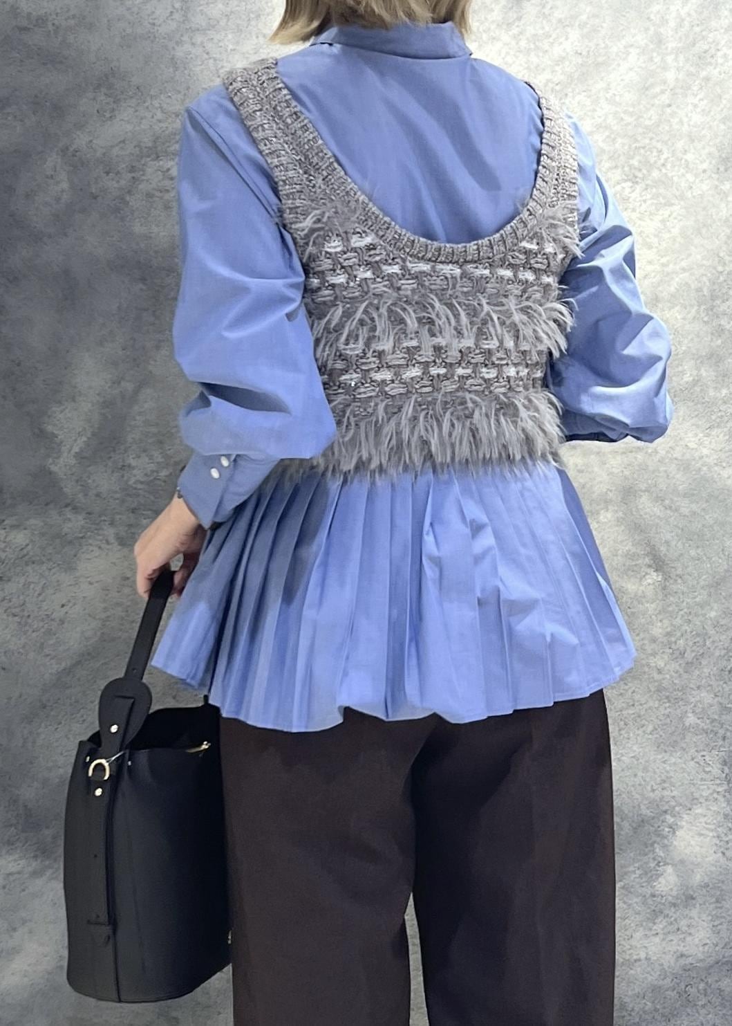 VISフェザーツイードニットビスチェ/2WAYグレー / F¥5,489レビューファーベストはボリューム出過ぎずてしまって苦手という方に是非レイヤードで着用して欲しいビスチェです。