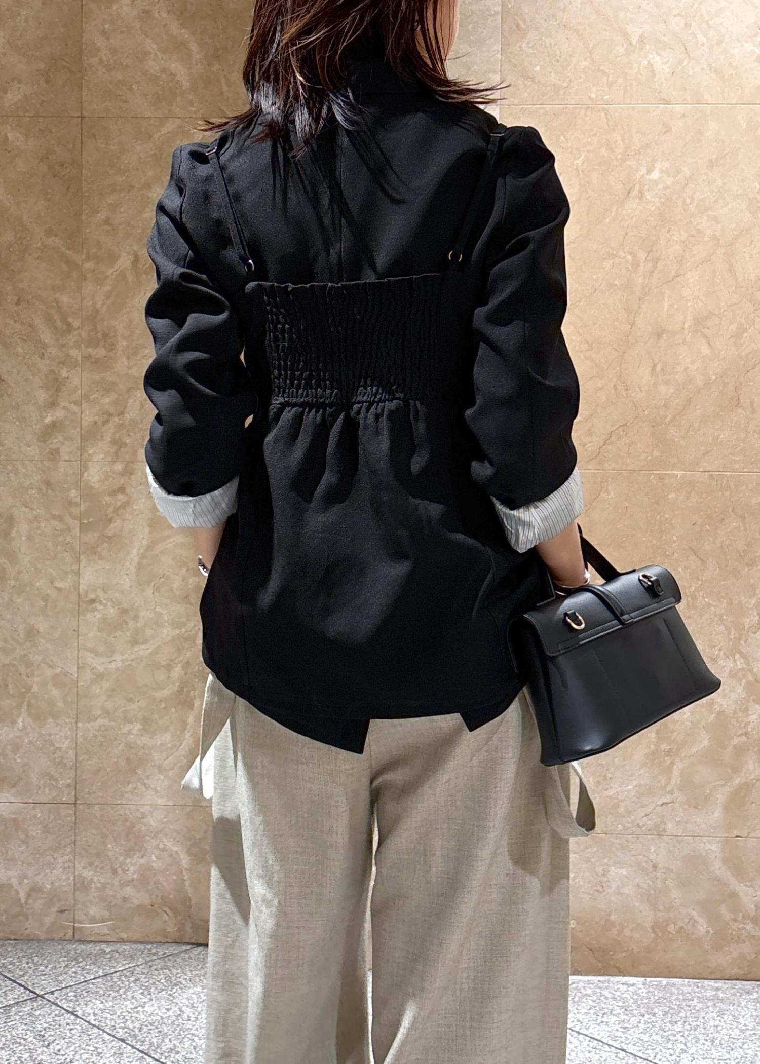 程よくゆとりのあるサイズ感ですが肩周りは落としたデザインではなくスッキリしているので、お仕事など少しフォーマルな場面でも使えるキレイめ見えジャケットです。 -