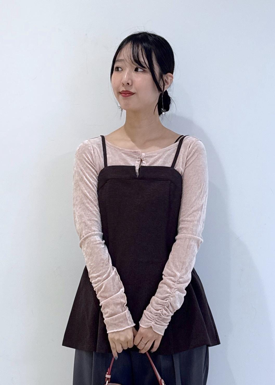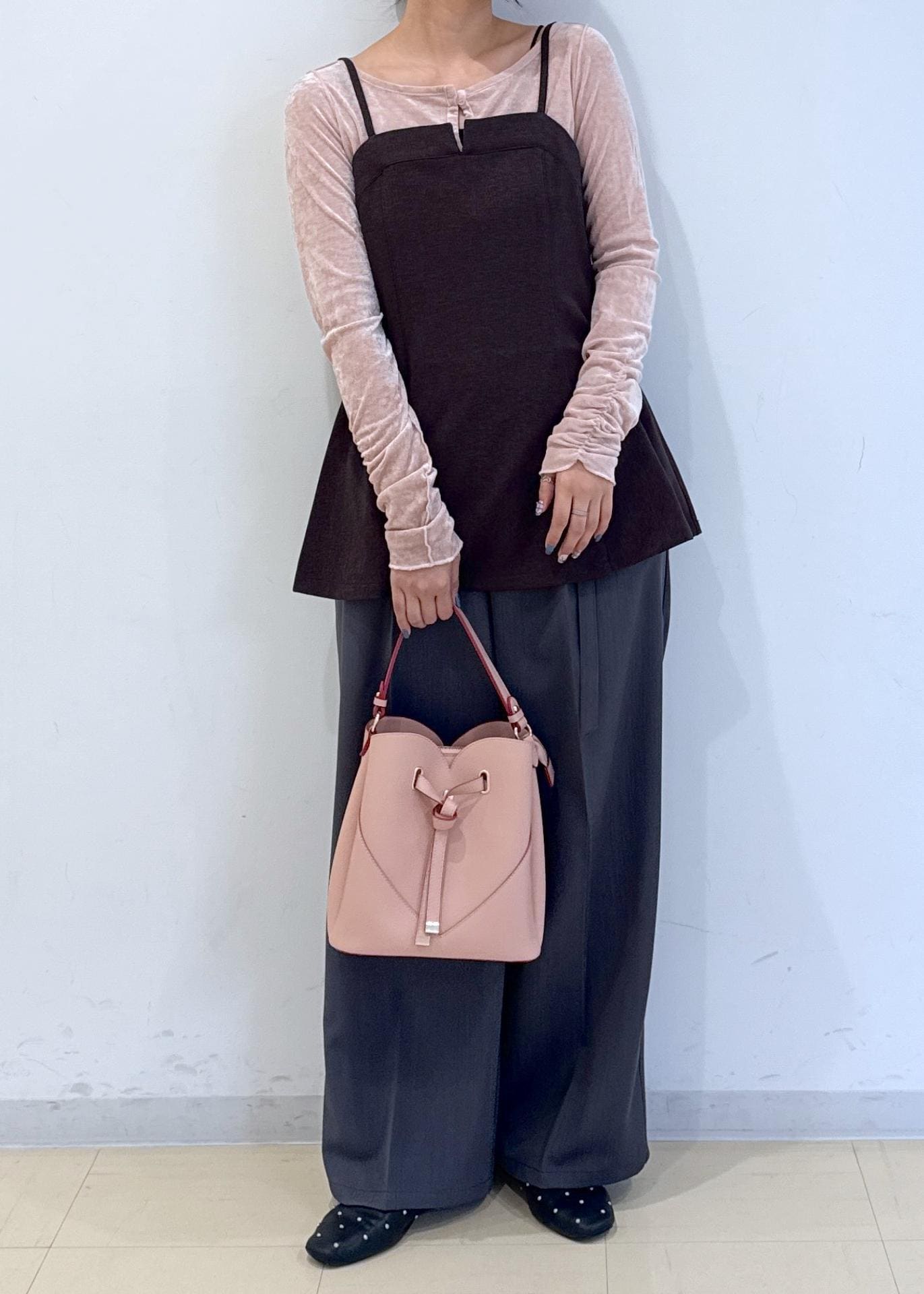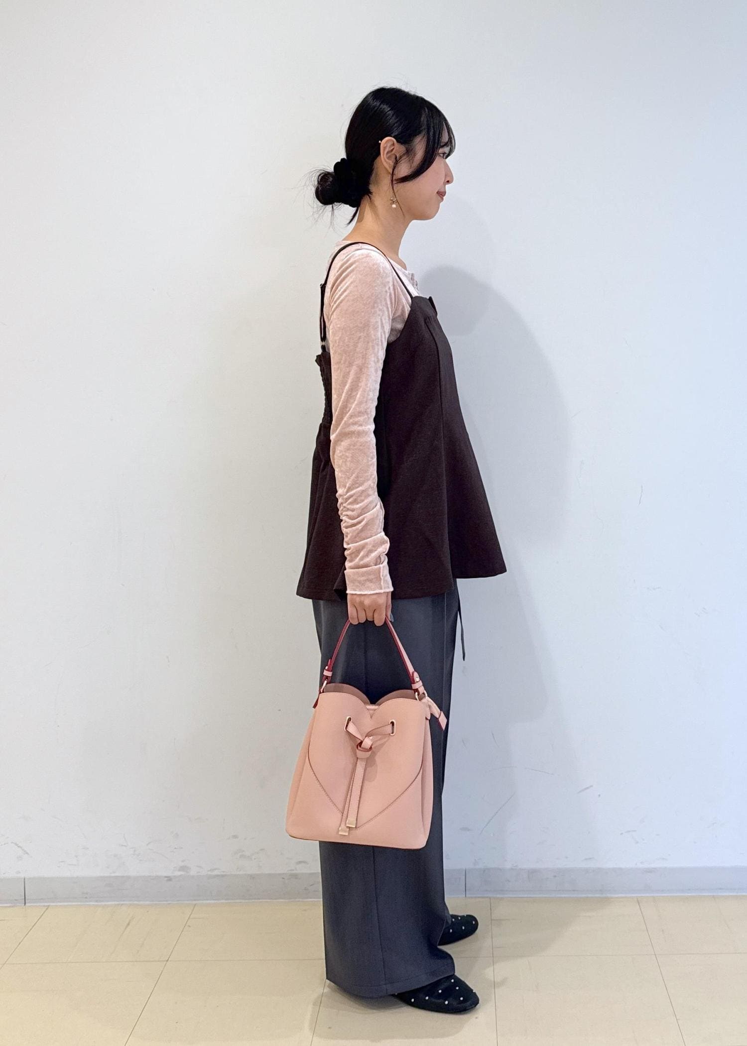 ダークブラウンとピンクの組み合わせが最強なコーデです