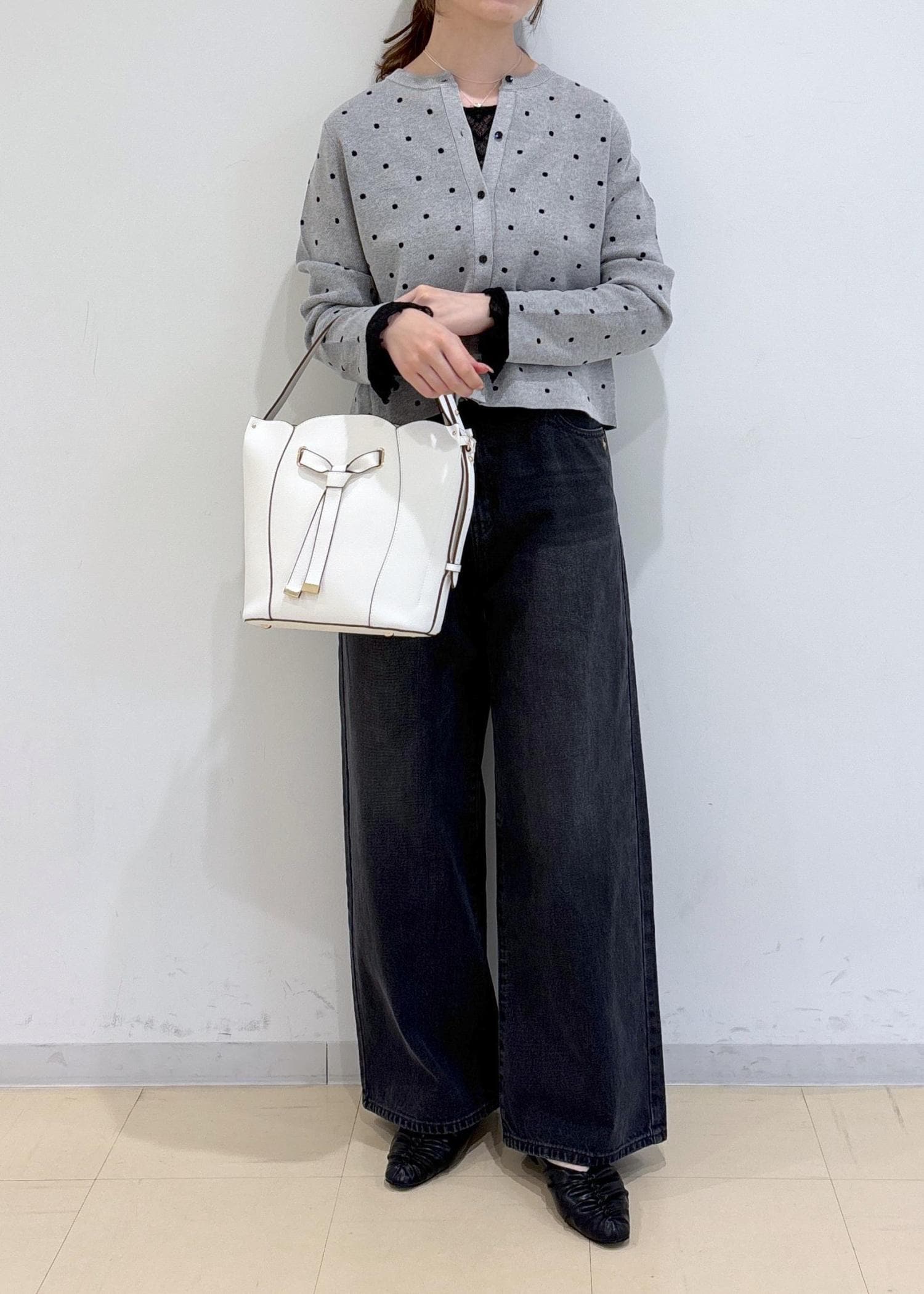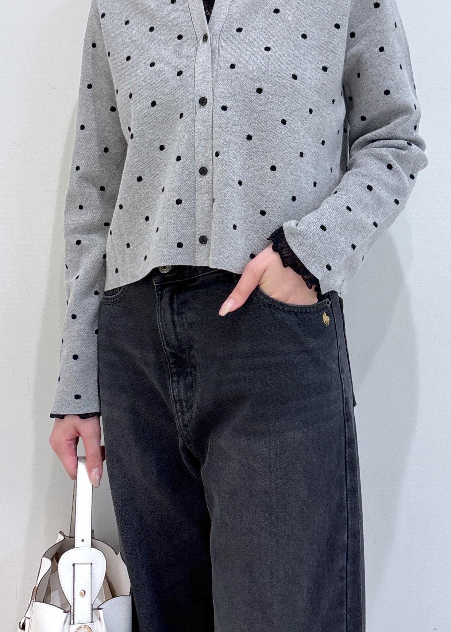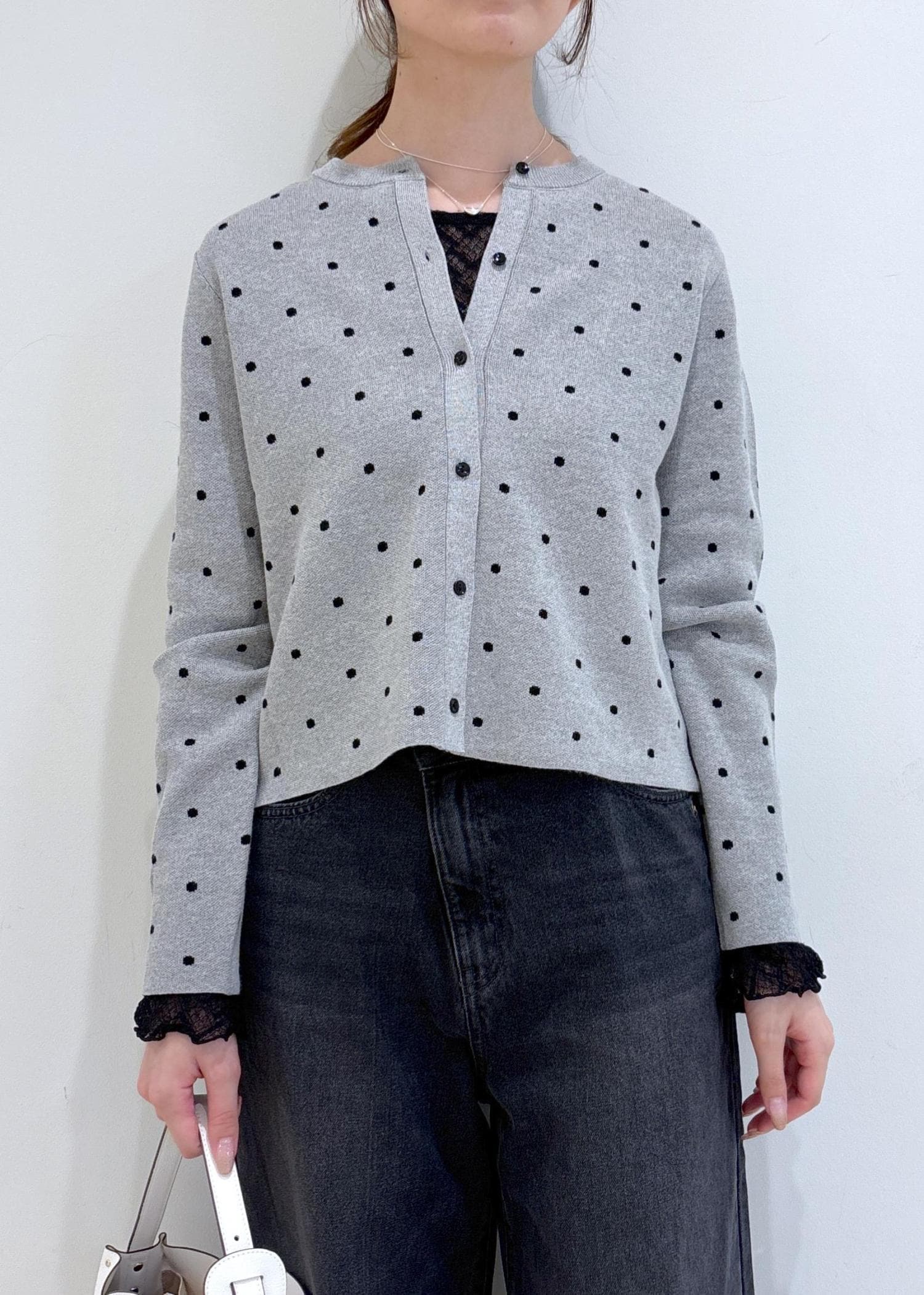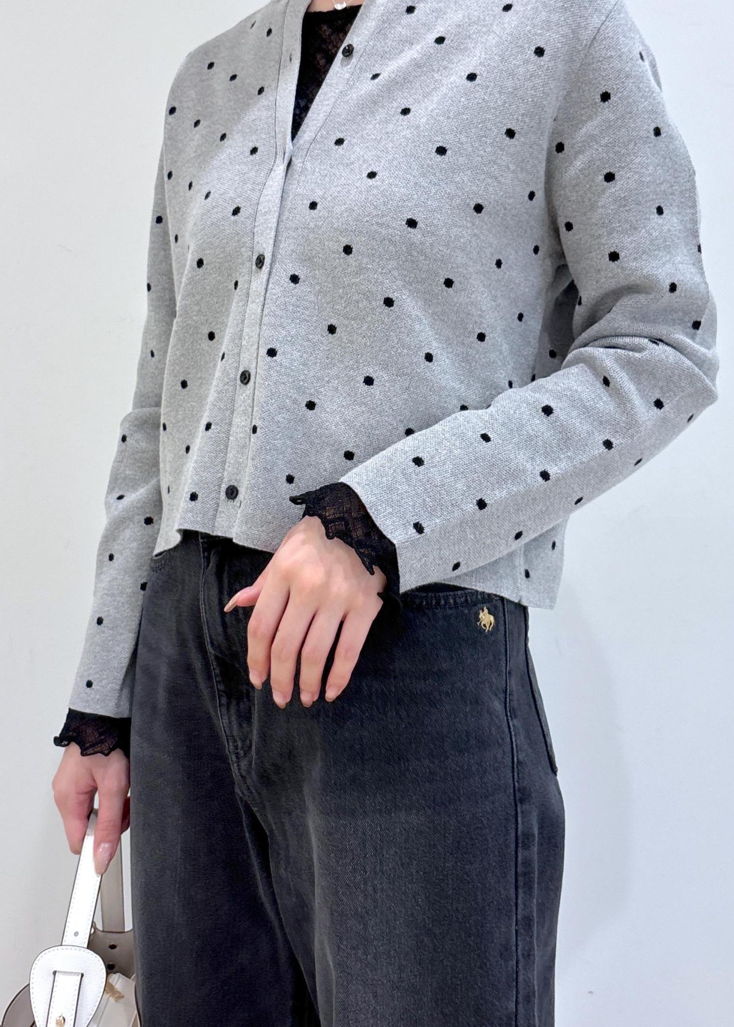 ドット柄のカーディガンが主役の大人可愛いコーディネートです。