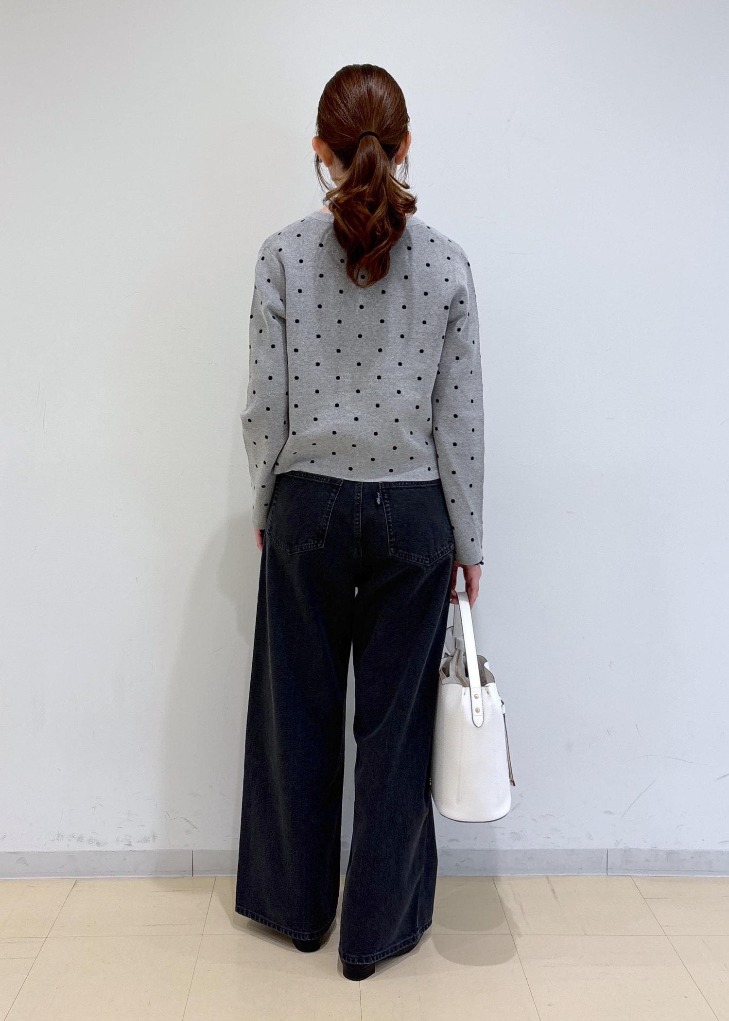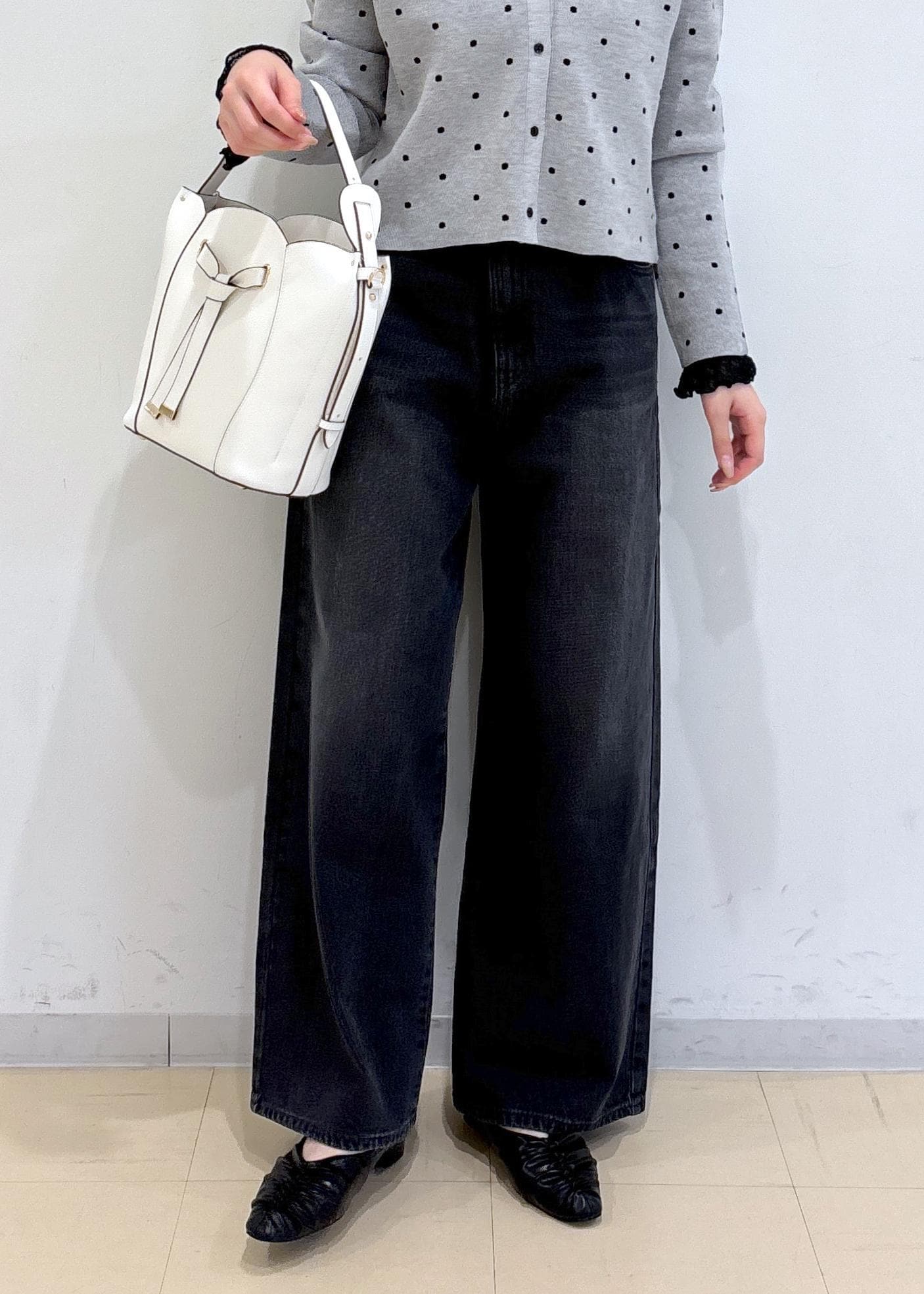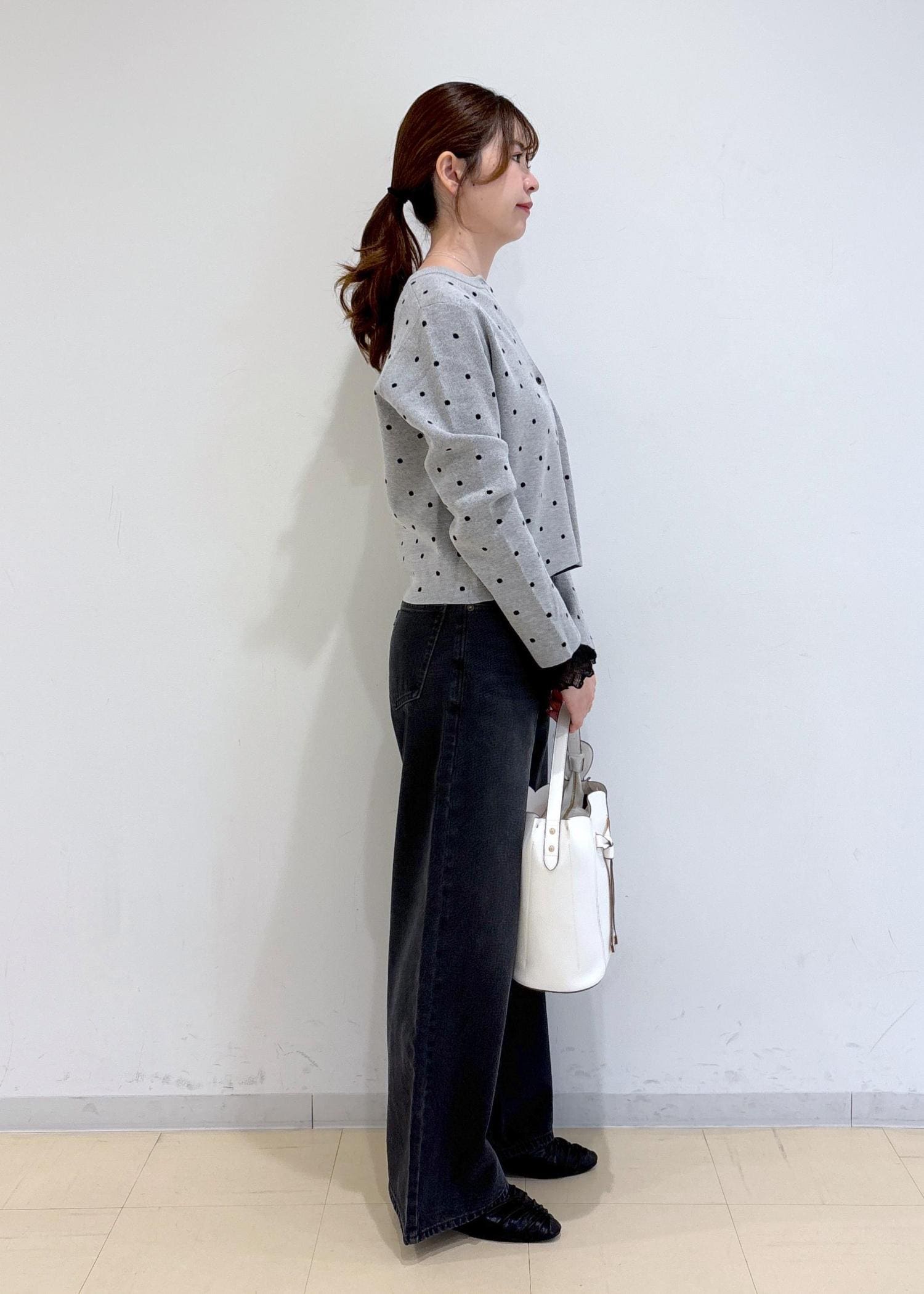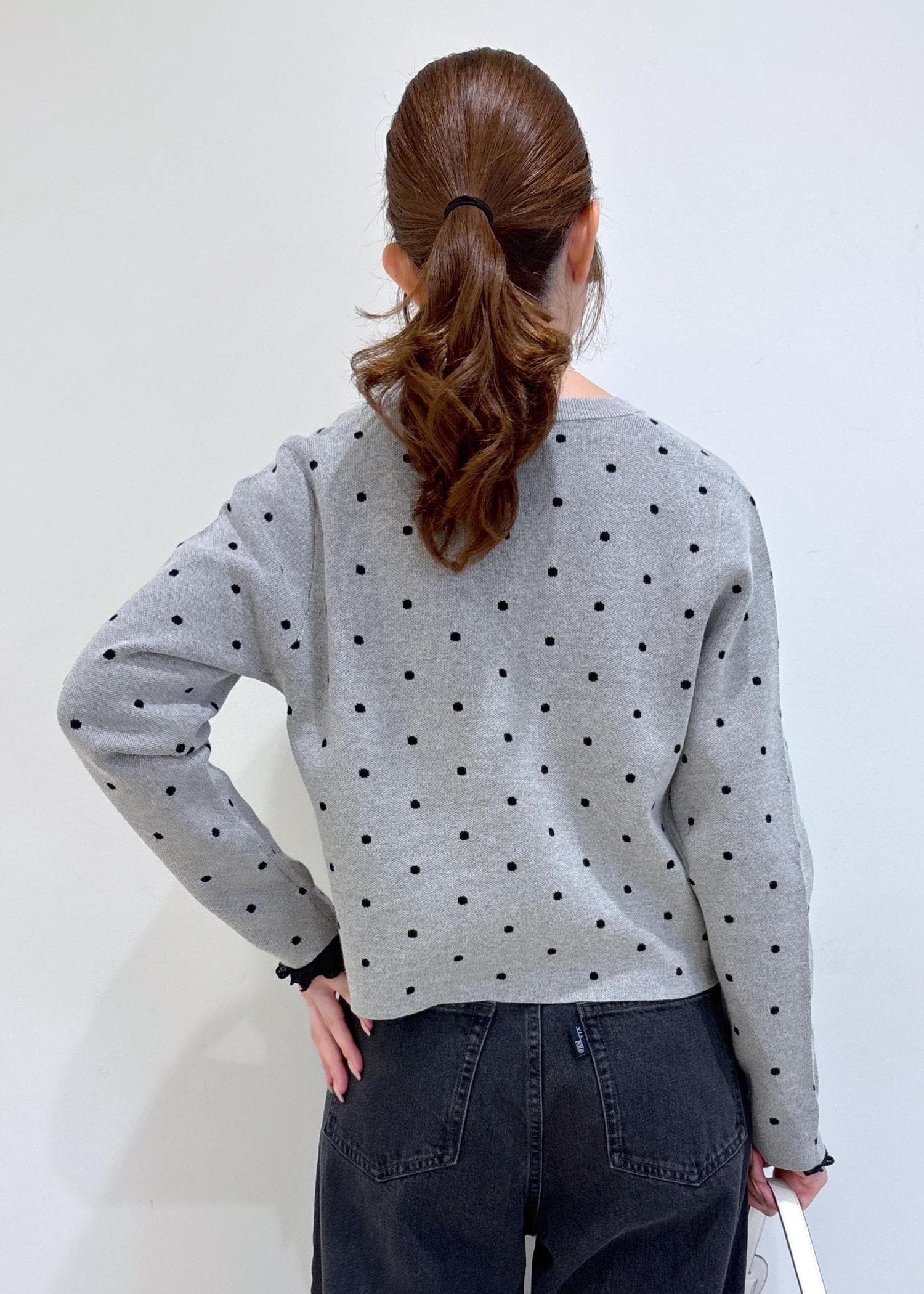 ドット柄のカーディガンが主役の大人可愛いコーディネートです。