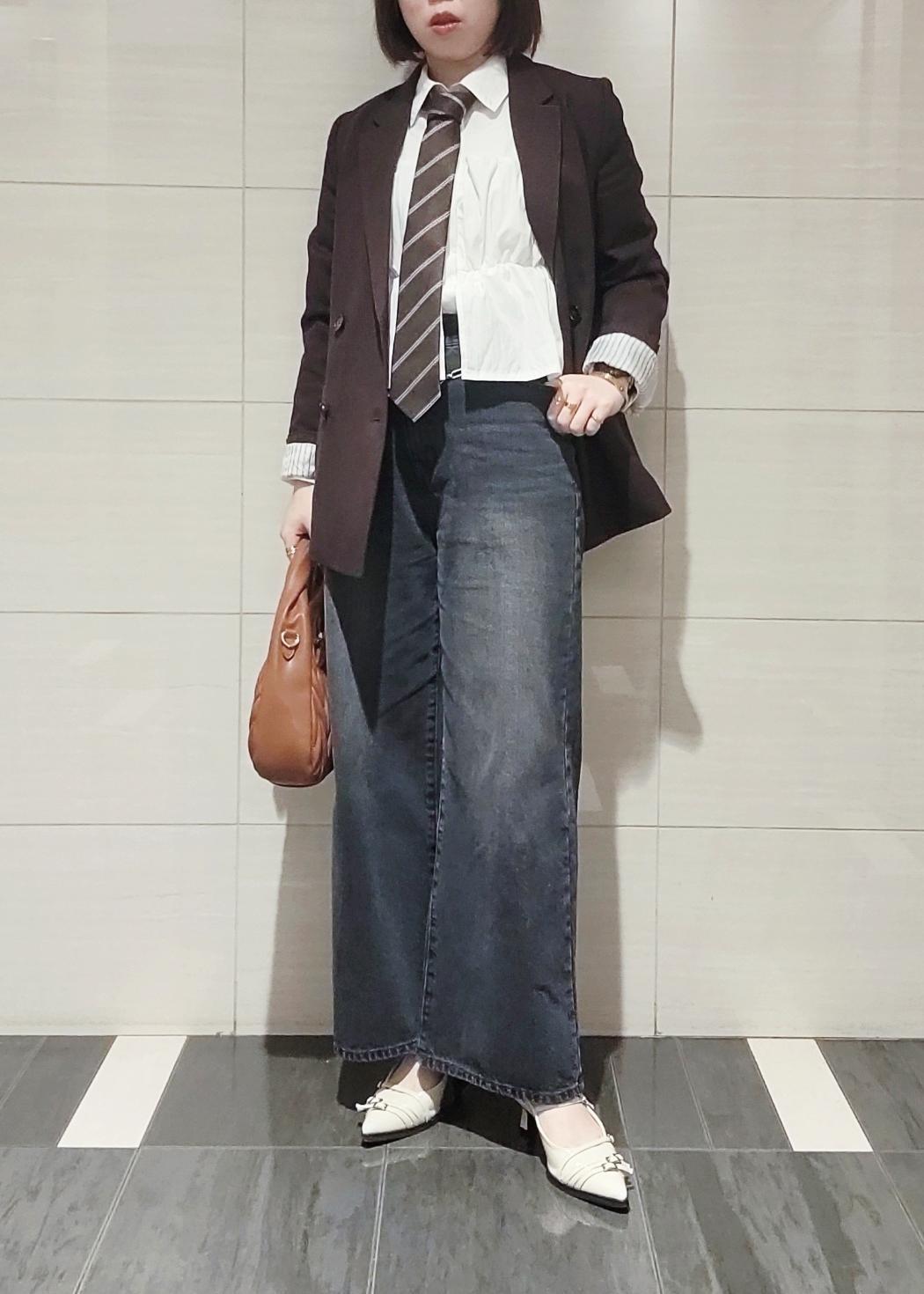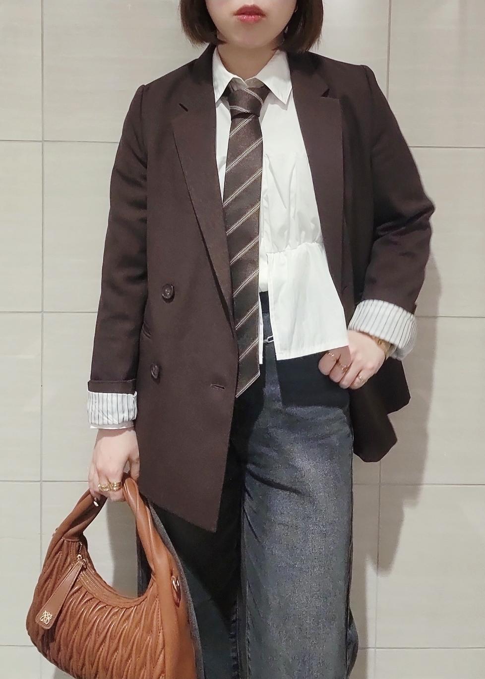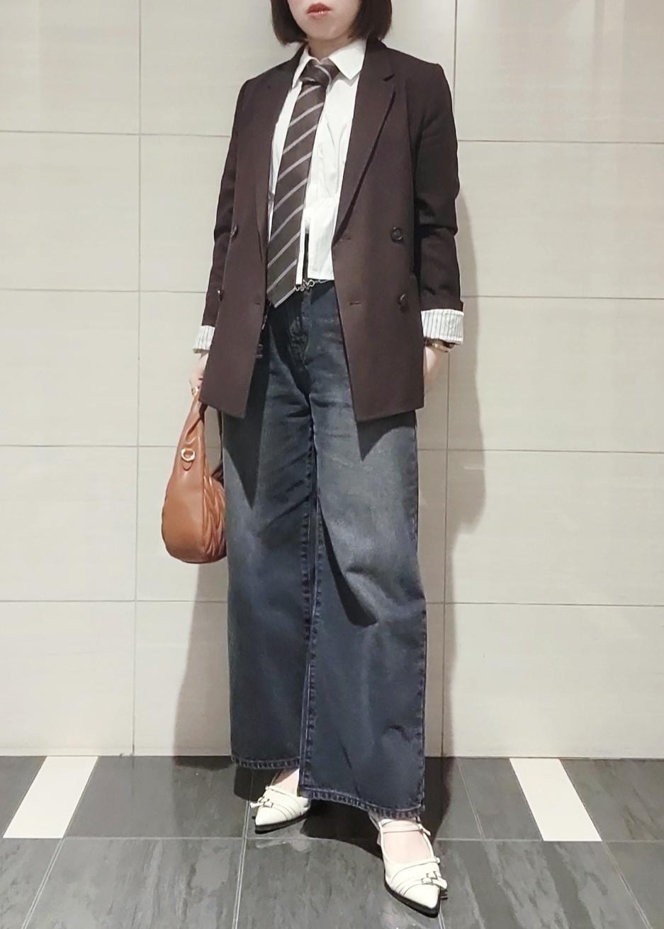 タイドアップスタイルのマニッシュさの中にフリル感のあるブラウスやミュールを合わせてレディな雰囲気に組み合わせました♪