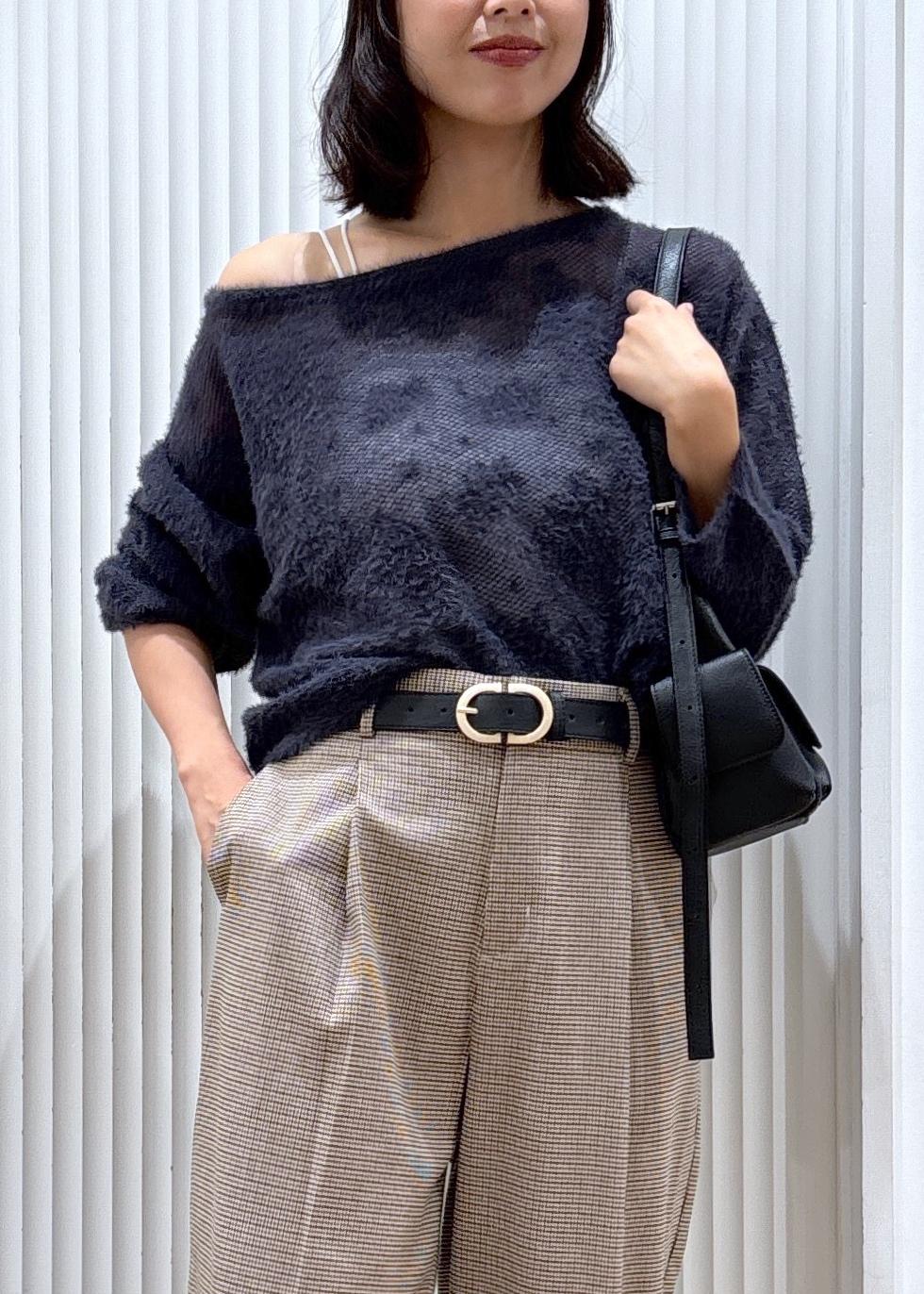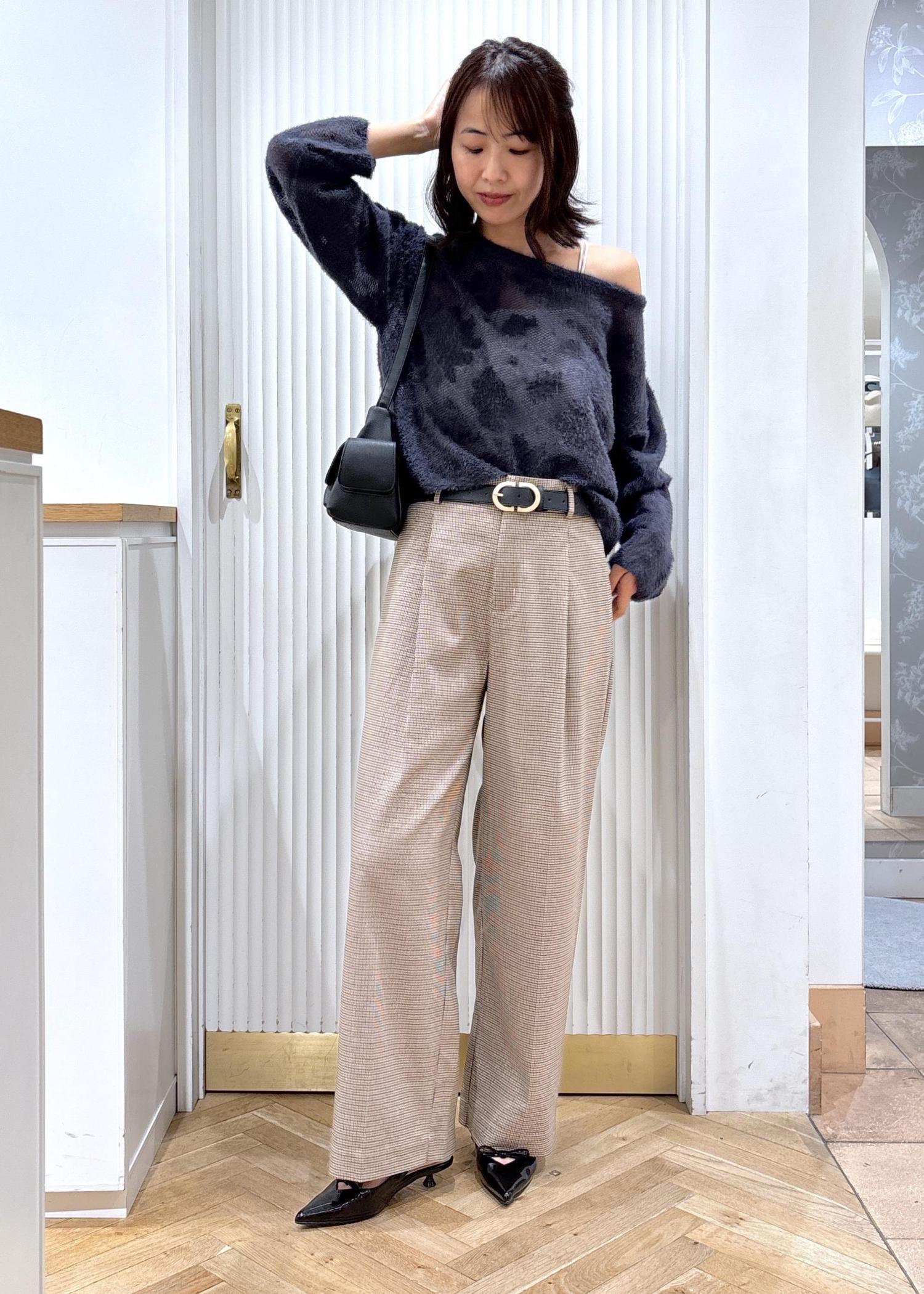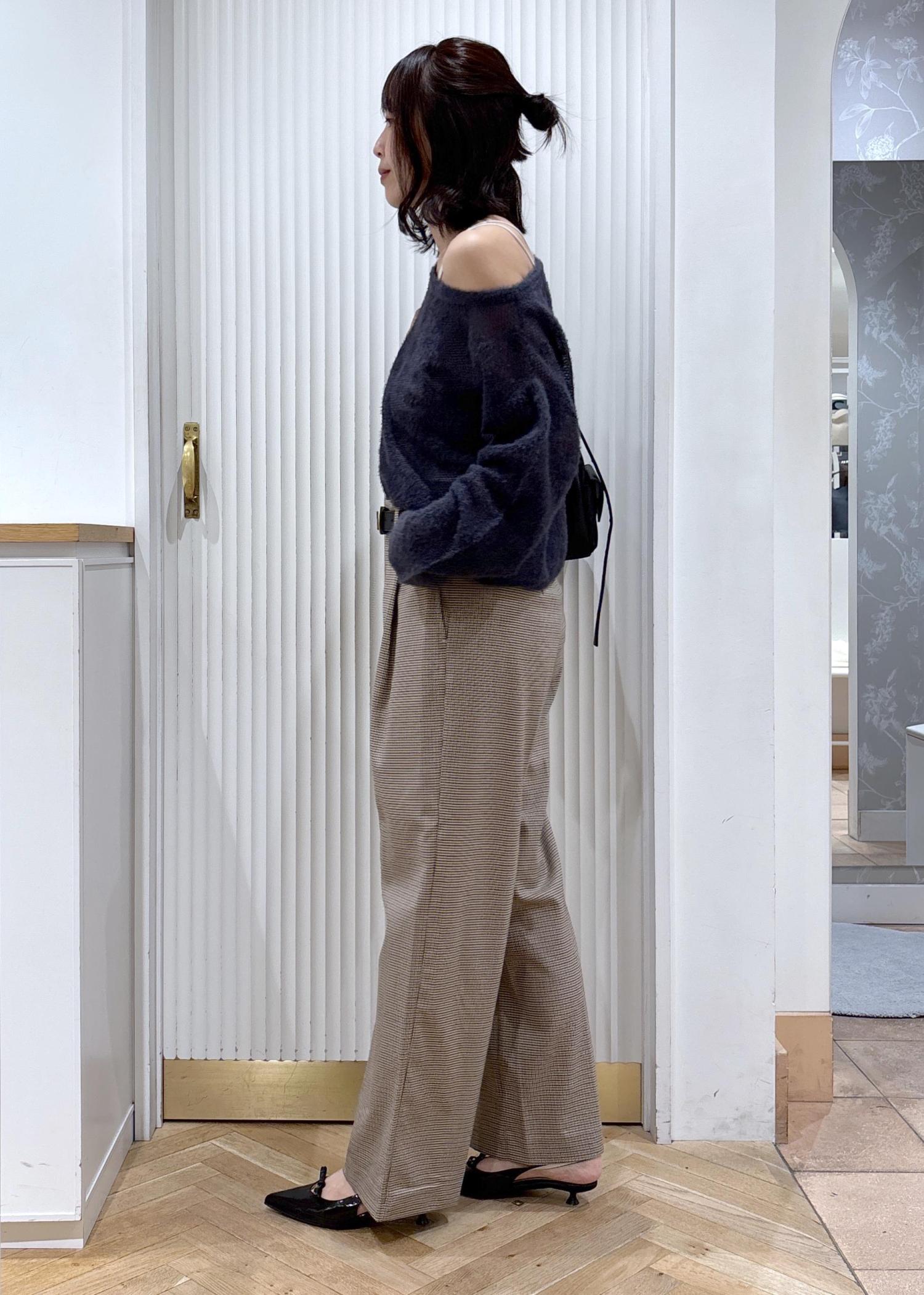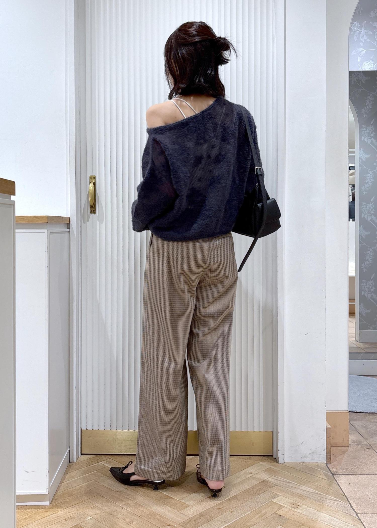 透け感があるネイビーのニットにチェックのパンツを合わせたスタイリングです。