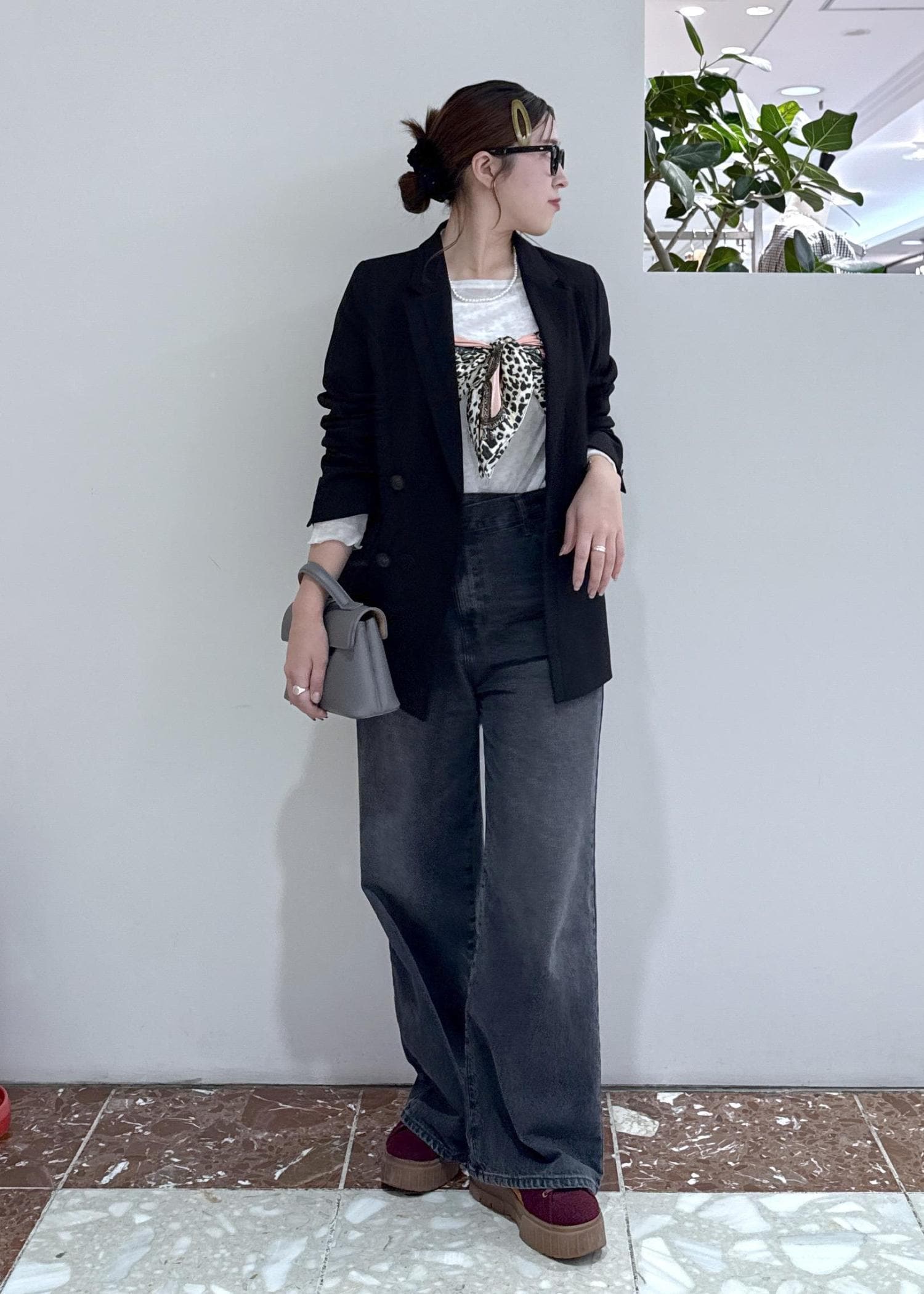 シューズとスカーフのカラーを合わせてまとまりのあるスタイリングにしました。