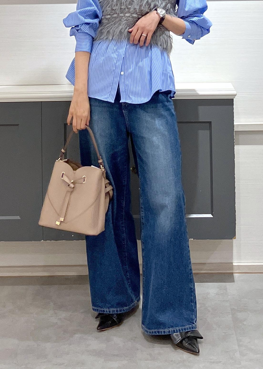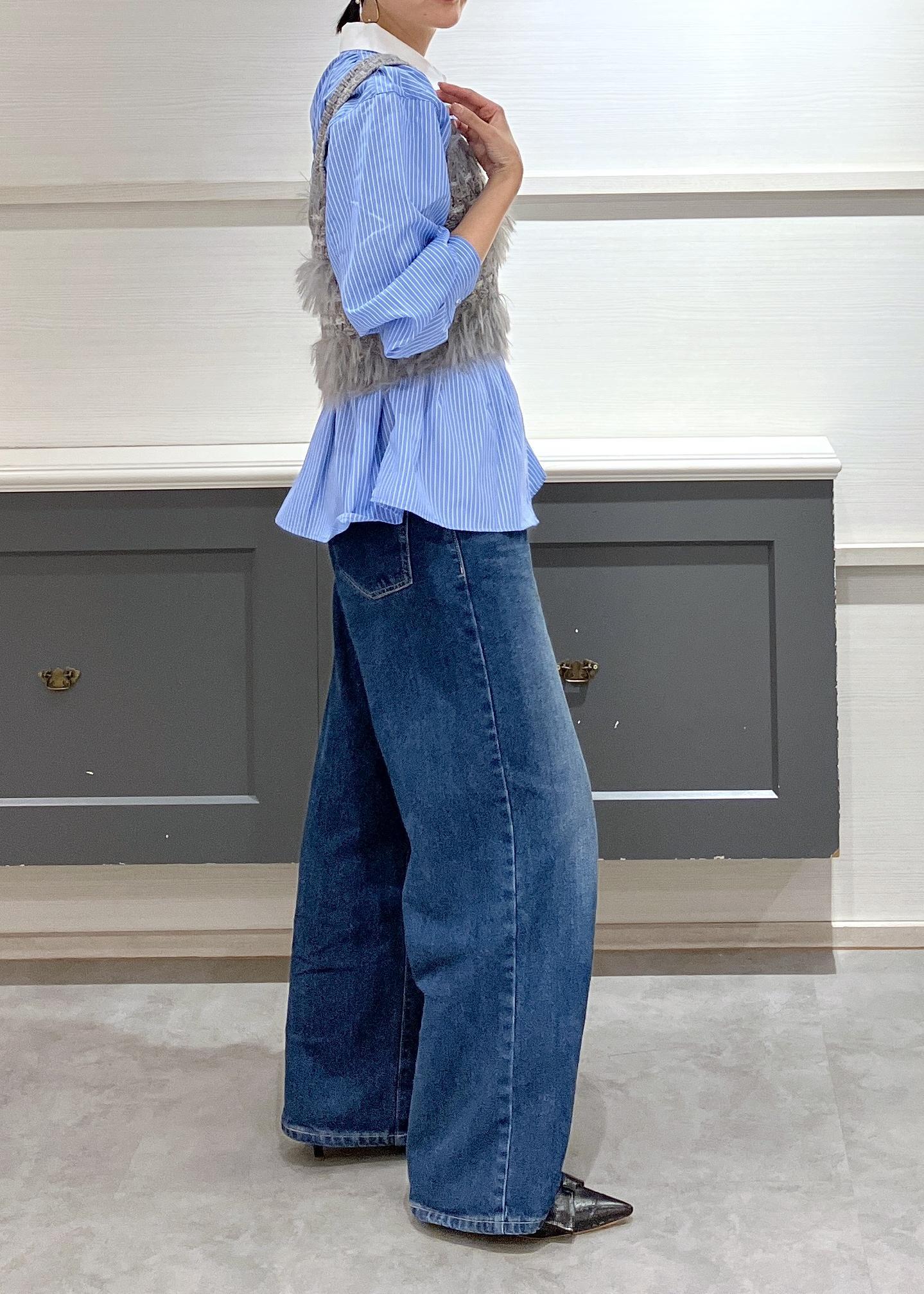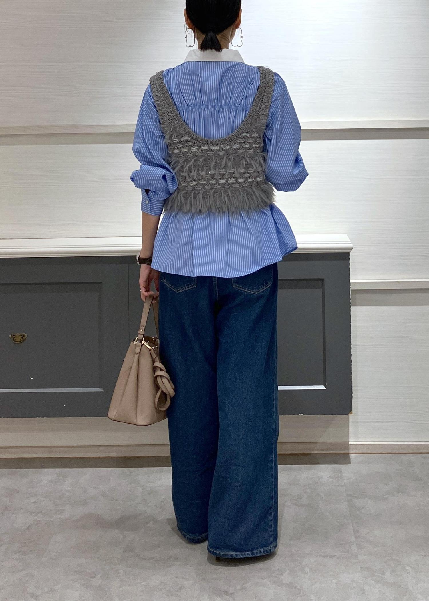 ブラウスとデニムのブルーのワントーンに今年トレンドのフリンジビスチェを合わせました♩