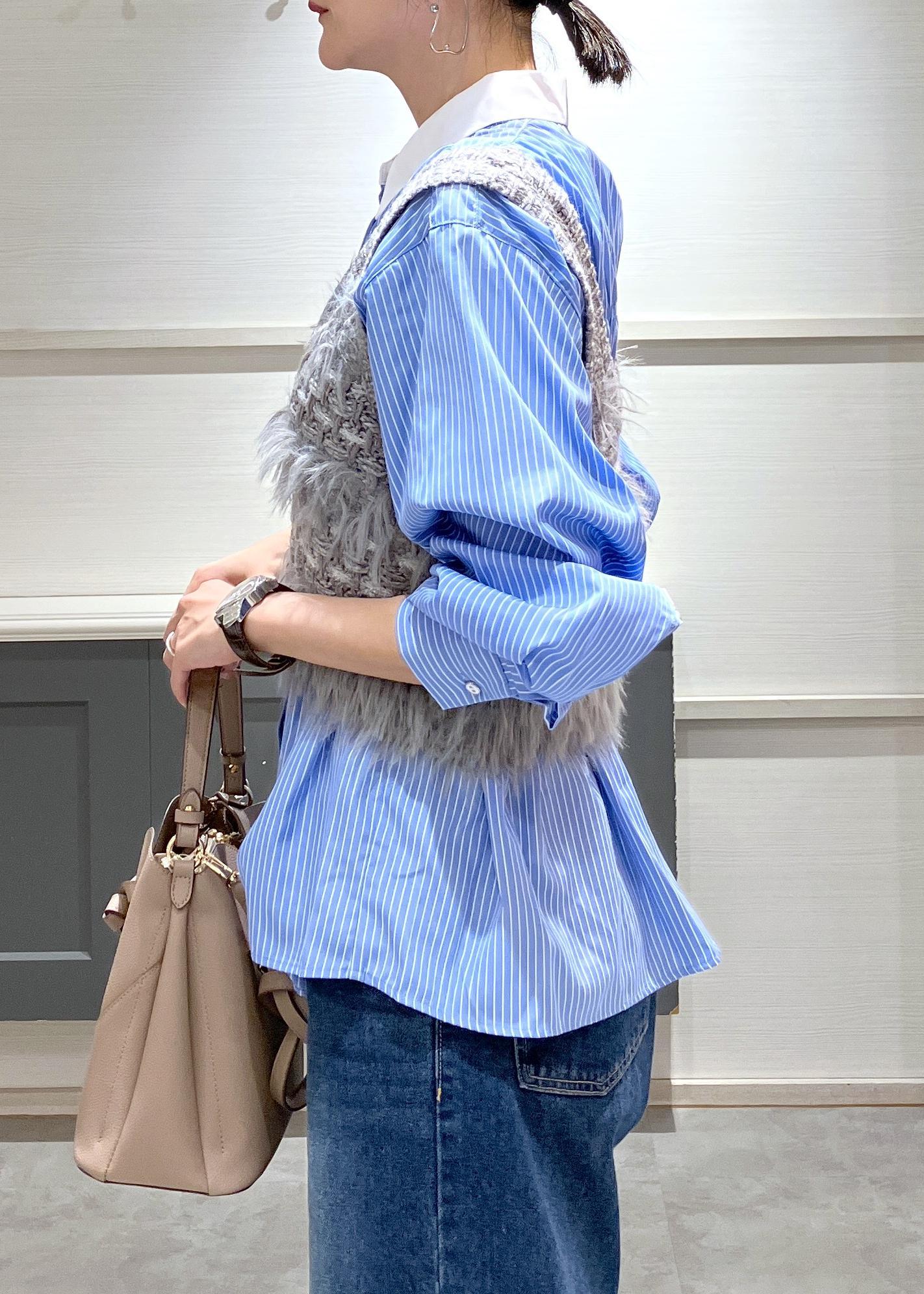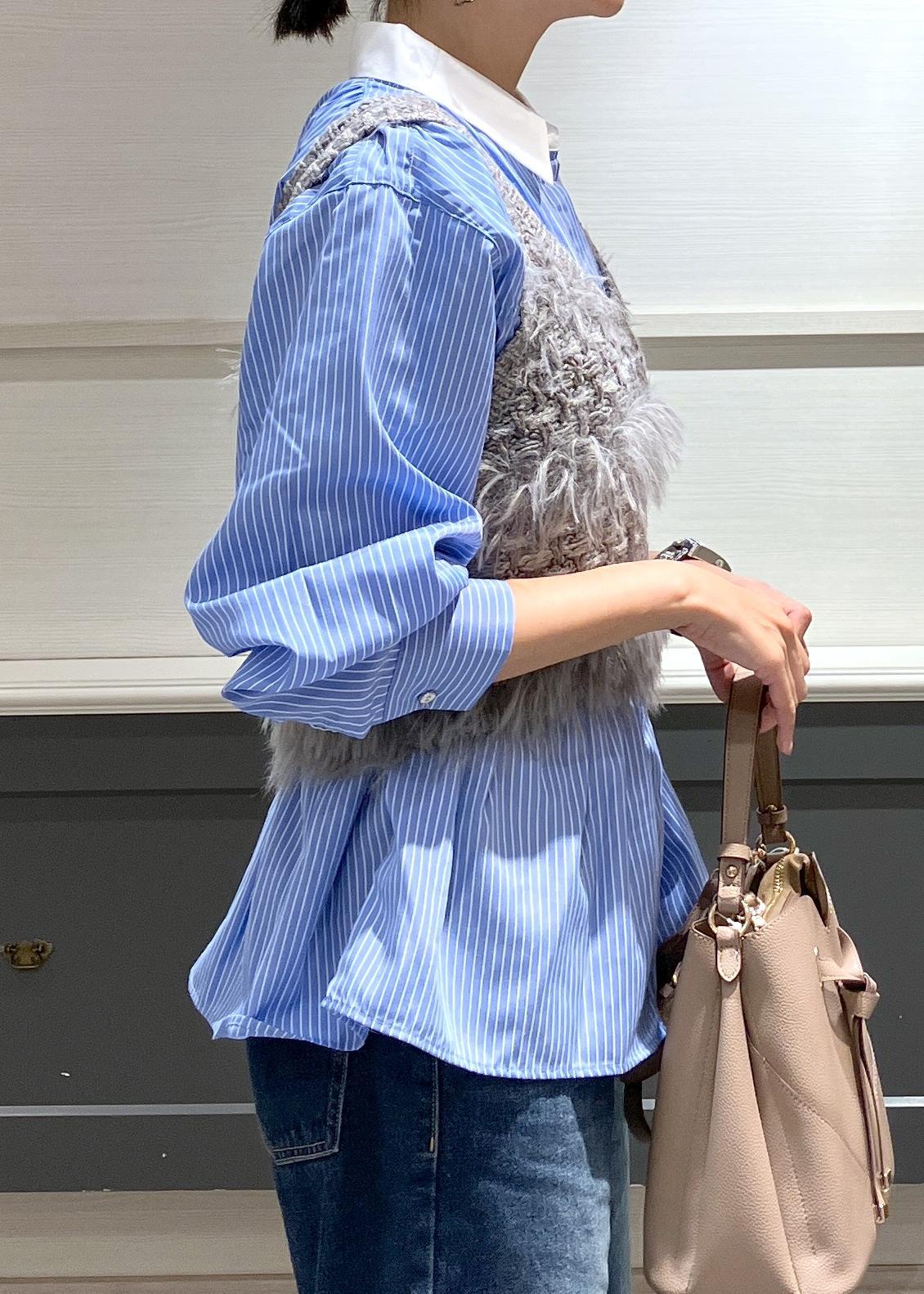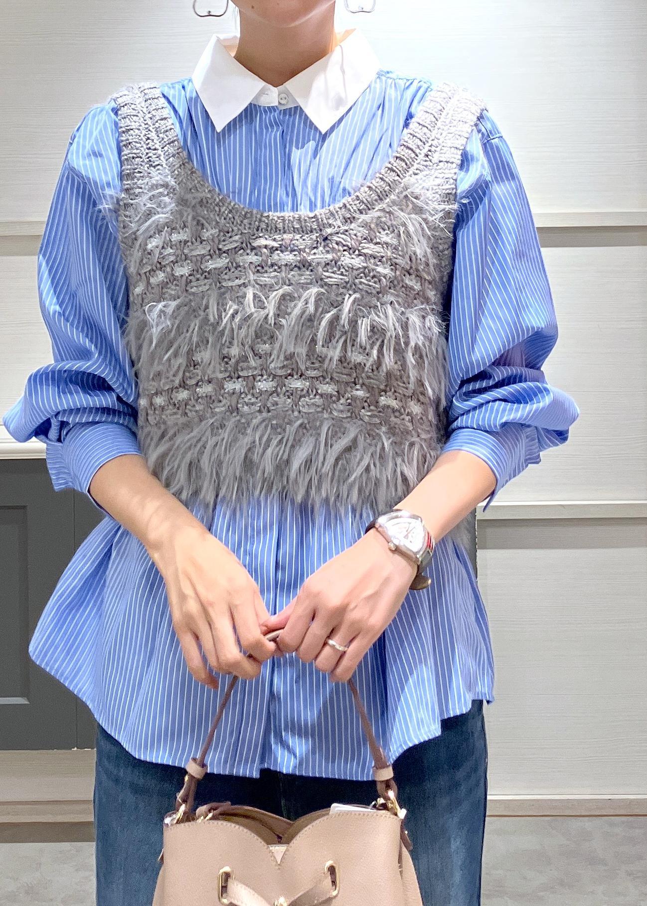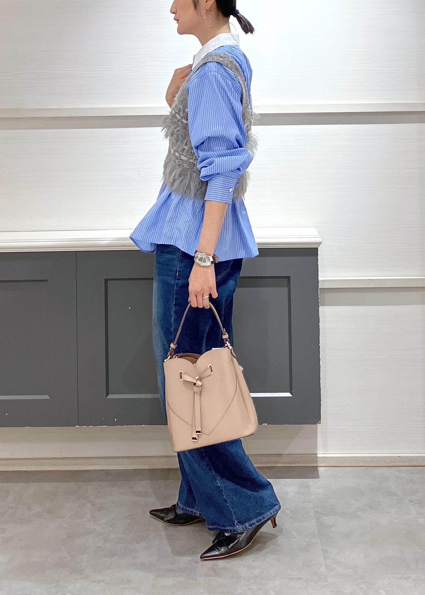 ブラウスとデニムのブルーのワントーンに今年トレンドのフリンジビスチェを合わせました♩