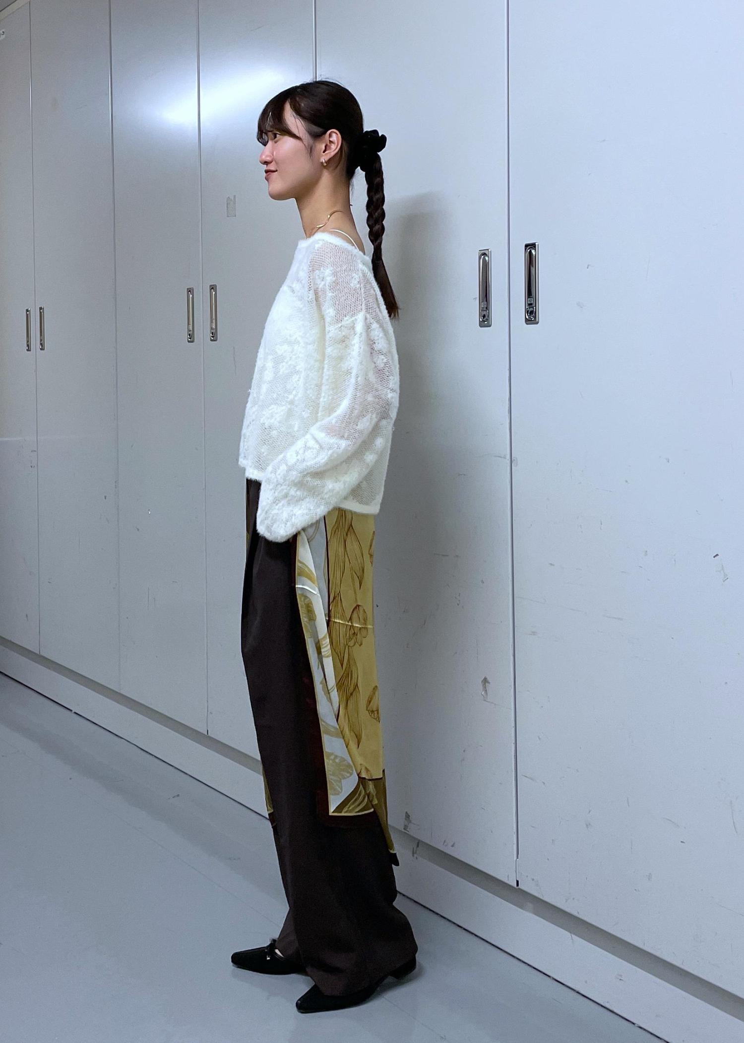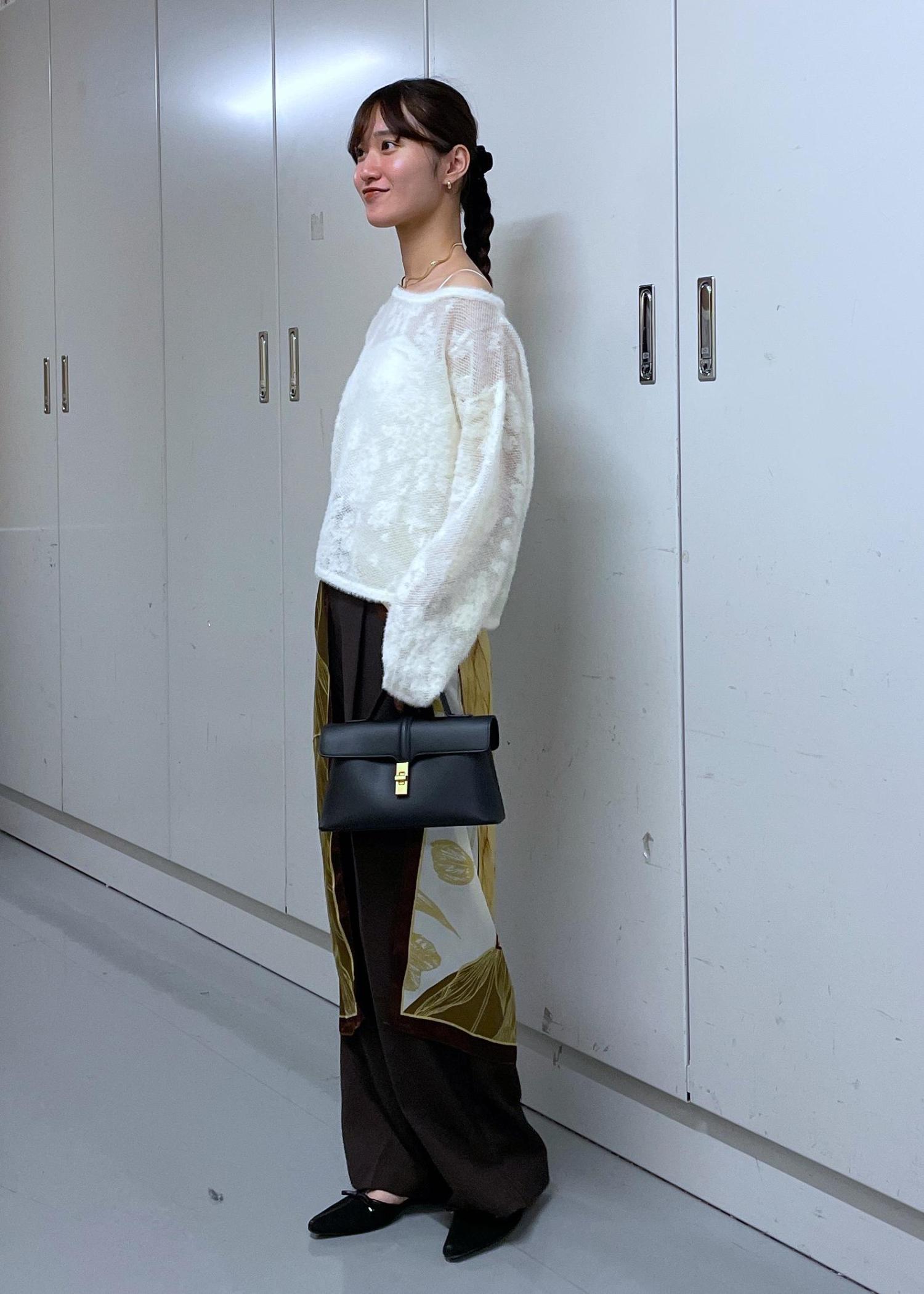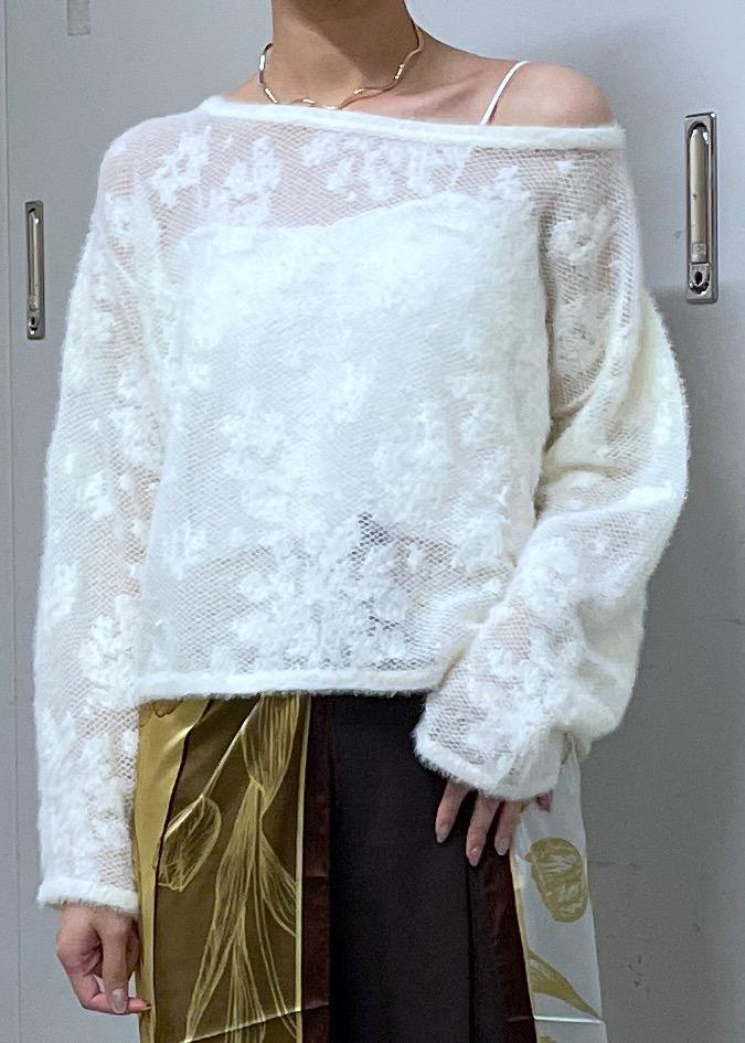 VISフラワーモチーフフェザーシアーニットオフホワイト / F¥3,842レビュー167cm骨格ウェーブの私だと袖の長さが手首ぐらいの長さでした。上半身が厚みがない方なのでワンショルにでき可愛かったです◎