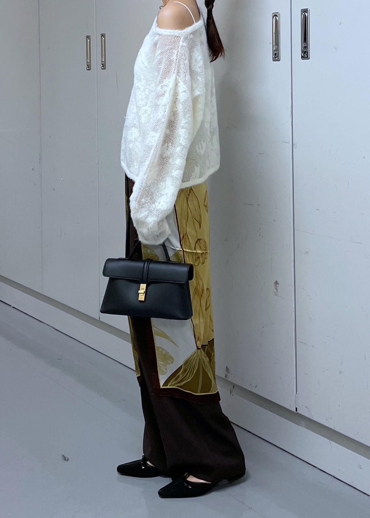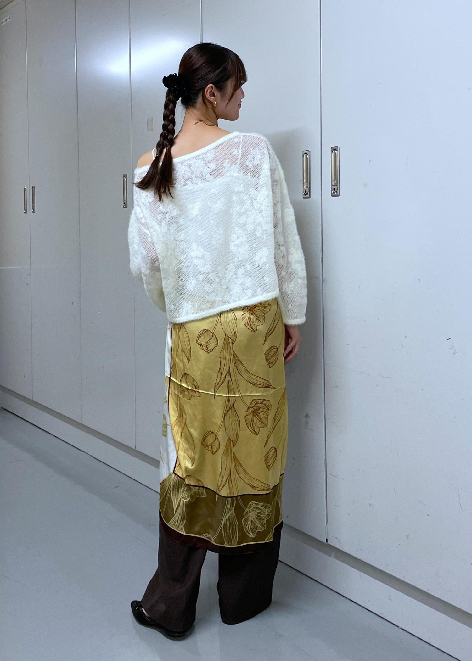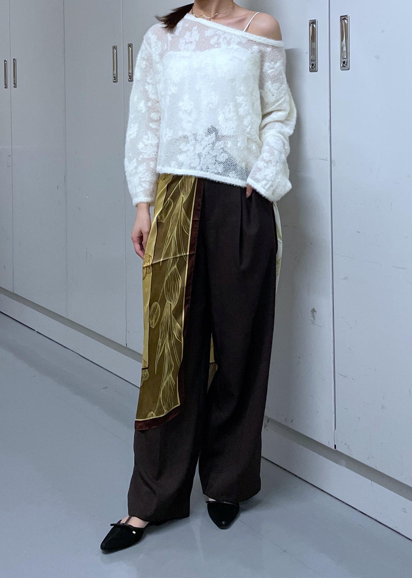 VISフラワーモチーフフェザーシアーニットオフホワイト / F¥3,842レビュー167cm骨格ウェーブの私だと袖の長さが手首ぐらいの長さでした。上半身が厚みがない方なのでワンショルにでき可愛かったです◎