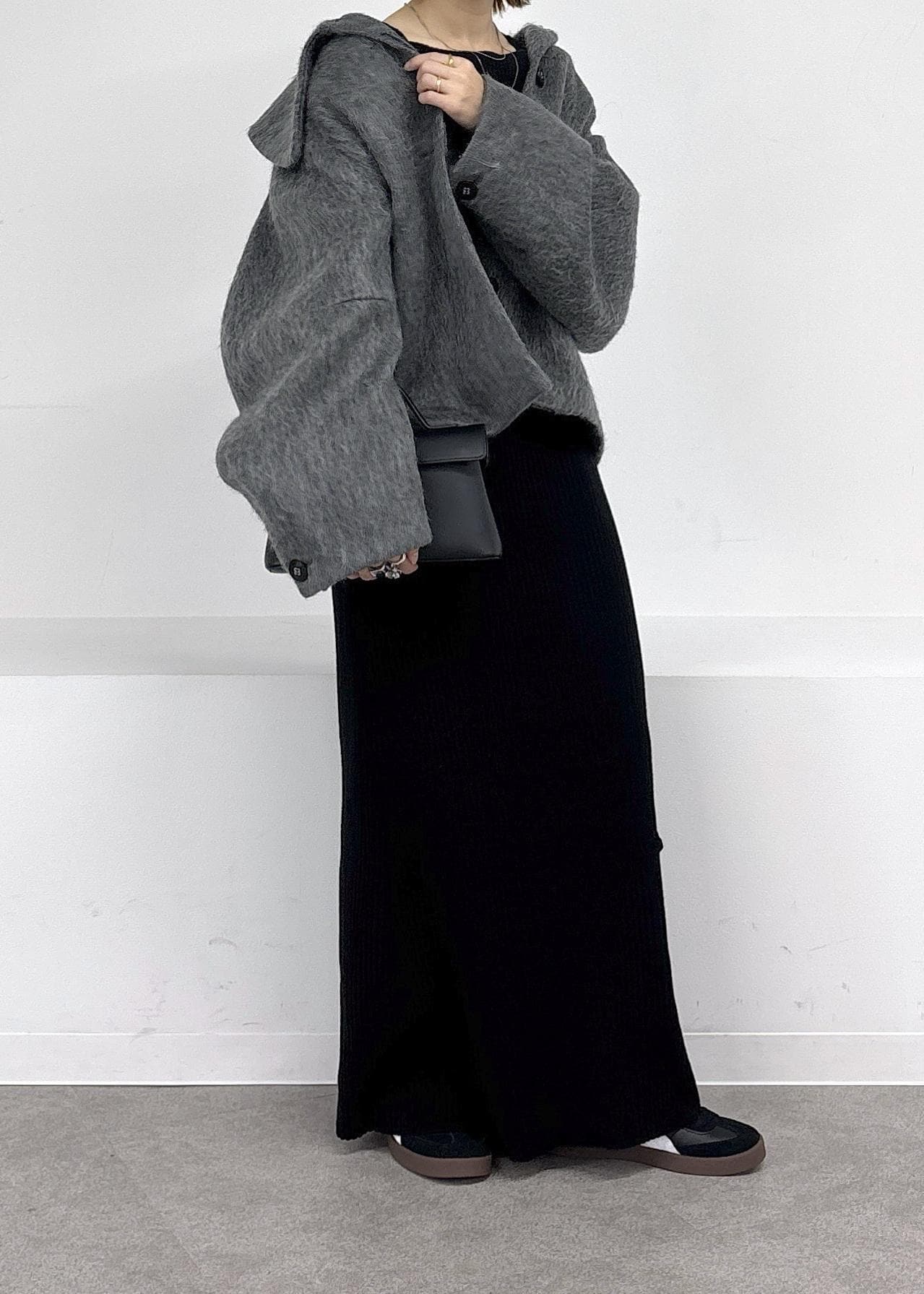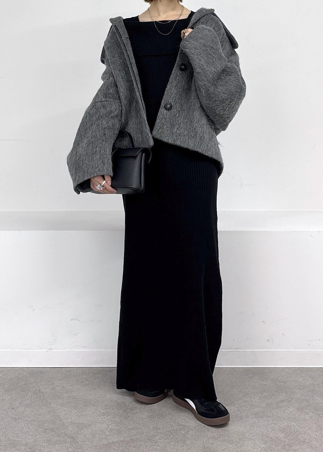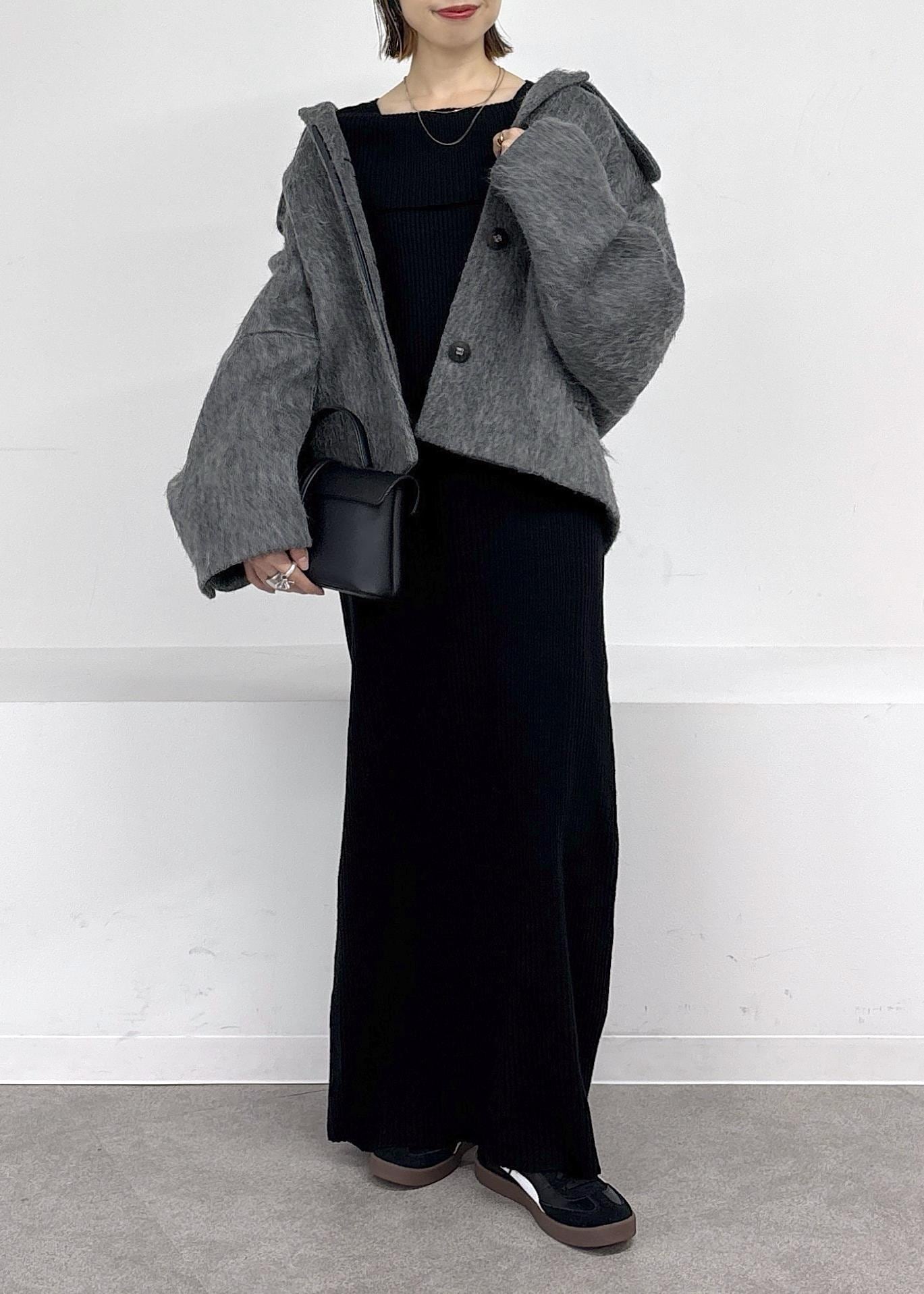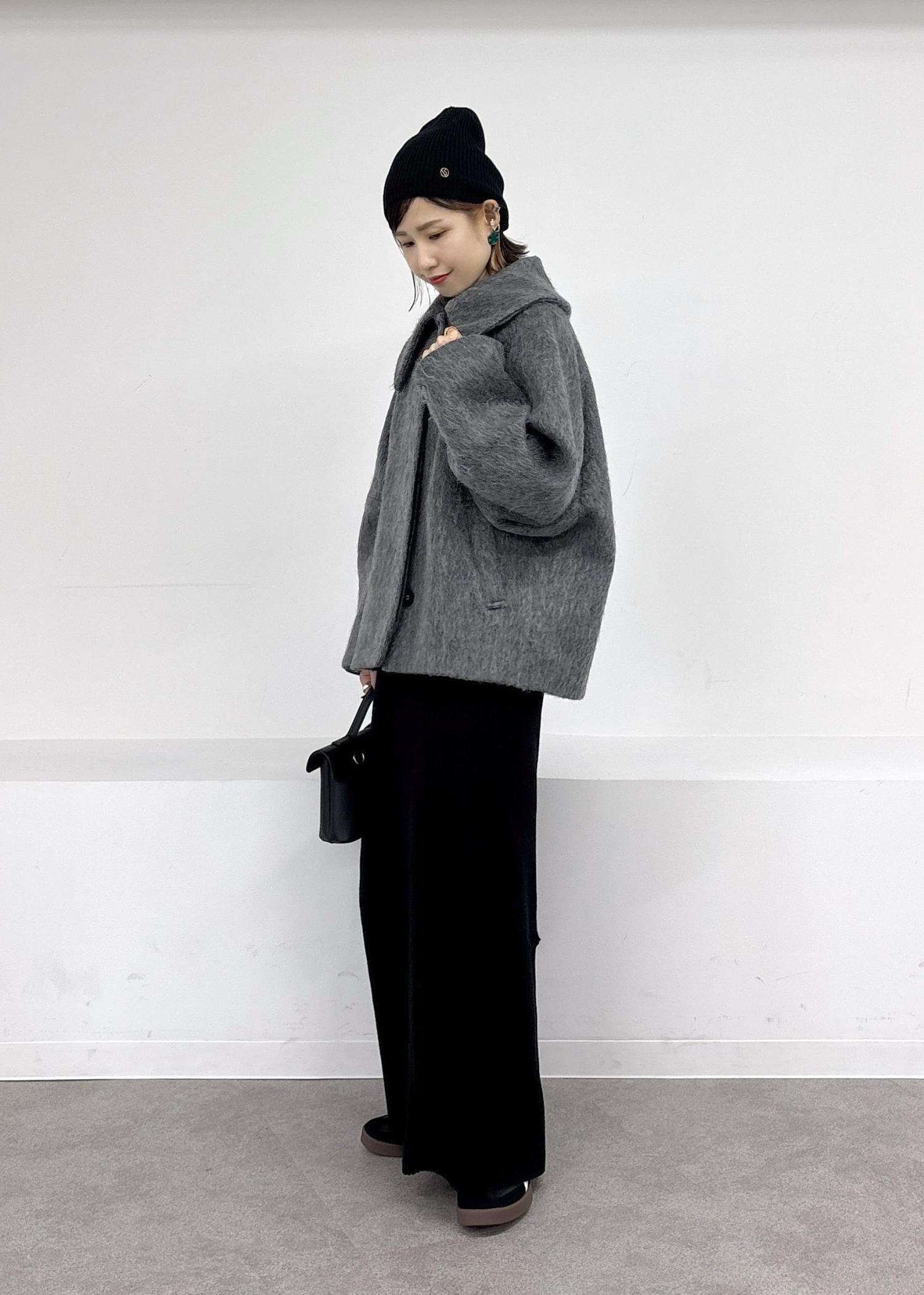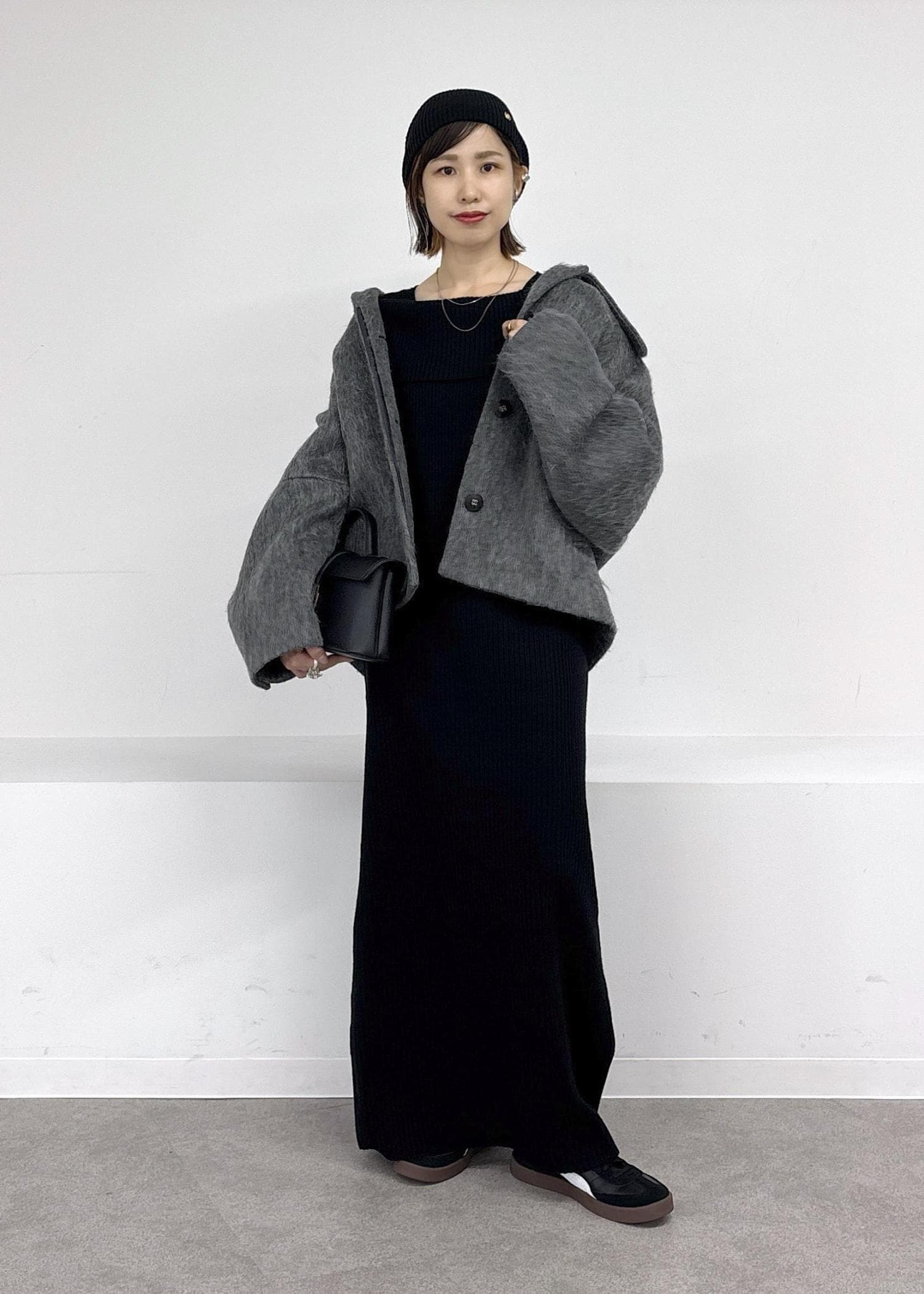 ビックカラーが大人可愛いショートコートが今年は可愛い♪たぽっとした緩やかシルエットにVISで大好評のオフショルデザインのワンピで女性らしく、甘くなり過ぎないようスニーカーとビーニーでラフさをプラスしました◎モノトーンでシンプルつつ、季節の素材が引き立つ冬おすすめの大人カジュアルコーデ。